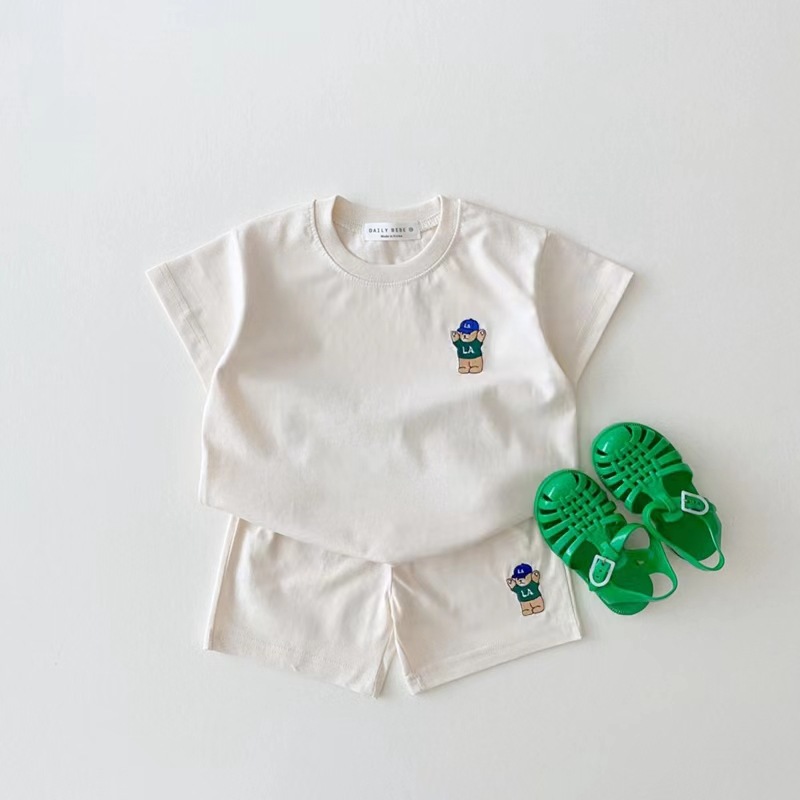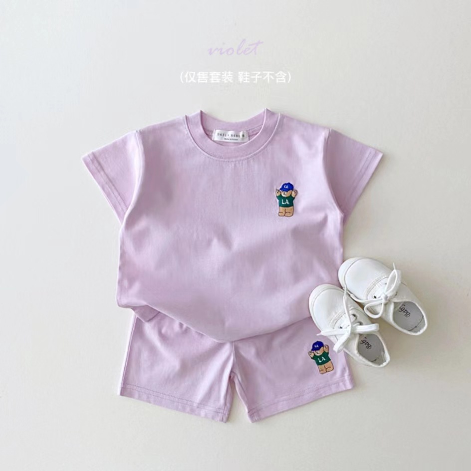 한국 스타일 아동복 소년 소녀, 중대형 어린이 순면 아동 캐주얼 곰 반팔 정장 여름 얇은 느슨한