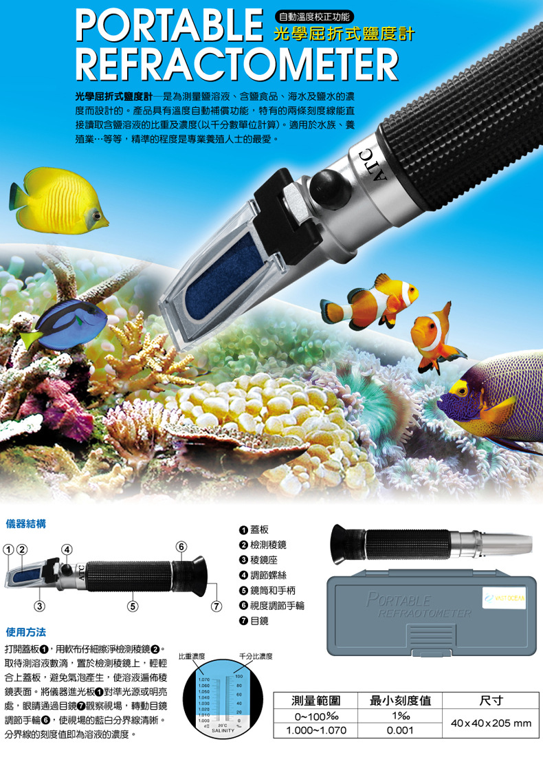 • 광학 염분 측정기 0-10 ‰ 알루미늄 코어 (ATC 온도 보상)