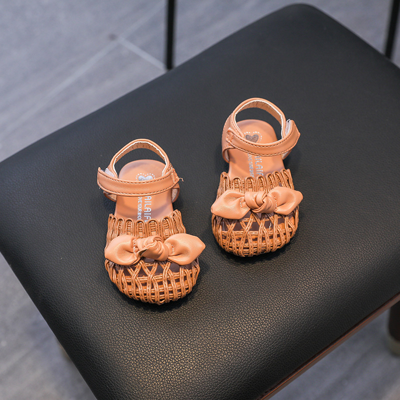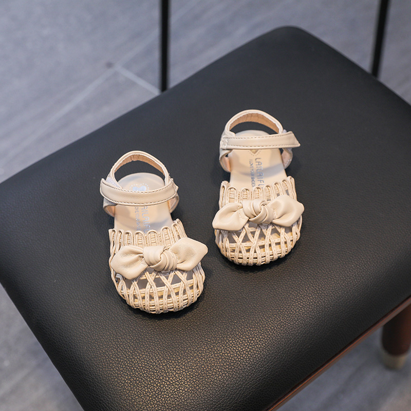 여아 샌들 여름 2023 어린 소녀 어린이를위한 새로운 짠 목가적 인 신발 한국식 아기 비치 신발 부드러운 밑창