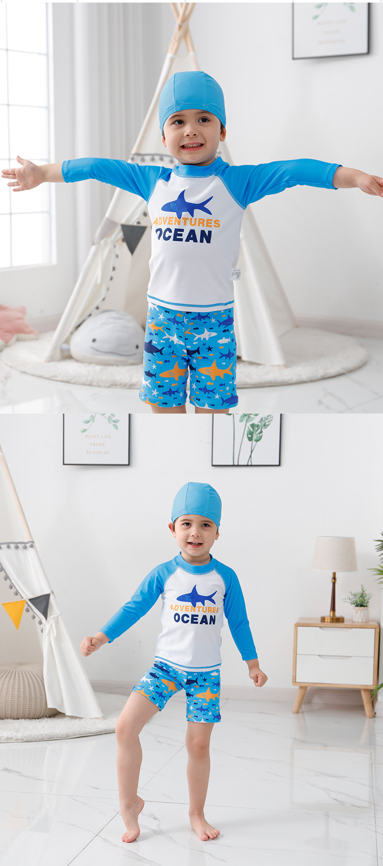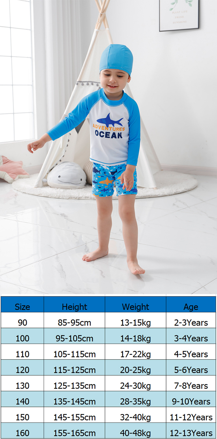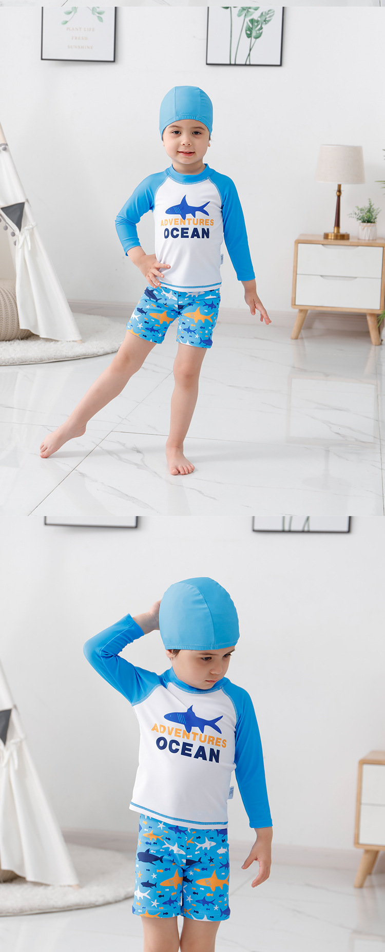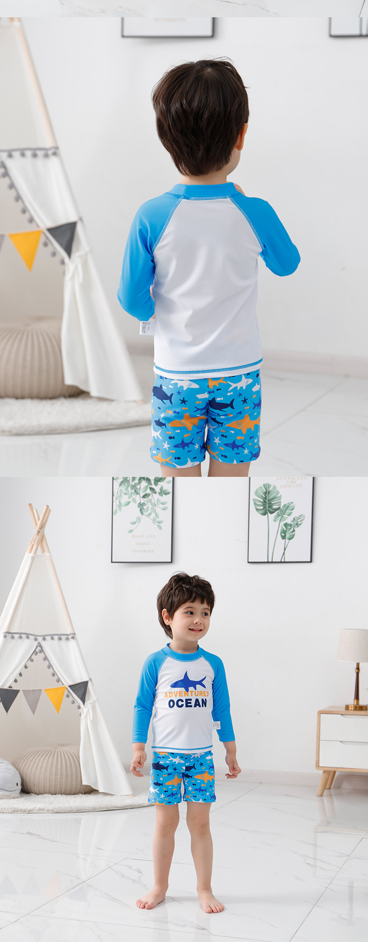 크로스보더 남아용 분리형 수영복 만화 상어 3피스 세트 어린이 해변 서핑복 남아 수영복 스포츠 스타일