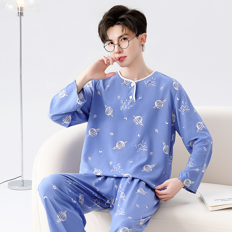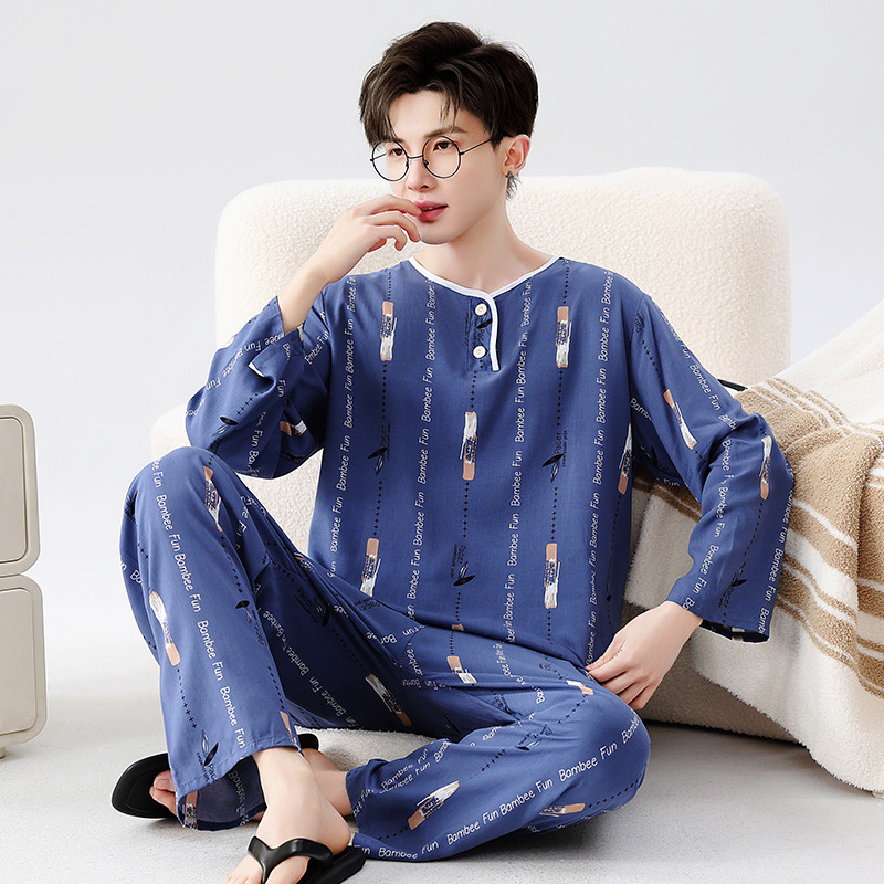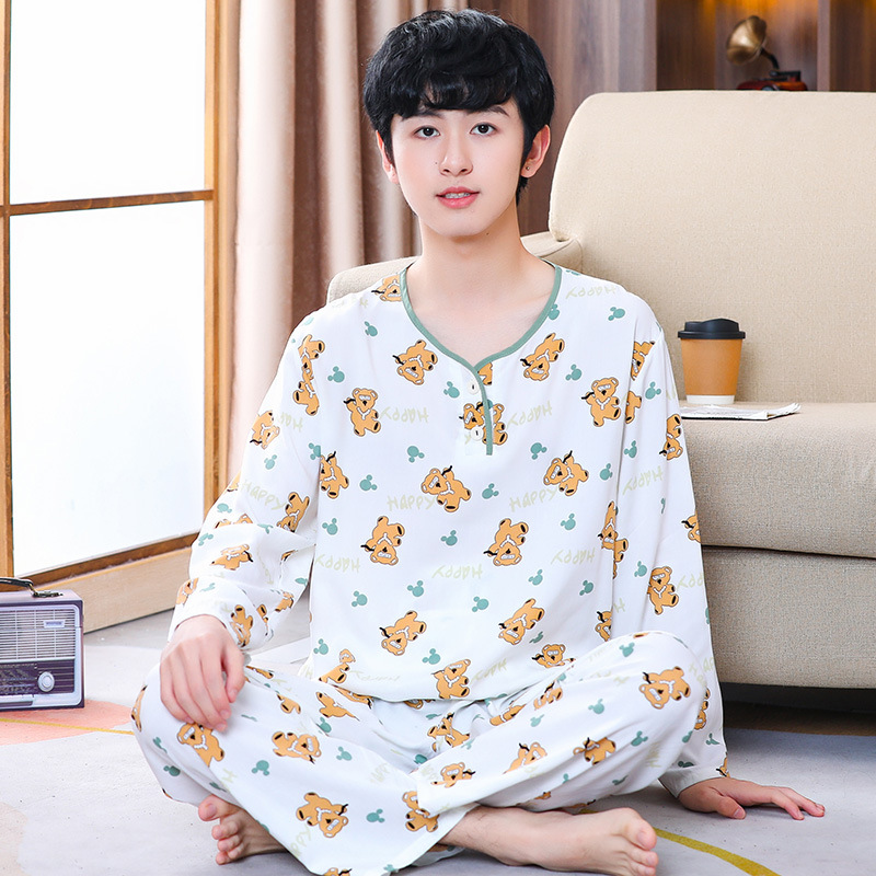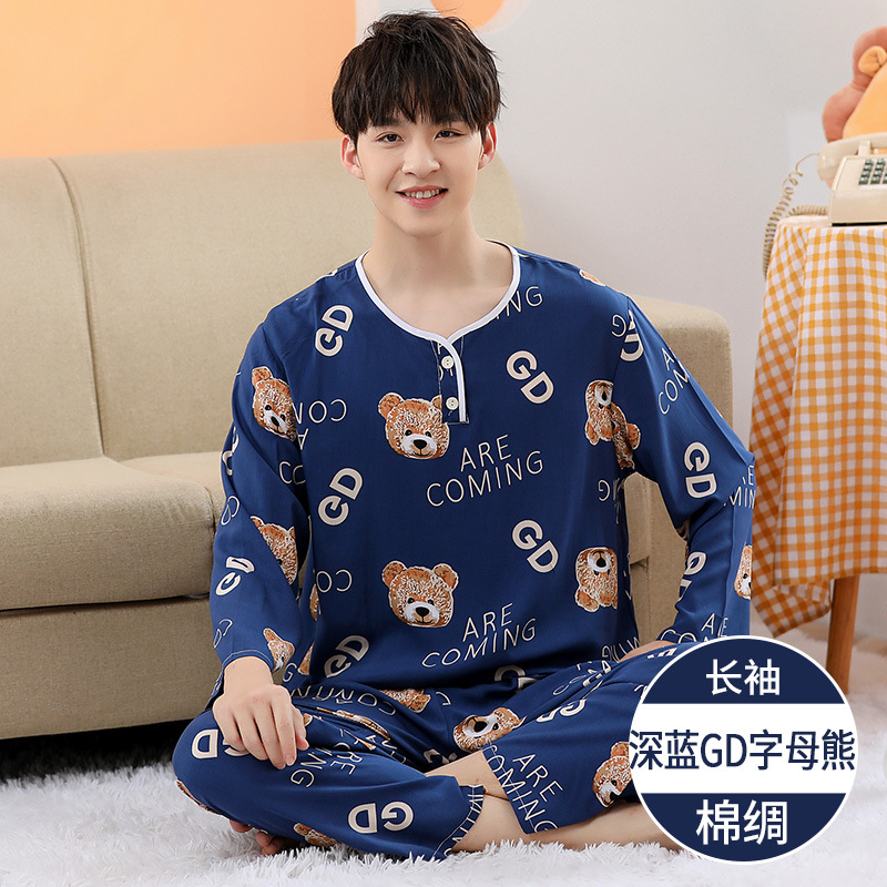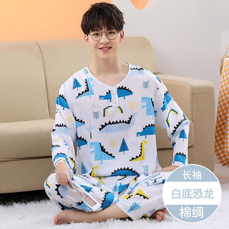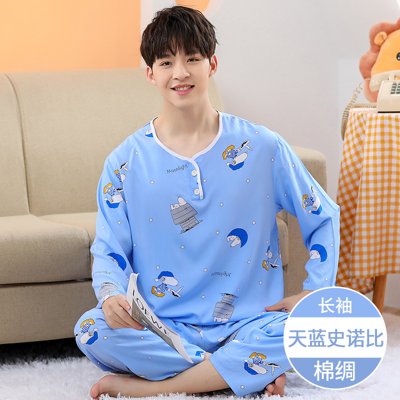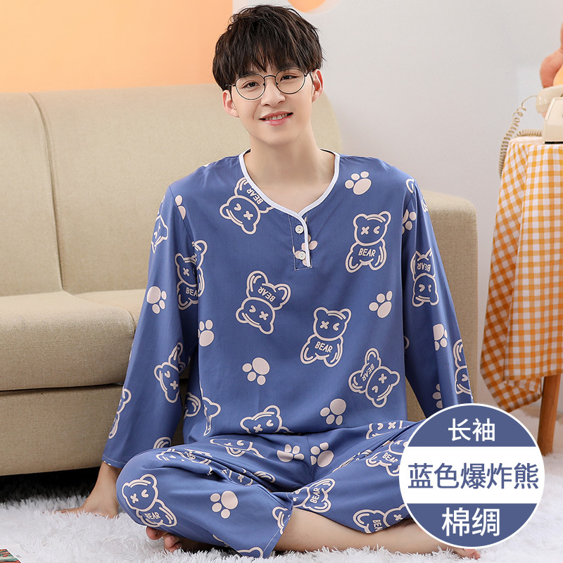 여름 십대 면 실크 잠옷 세트 면 실크 에어컨 가정 옷 얇은 긴 소매 바지 큰 아이와 중학생 남자스토어 가기