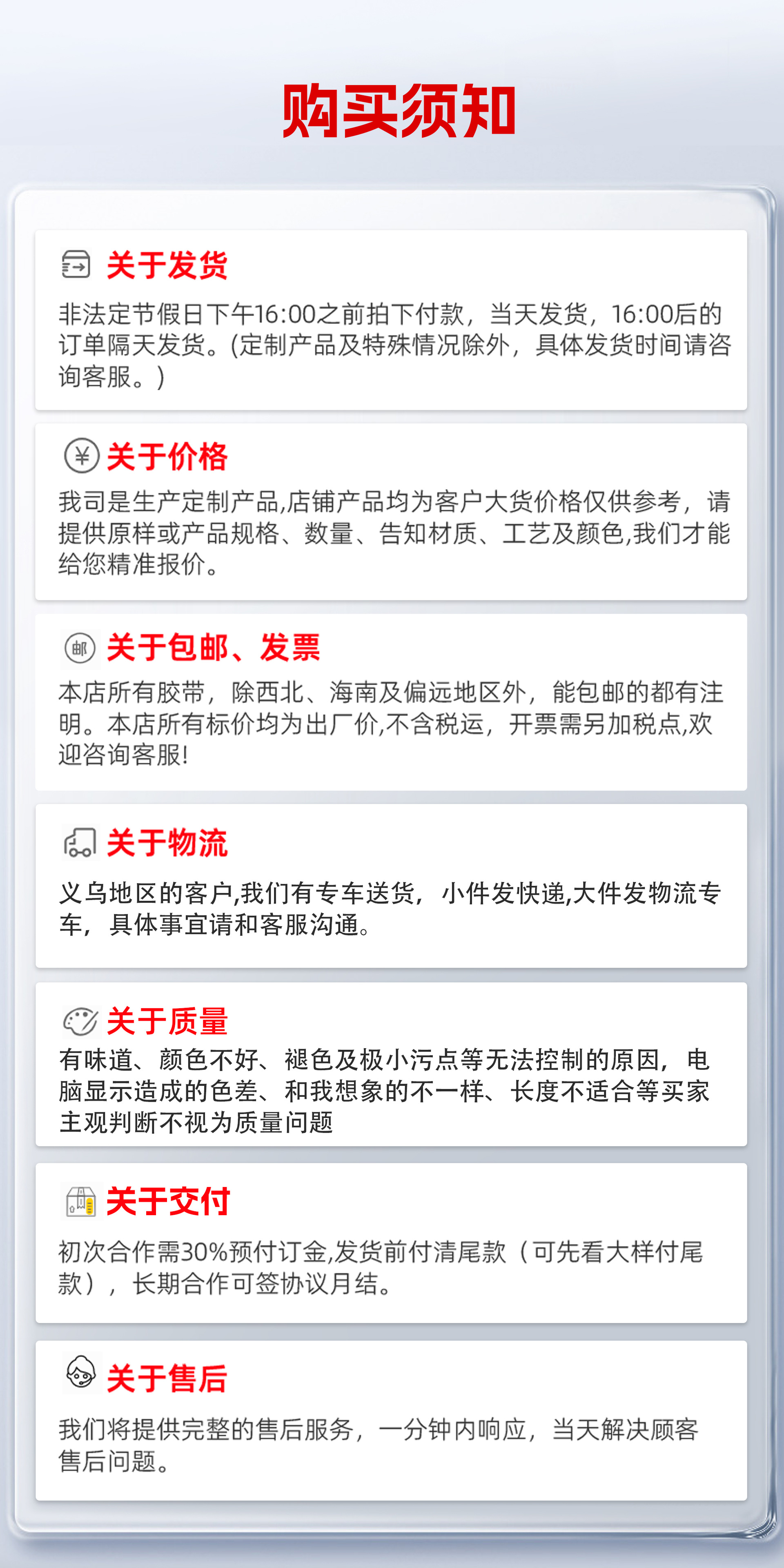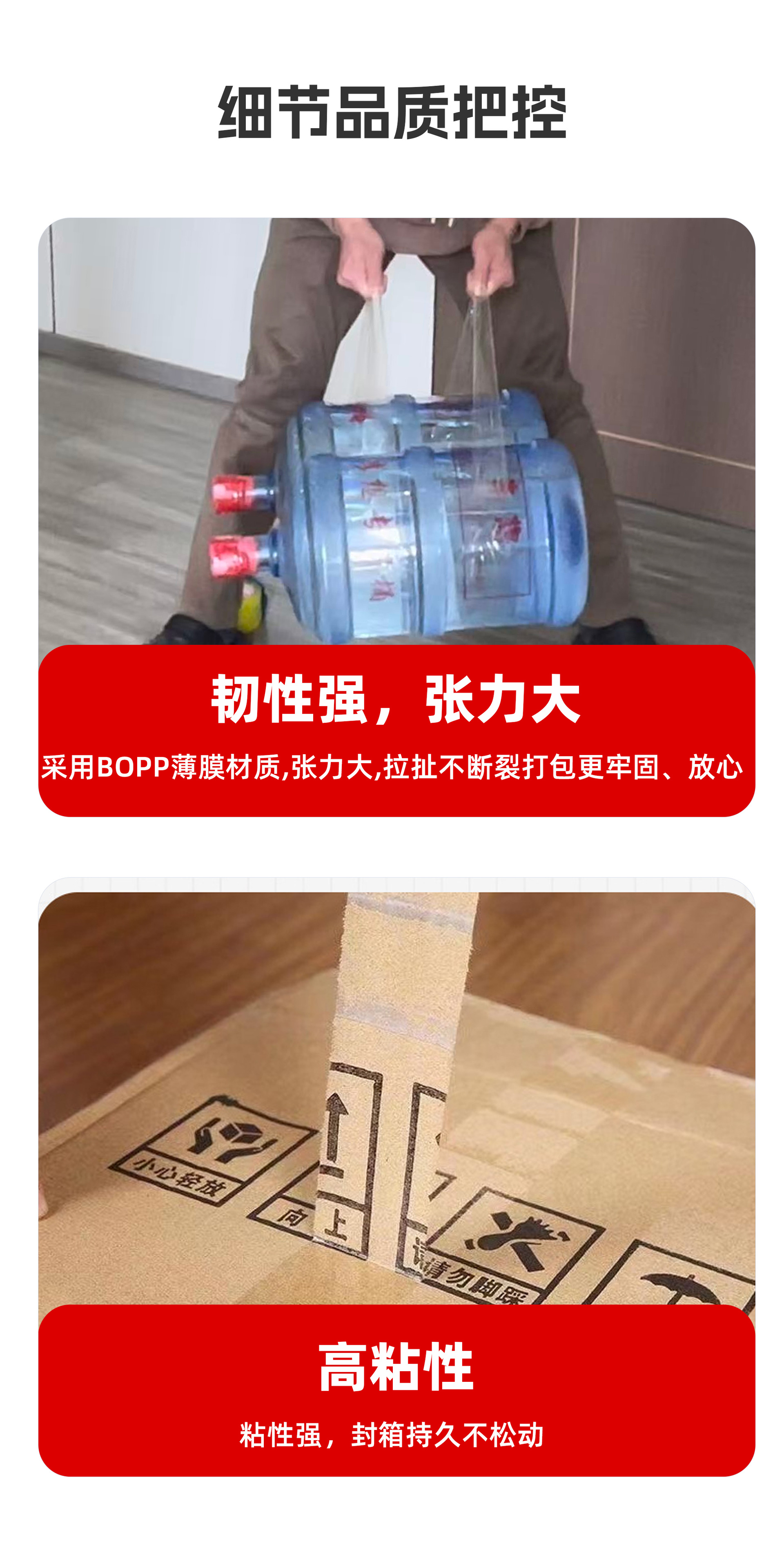 • 흰색 바탕에 빨간색 글씨 (타오바오 인쇄); 폭 4.8cm, 두께 2.5mm, 길이 150m [36롤 한 박스]
