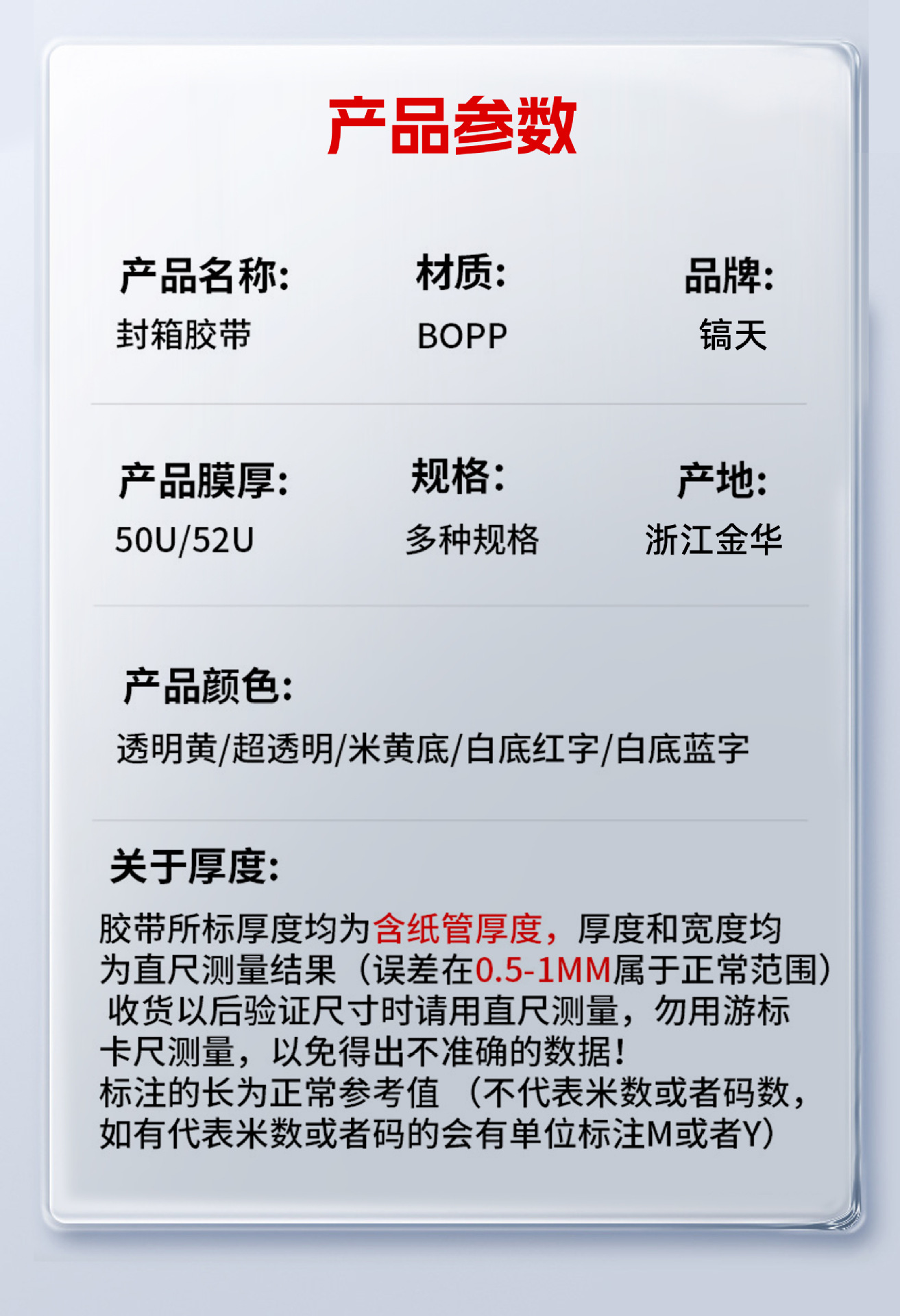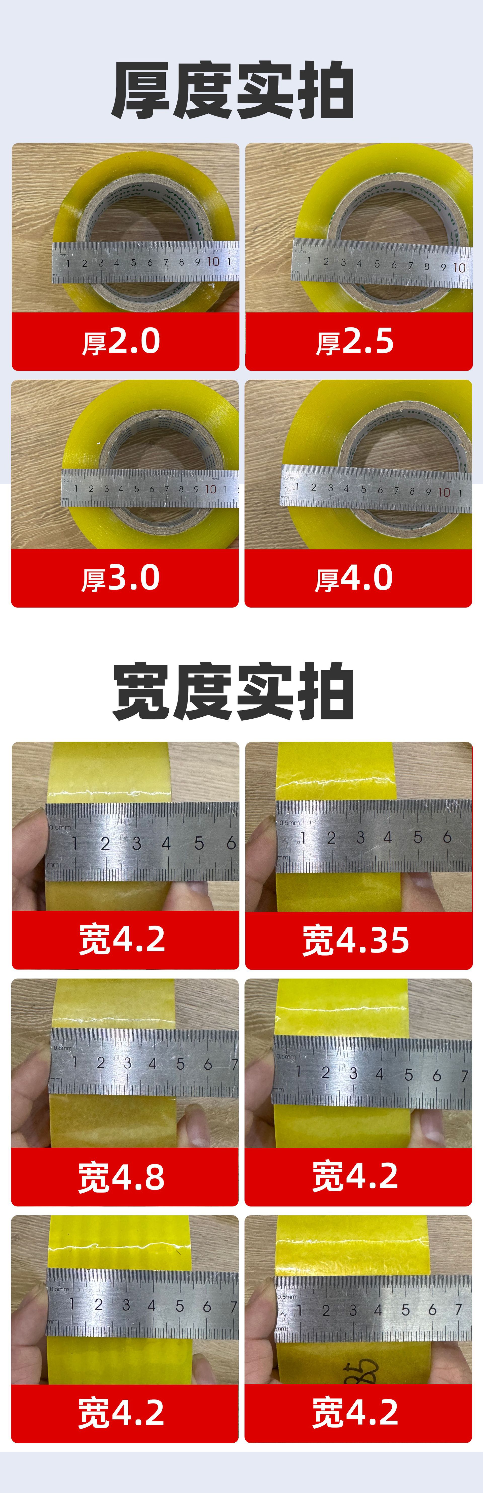 此链接胶带所标厚度均为含纸管厚度,厚度和宽度均为直尺测量结果(误差在0.5-1mm属于正常范围) 收货以后验证尺寸时请用直尺测量,勿用游标卡尺测量,以免得出不准确的数据!标注的长为正常参考值 (不代表米数或者码数,如有代表米数或者码的会有单位标注M或者Y
