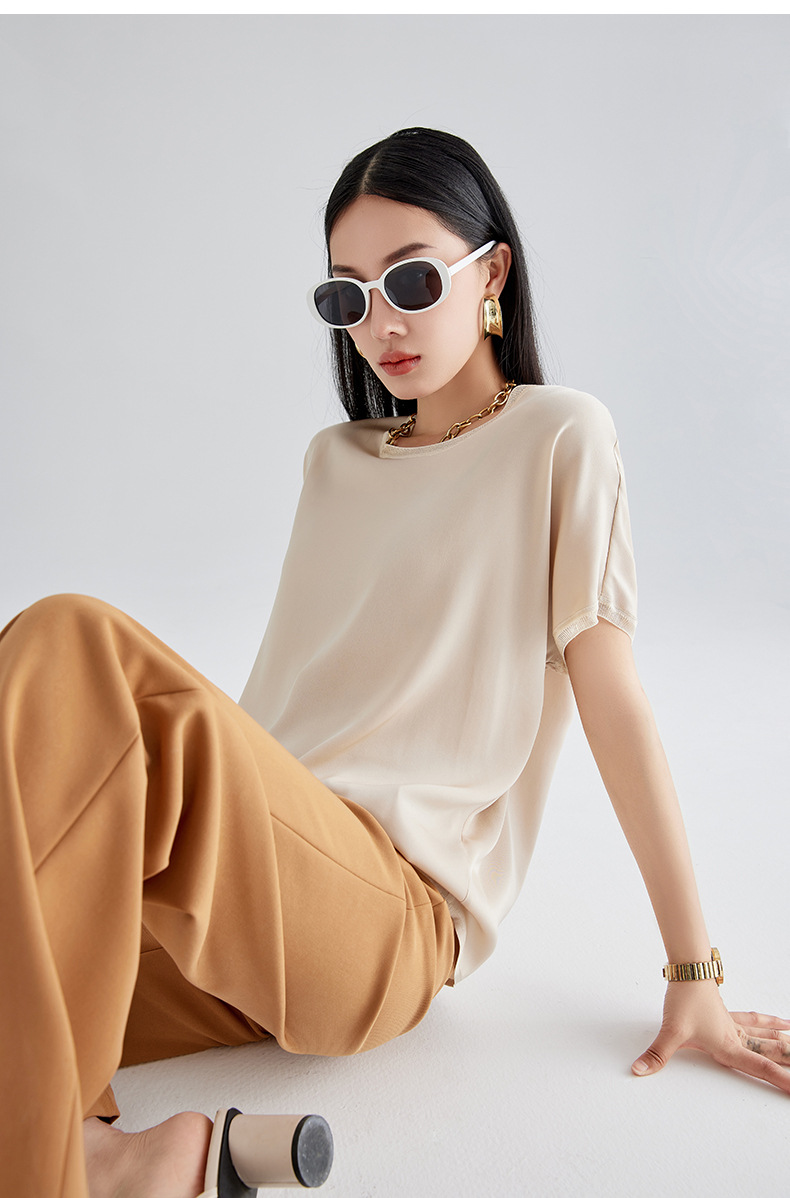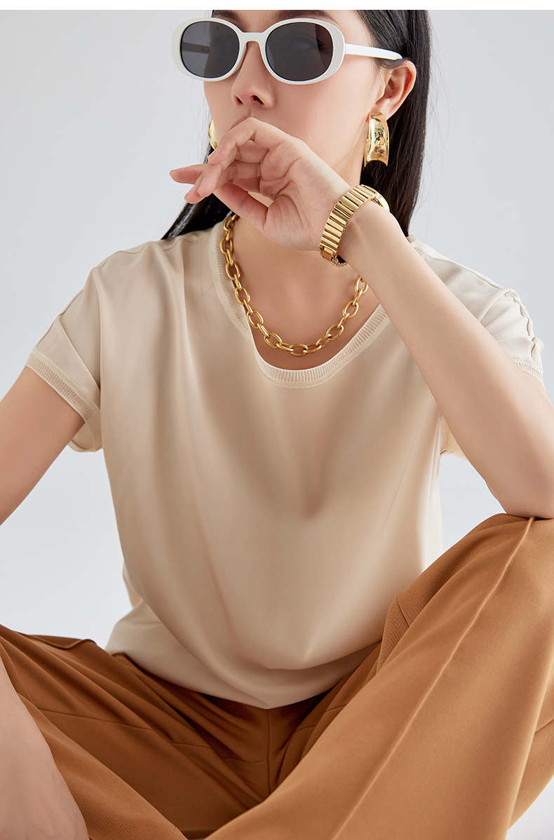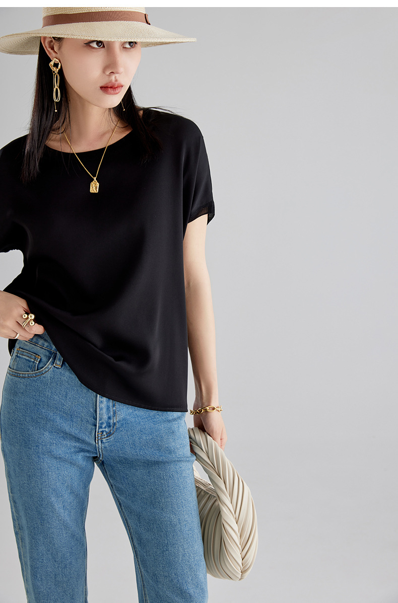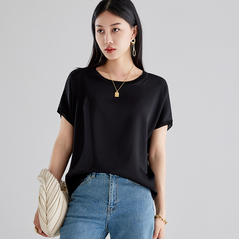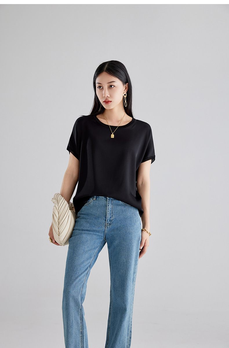 여성용 실크 반팔 티셔츠, 멀버리 실크 새틴 라운드넥 탑, 2025 루즈핏 캐주얼 실크 베이스 레이어, 캐주얼하고 다용도로 활용 가능스토어 가기