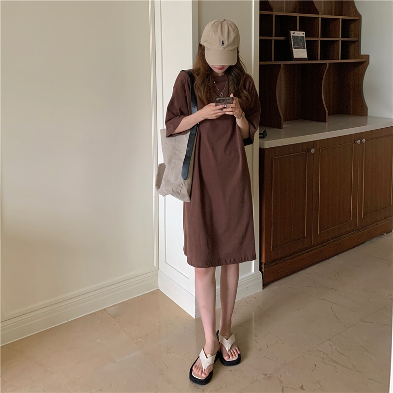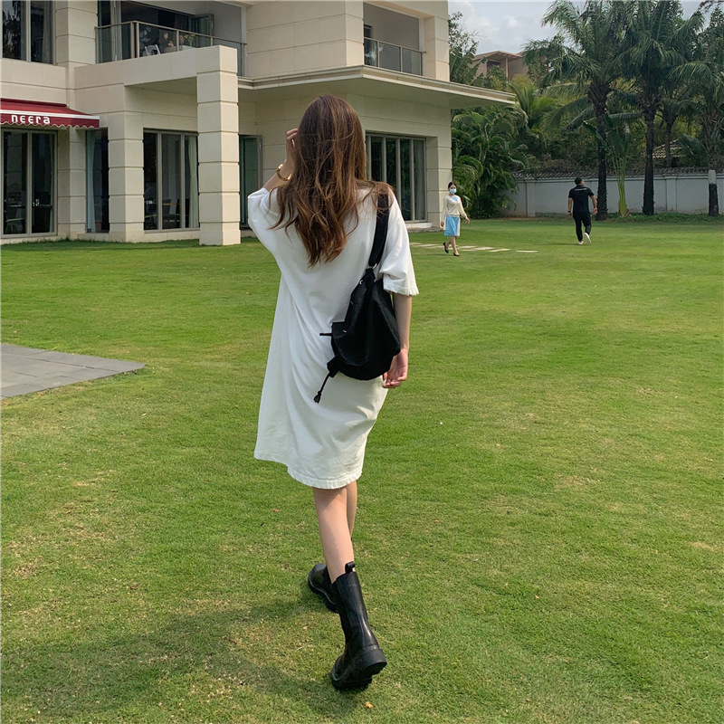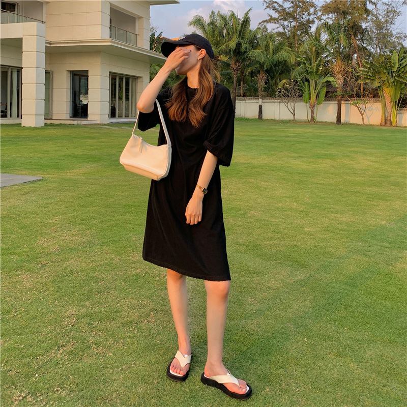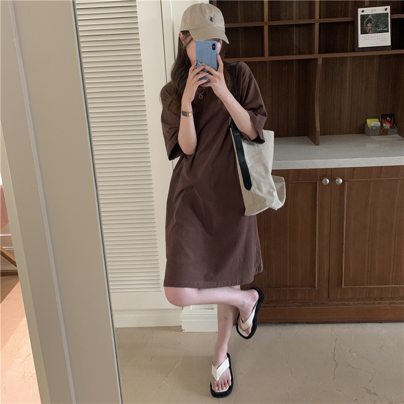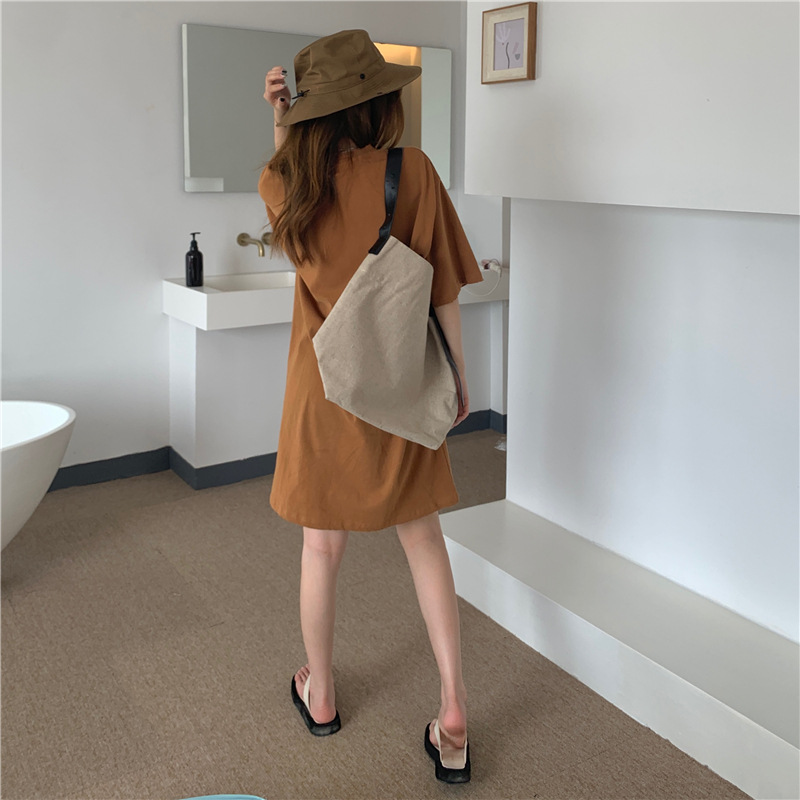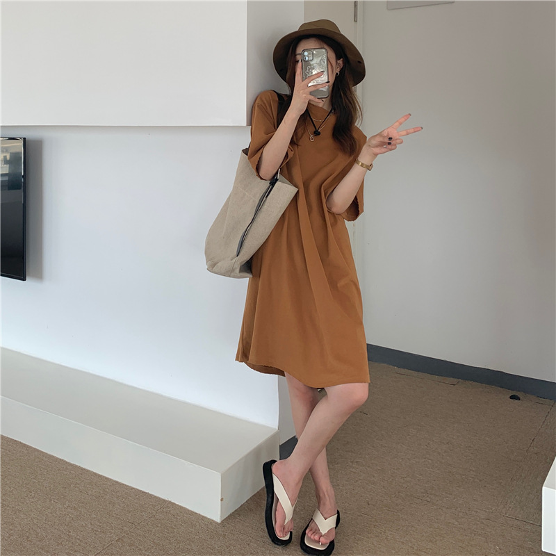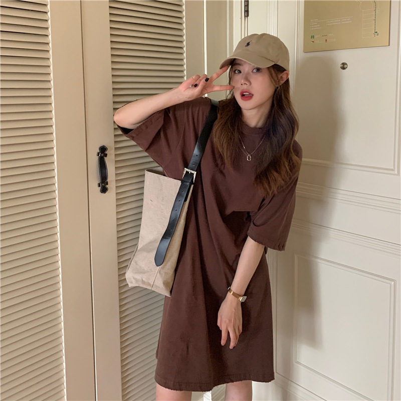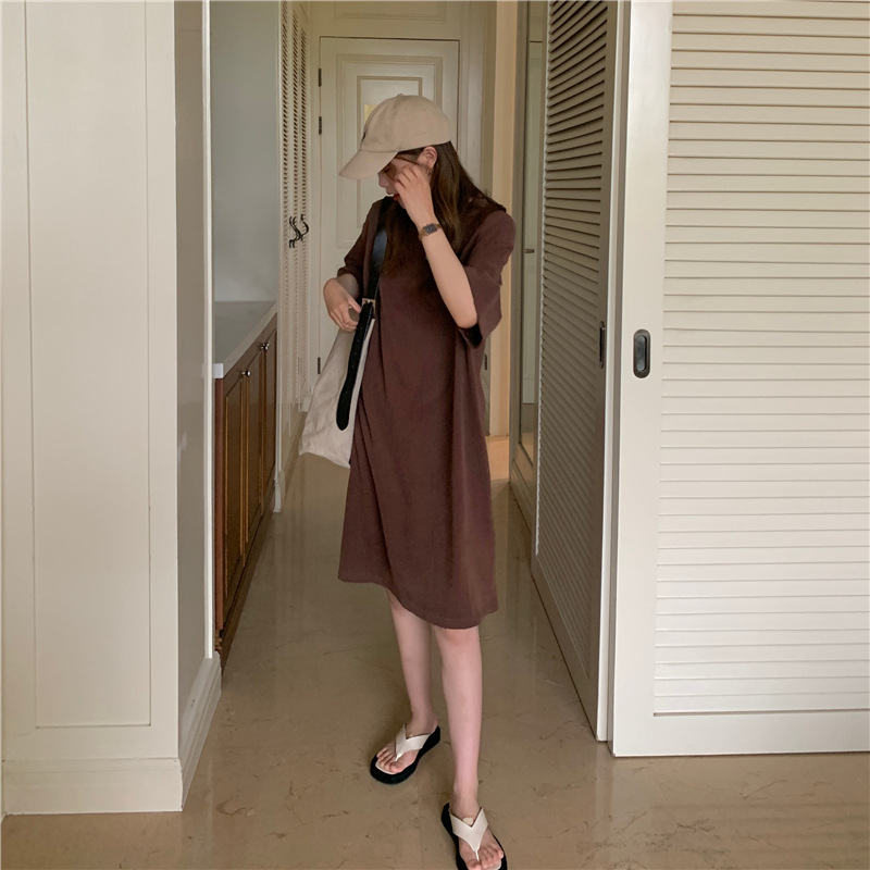 2022 여름 새로운 한국 스타일 면 숄더 백 칼라 원피스 여성용 느슨한 중간 길이 반팔 티셔츠 원피스스토어 가기