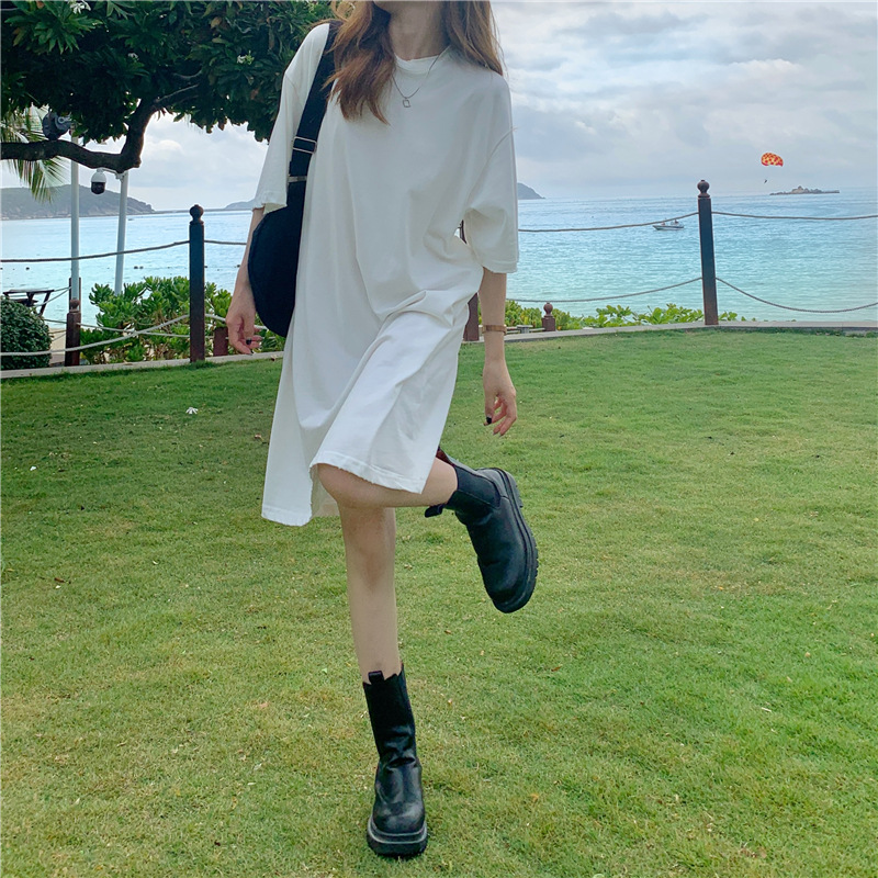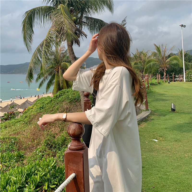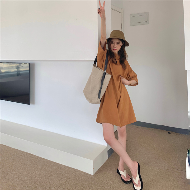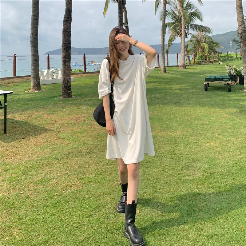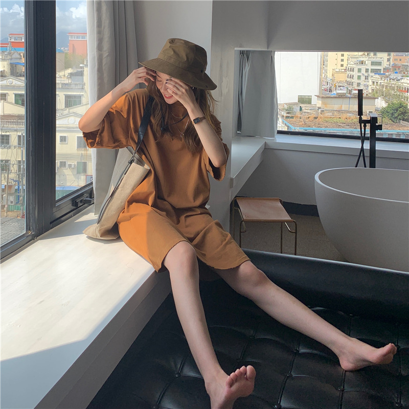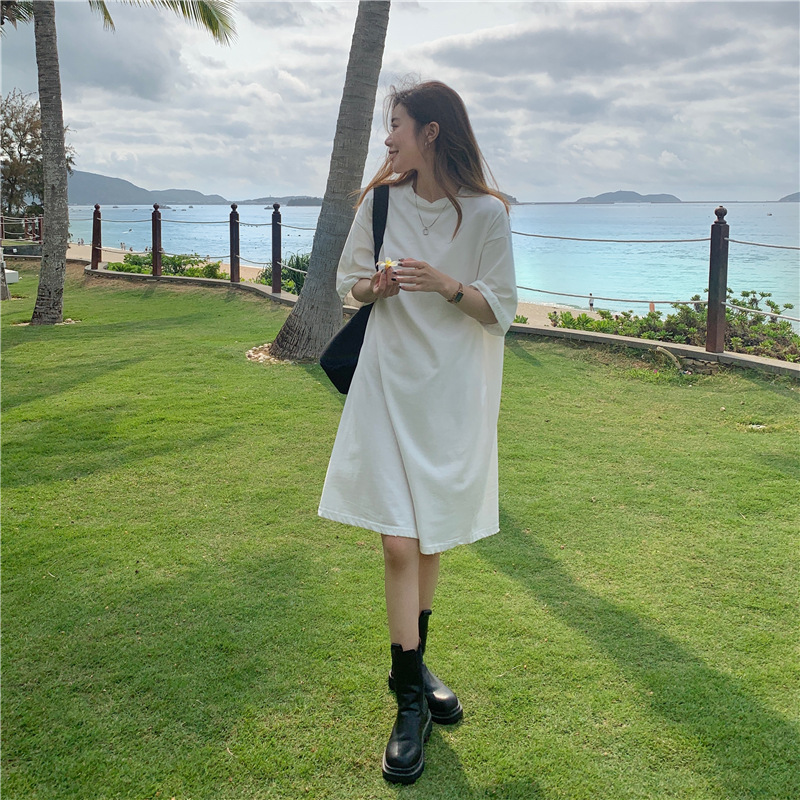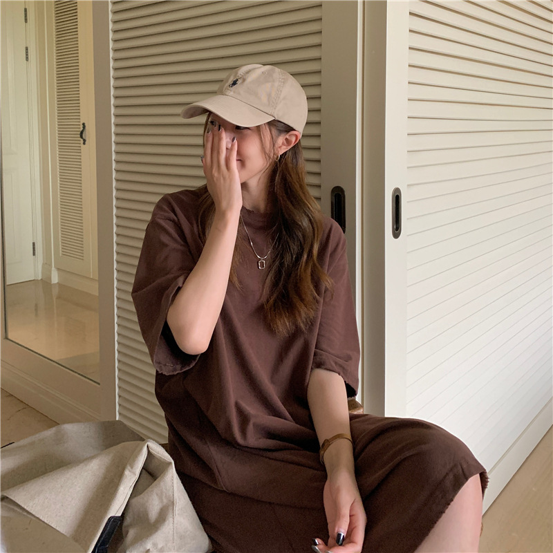 2022 여름 새로운 한국 스타일 면 숄더 백 칼라 원피스 여성용 느슨한 중간 길이 반팔 티셔츠 원피스스토어 가기