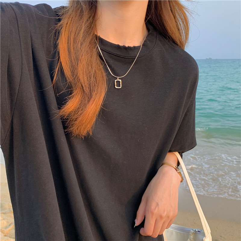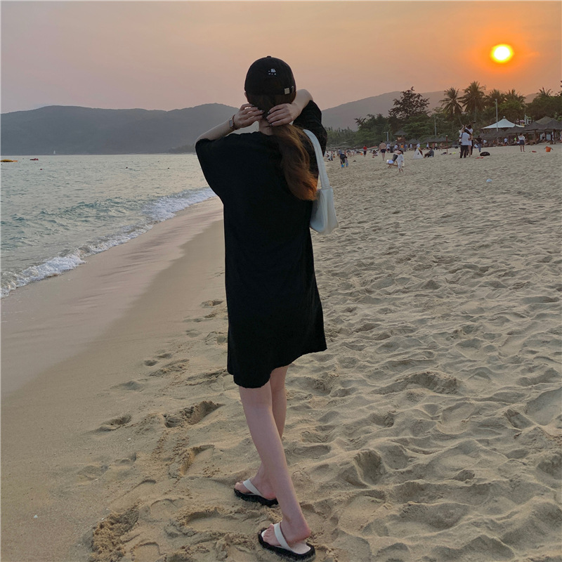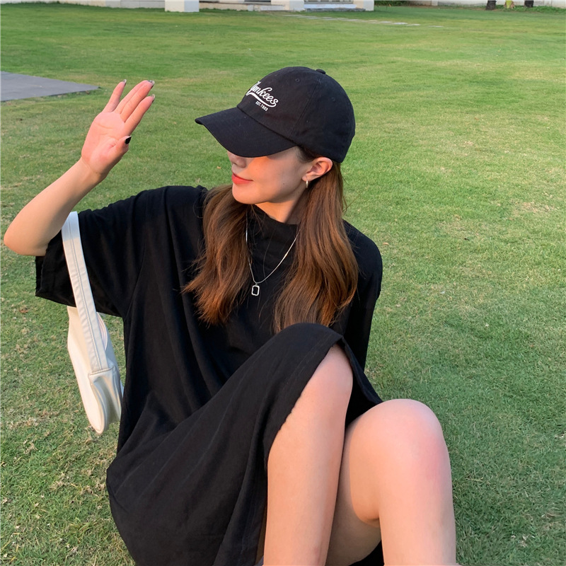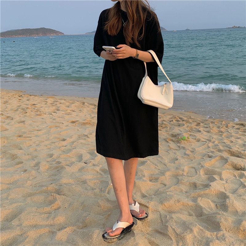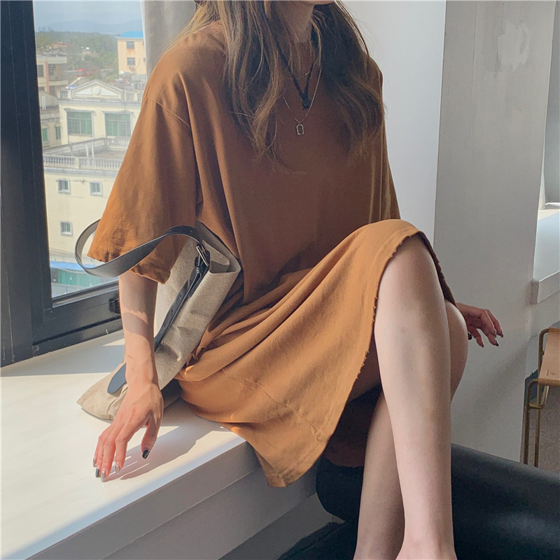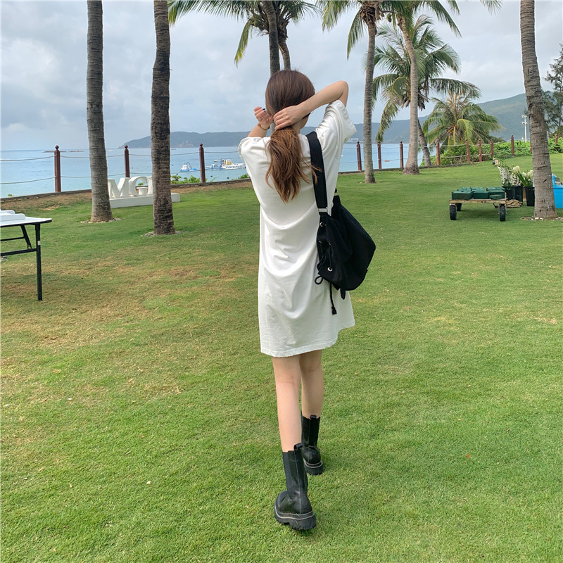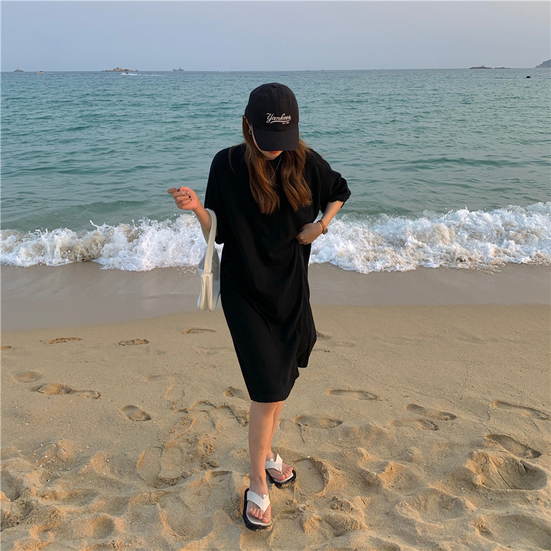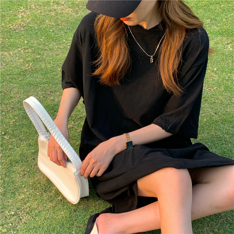 2022 여름 새로운 한국 스타일 면 숄더 백 칼라 원피스 여성용 느슨한 중간 길이 반팔 티셔츠 원피스스토어 가기