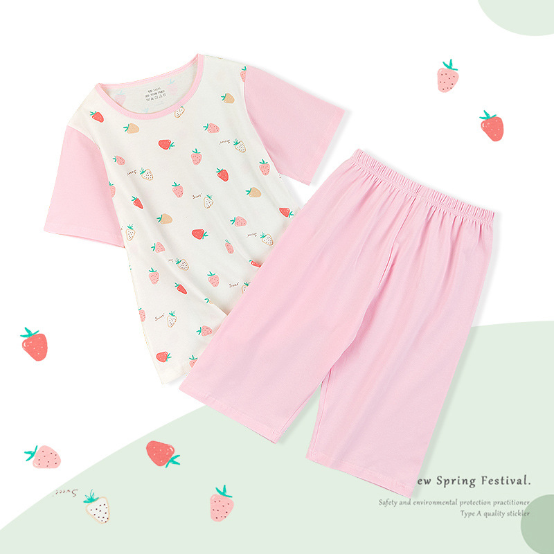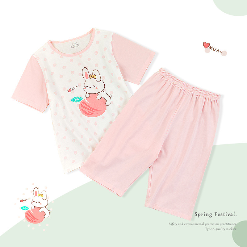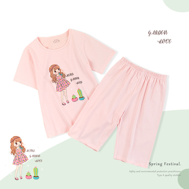 여아 잠옷 여름용 얇은 반팔 순면 부모-자녀 세트 13세 여아 중년 이상 어린이 홈웨어 세트 귀여운