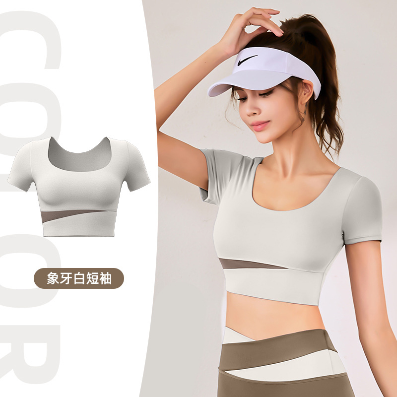 가슴 패드가 있는 컬러 블록 요가 반팔, 누드 슬림 요가복, 여성용 런닝 스포츠 피트니스 탑 반팔스토어 가기