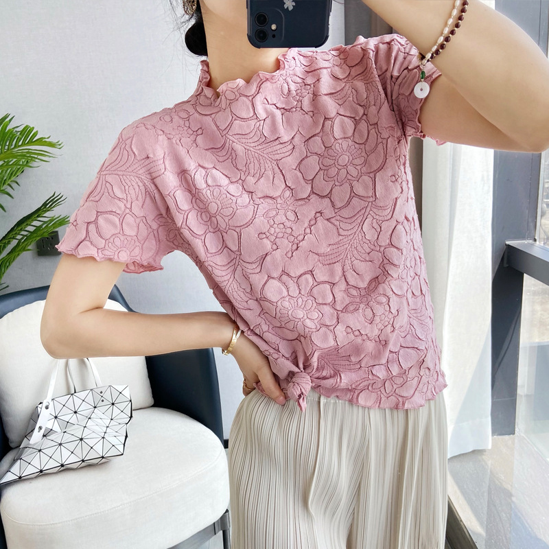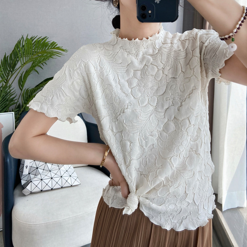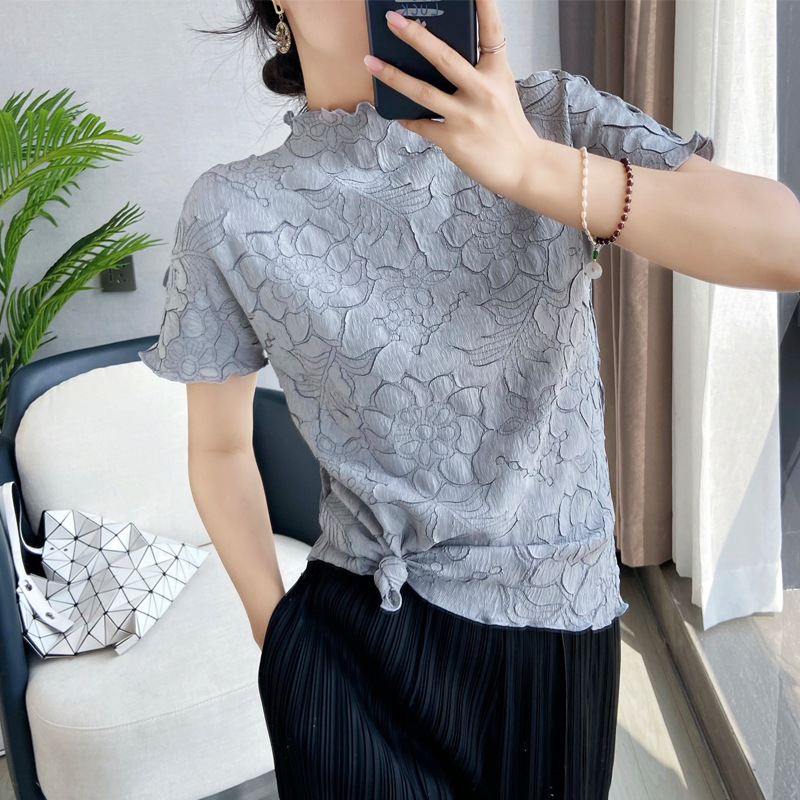 중공업 자수 미야케 치키오 주름 스탠드 칼라 반팔 티셔츠 느슨한 탑 솔리드 컬러 자수 배트윙 슬리브 여성 의류
