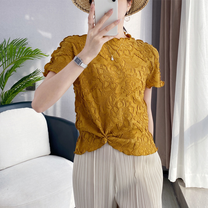 중공업 자수 미야케 치키오 주름 스탠드 칼라 반팔 티셔츠 느슨한 탑 솔리드 컬러 자수 배트윙 슬리브 여성 의류스토어 가기