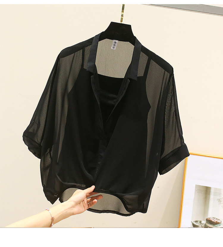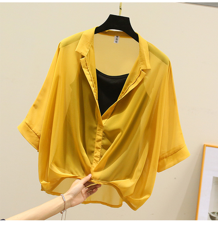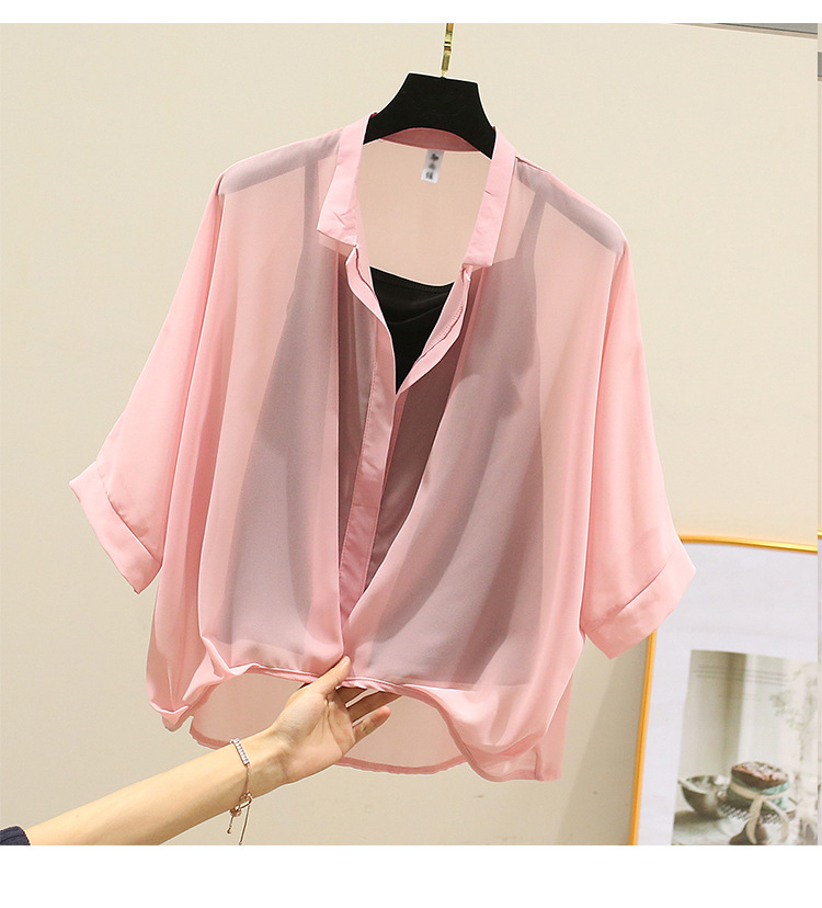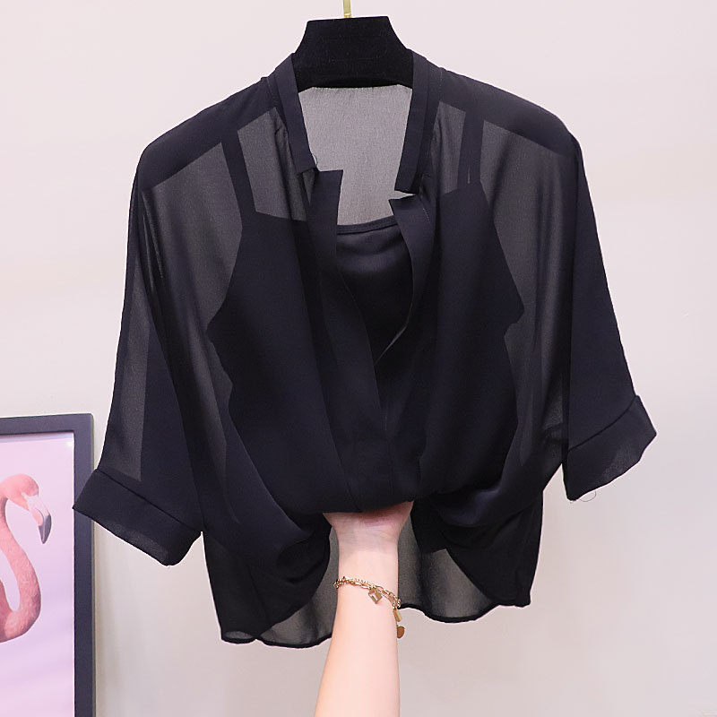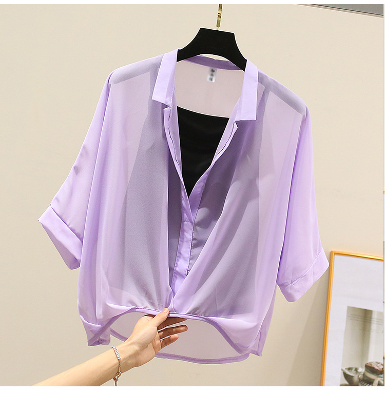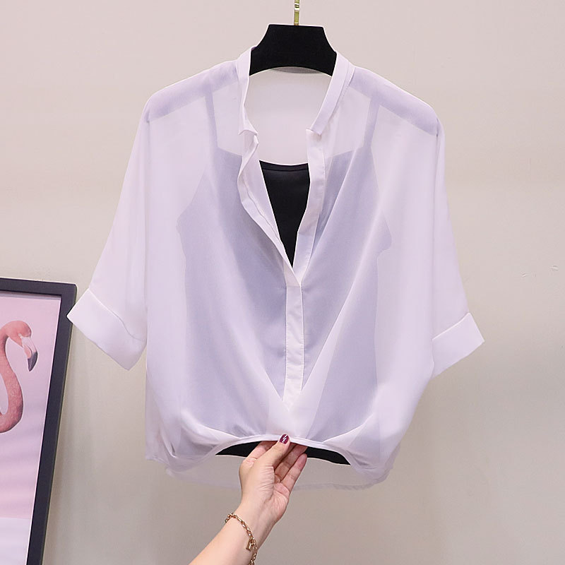 대외 무역 여성 의류 여름 새로운 여성용 쉬폰 셔츠 스트라이프 슬림 터틀넥 셔츠 투피스 배트 슬리브 자외선 차단제 탑