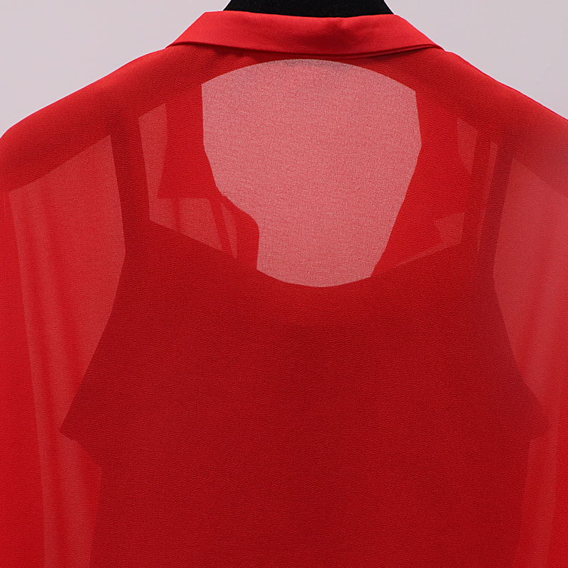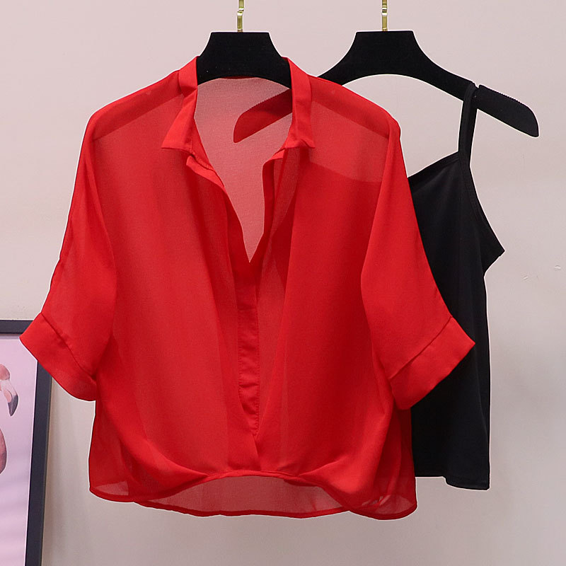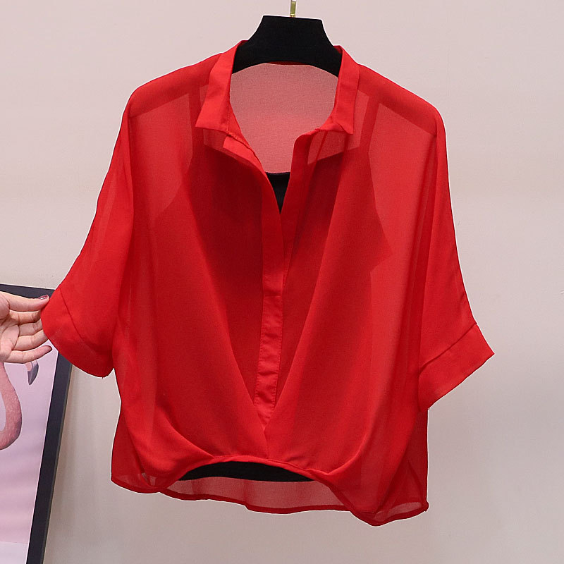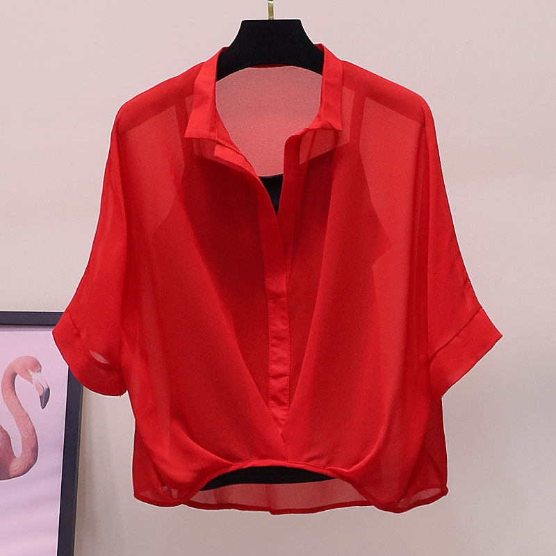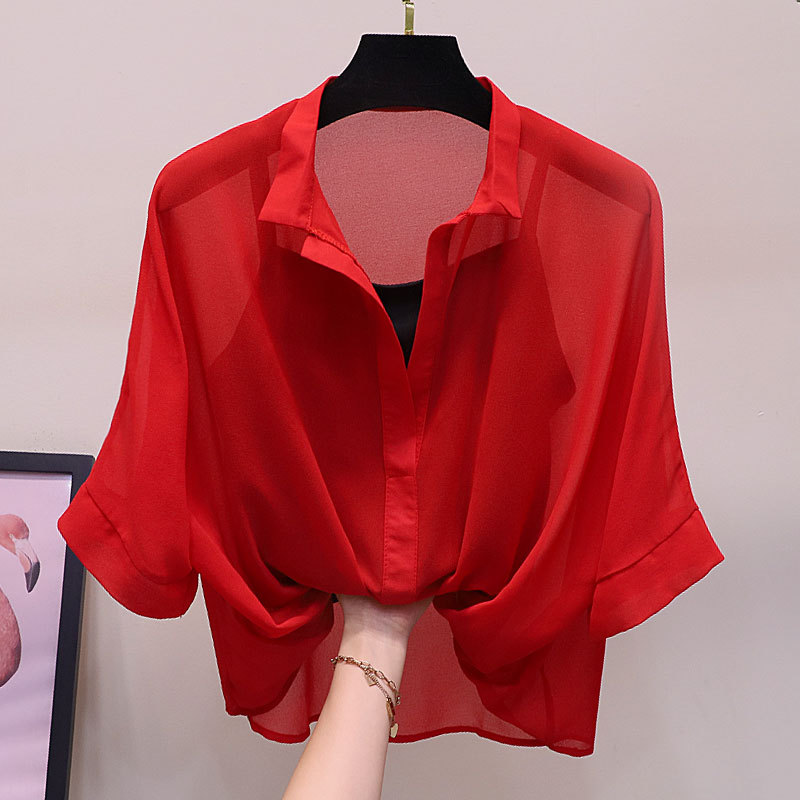 대외 무역 여성 의류 여름 새로운 여성용 쉬폰 셔츠 스트라이프 슬림 터틀넥 셔츠 투피스 배트 슬리브 자외선 차단제 탑