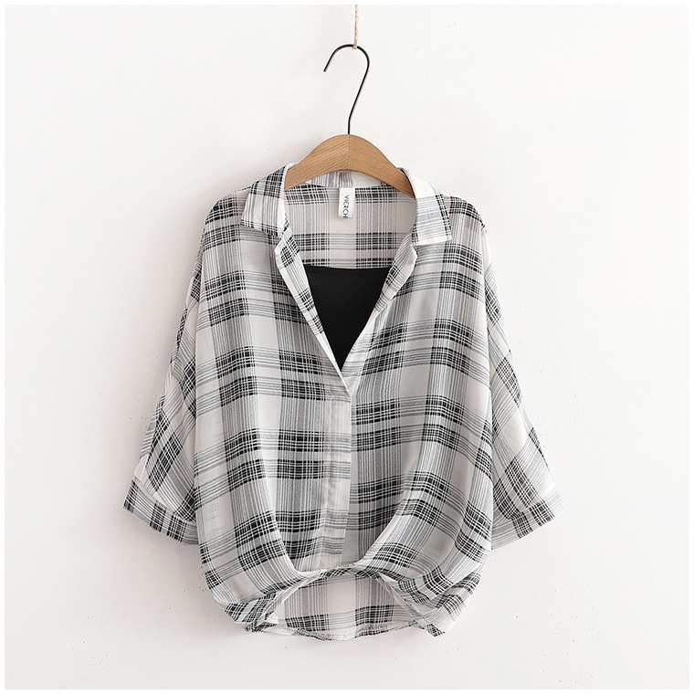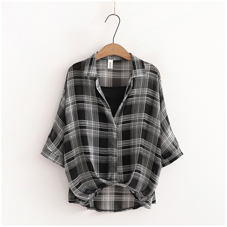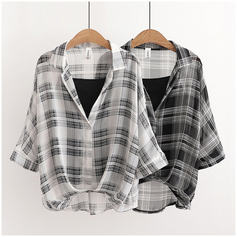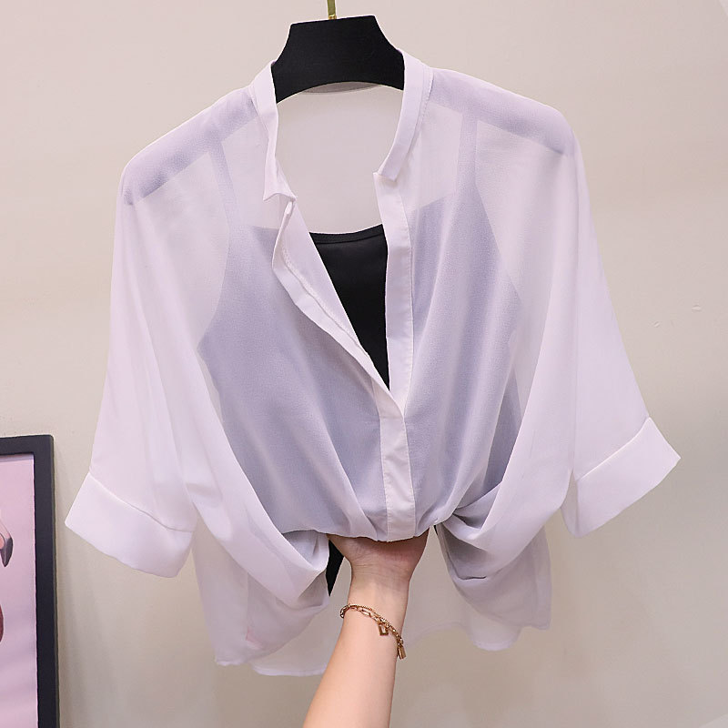 대외 무역 여성 의류 여름 새로운 여성용 쉬폰 셔츠 스트라이프 슬림 터틀넥 셔츠 투피스 배트 슬리브 자외선 차단제 탑스토어 가기