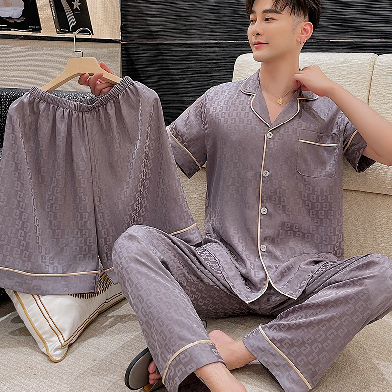 2023 새로운 남성용 쓰리피스 잠옷 여름 아이스 실크 반팔 반바지 여름 실크 남성용 얇은 가정복스토어 가기