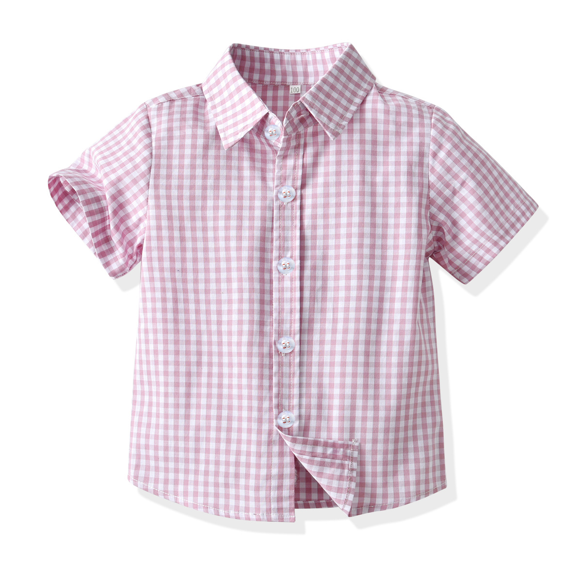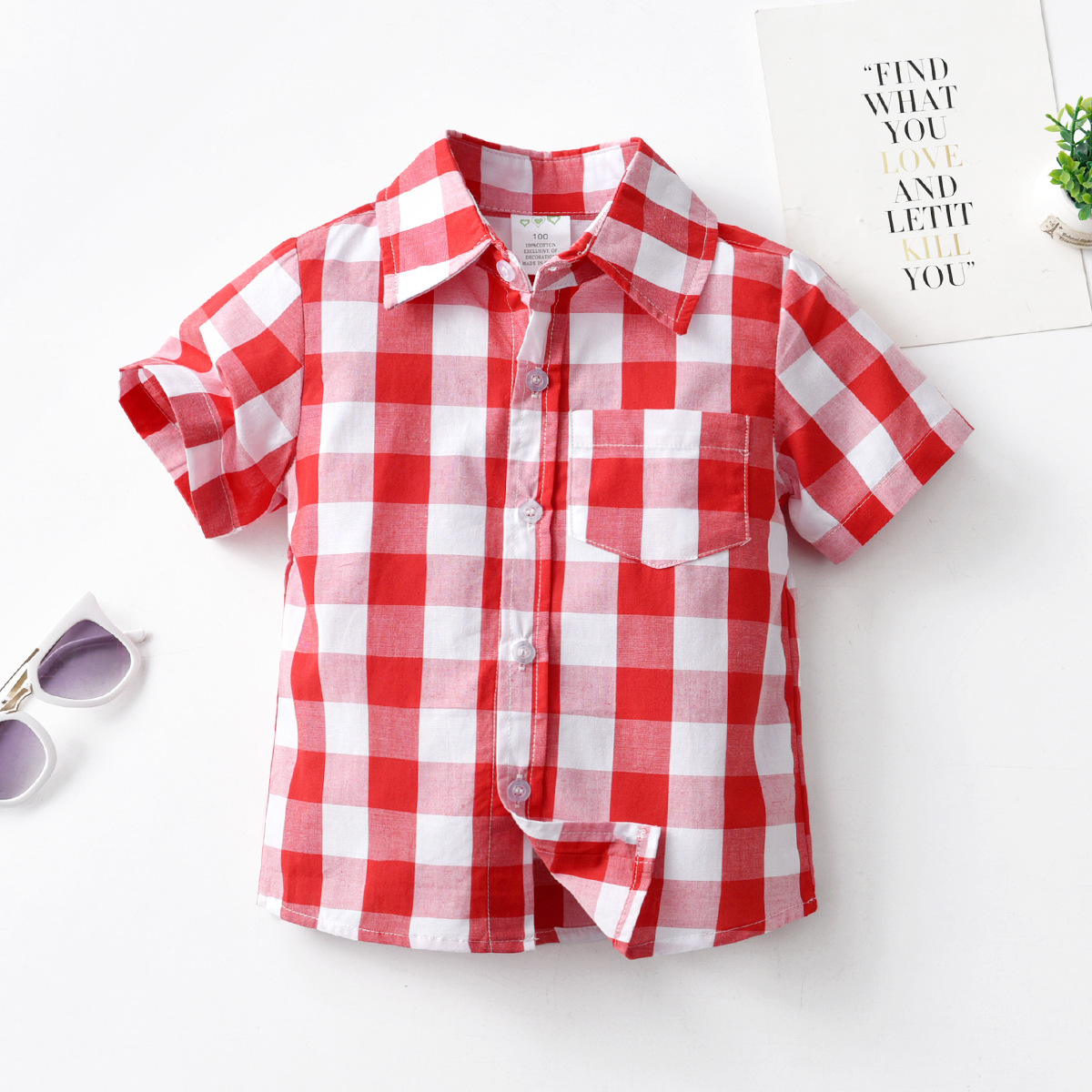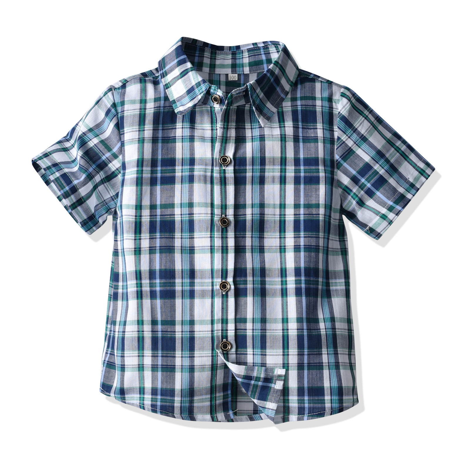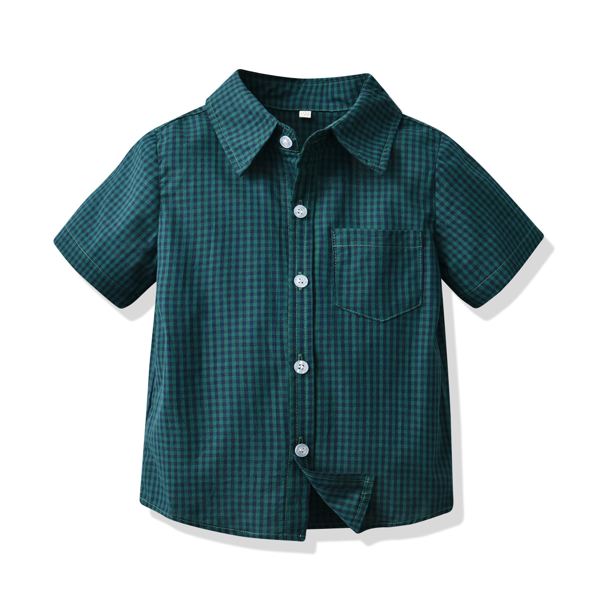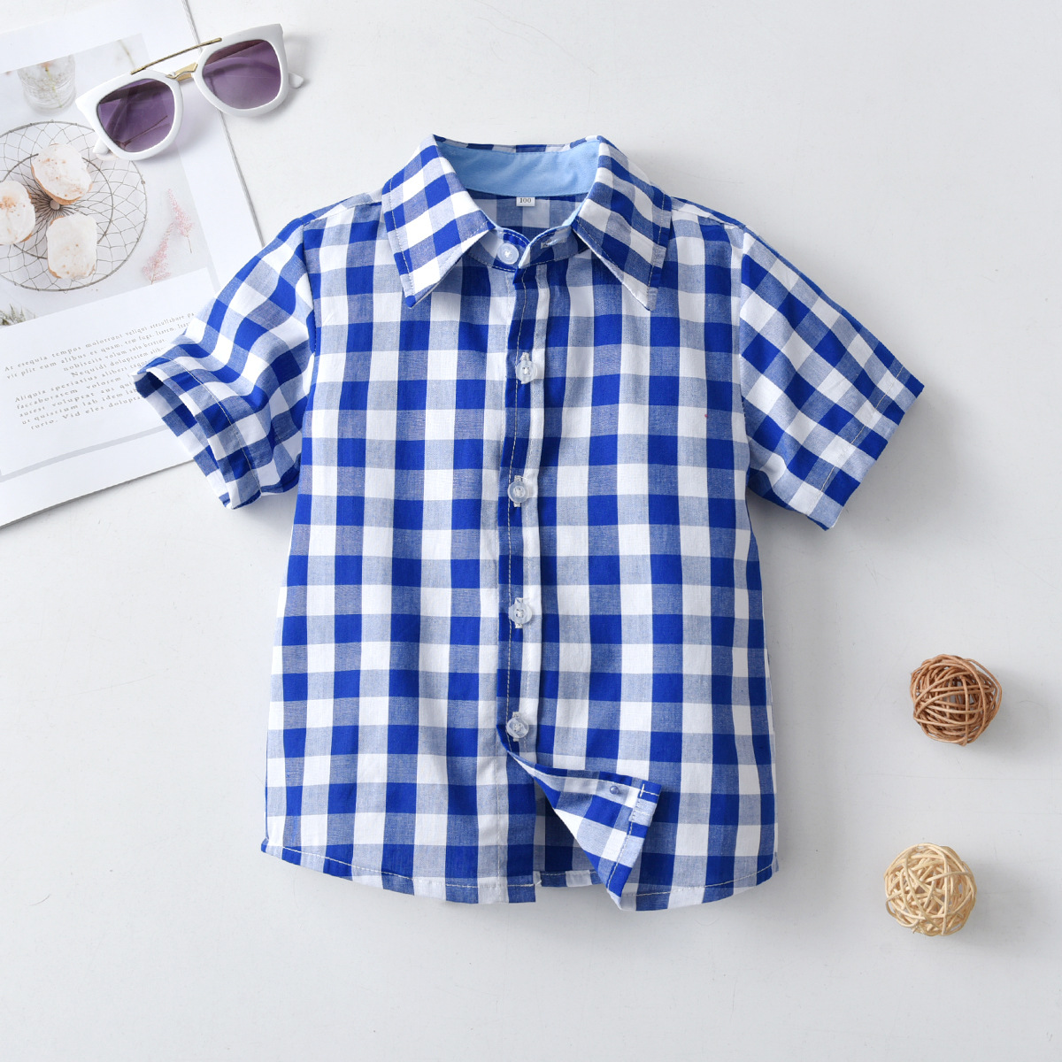 2024 국경 소년들의 격자 무늬 반팔 셔츠 중소 어린이 보물 여름 카디건 원피스 형식적인 유행 유행과 잘 생긴