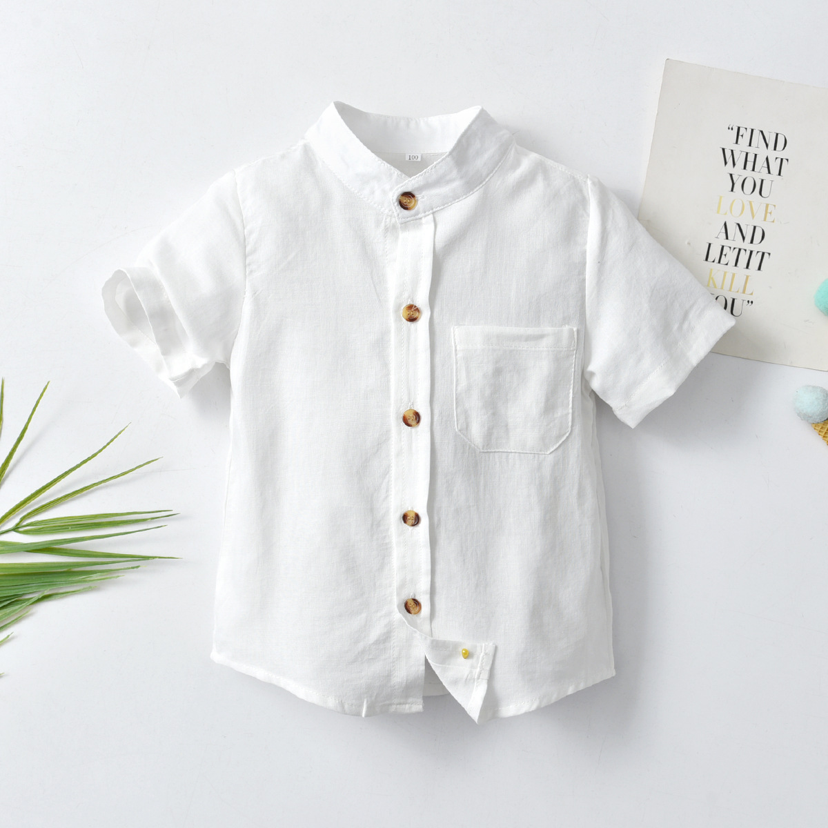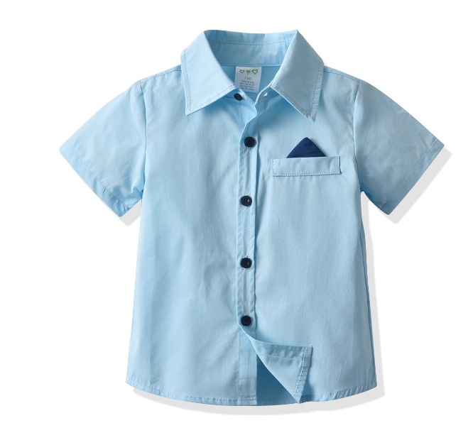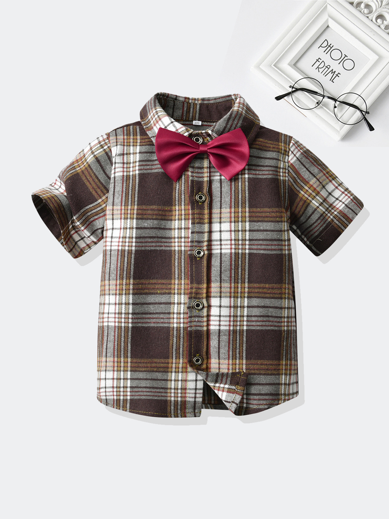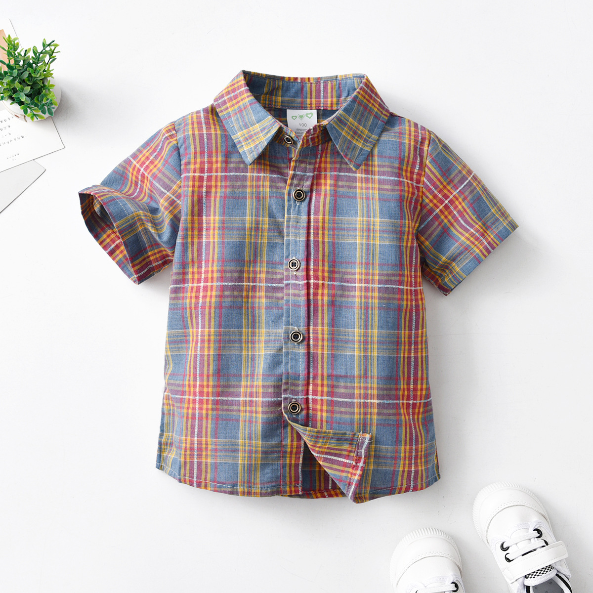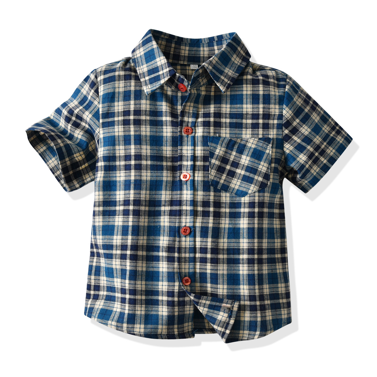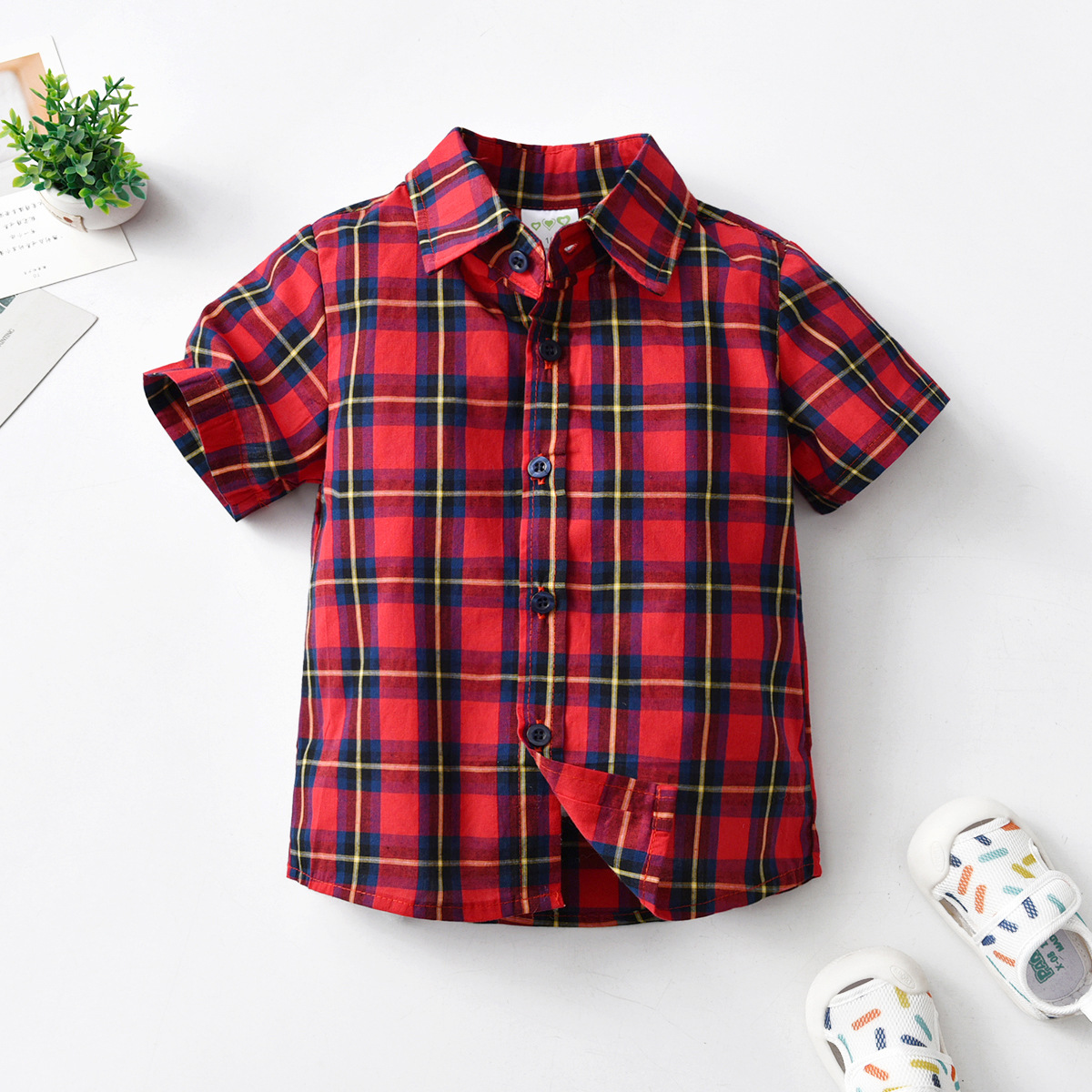 2024 국경 소년들의 격자 무늬 반팔 셔츠 중소 어린이 보물 여름 카디건 원피스 형식적인 유행 유행과 잘 생긴