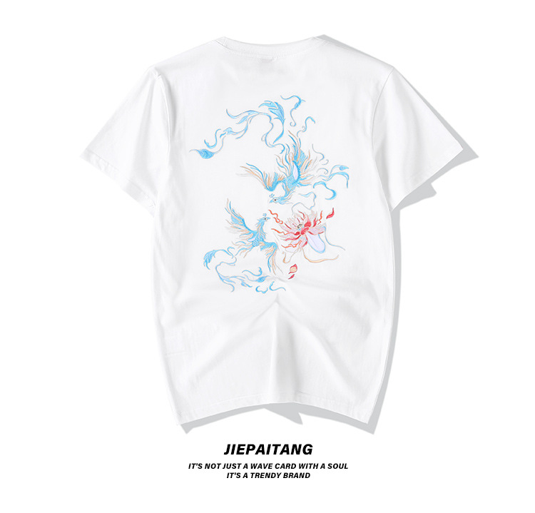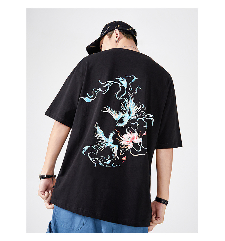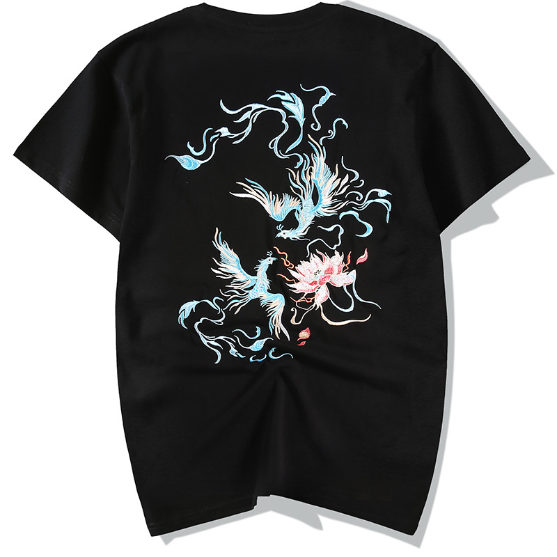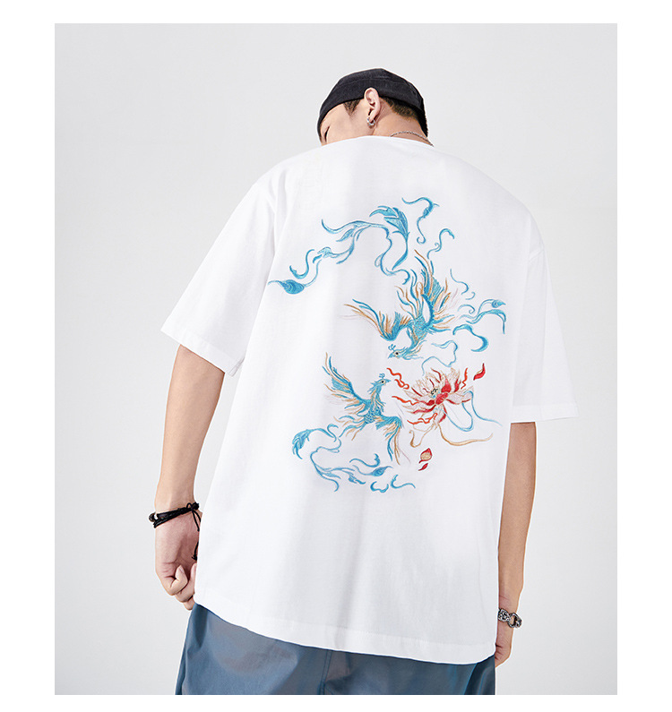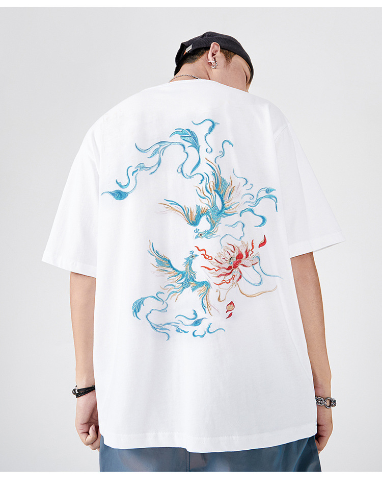 중국풍 반팔 티셔츠 남성 여름 루즈핏 큰 사이즈 청년용 봉황 자수 반팔 흡습 발한 기능스토어 가기