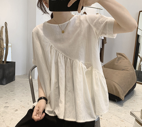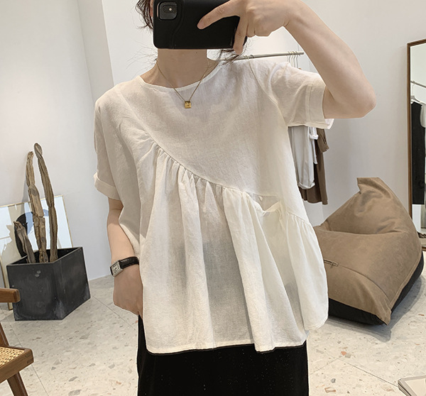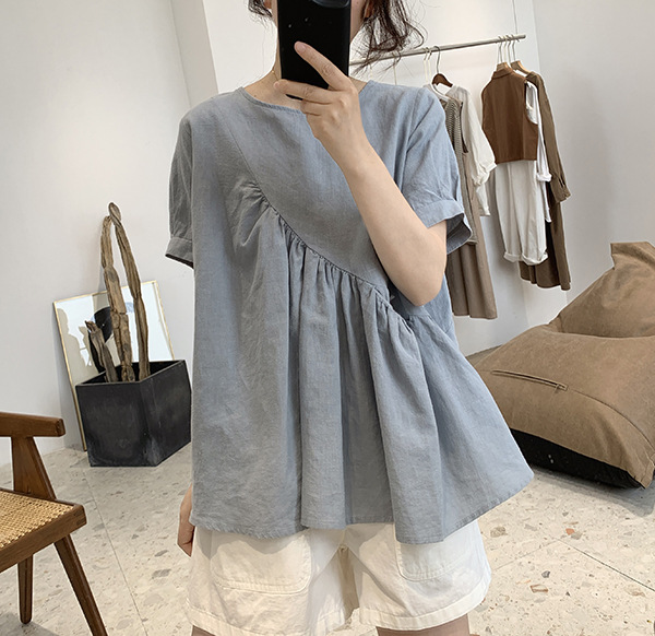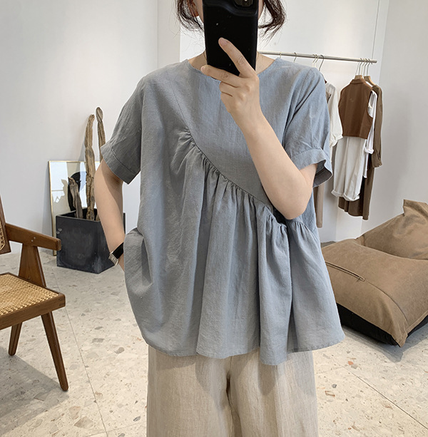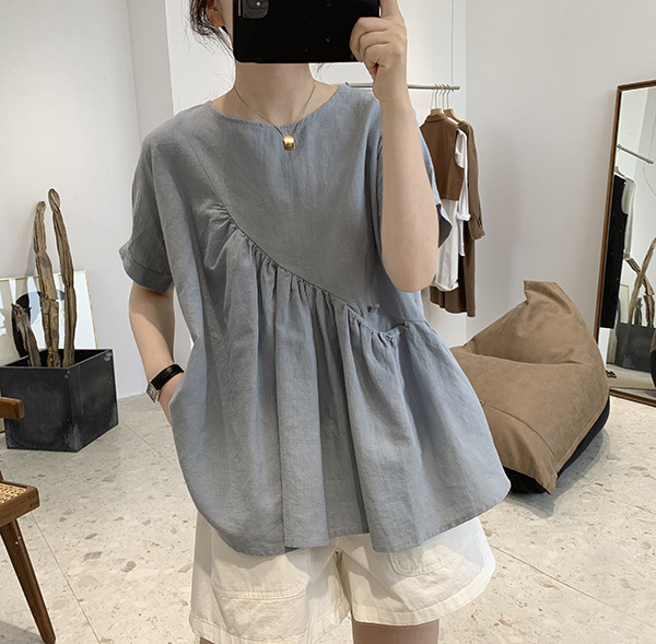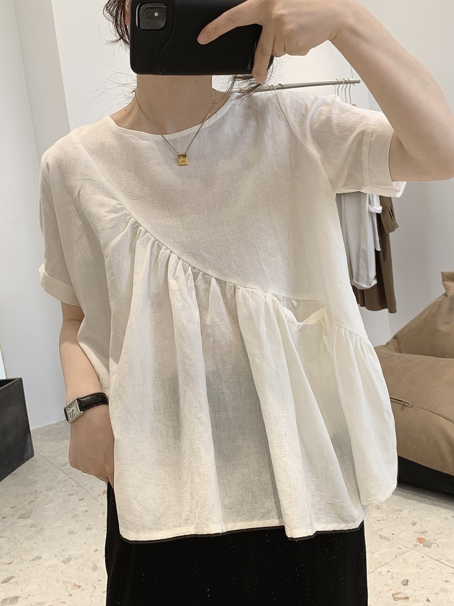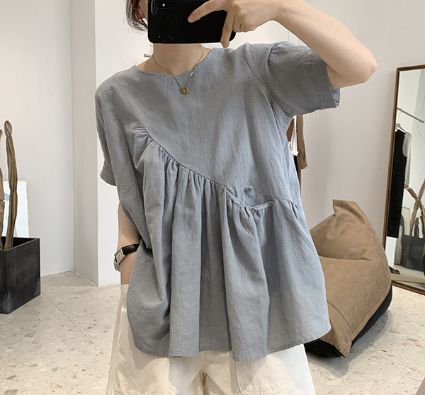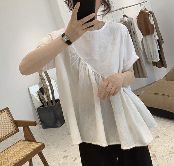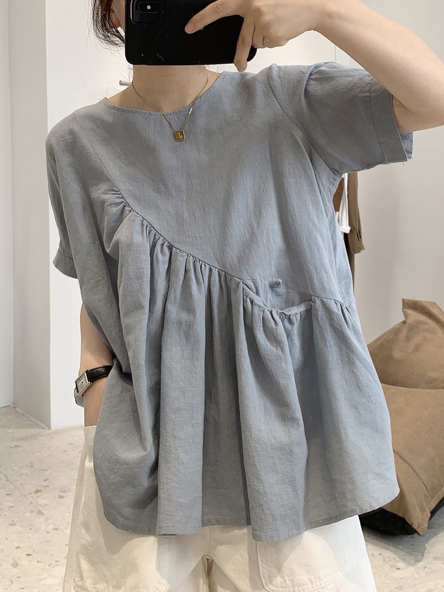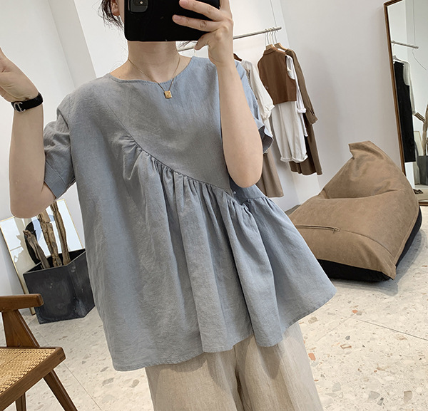 2025 여름 느슨한 대형 뚱뚱한 소녀 라운드 넥 작은 신선한 반팔 인형 셔츠 불규칙한 코튼 린넨 셔츠 여성스토어 가기