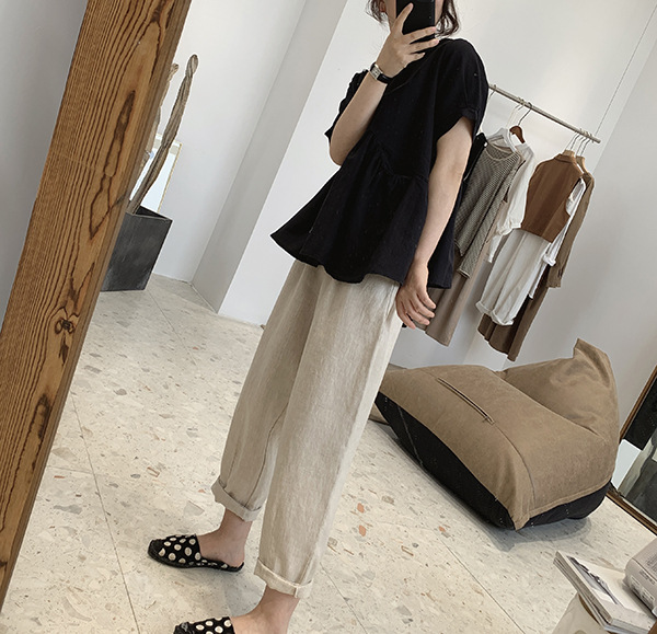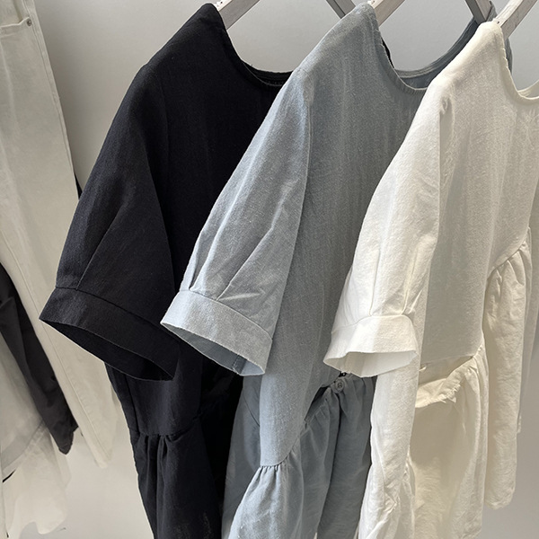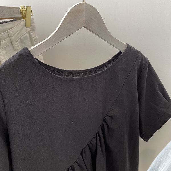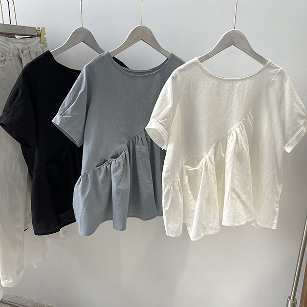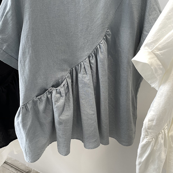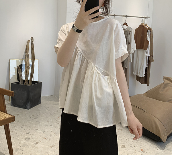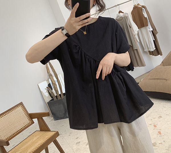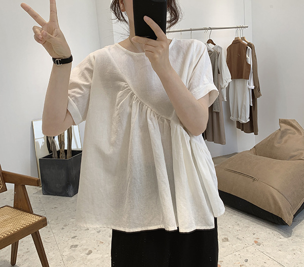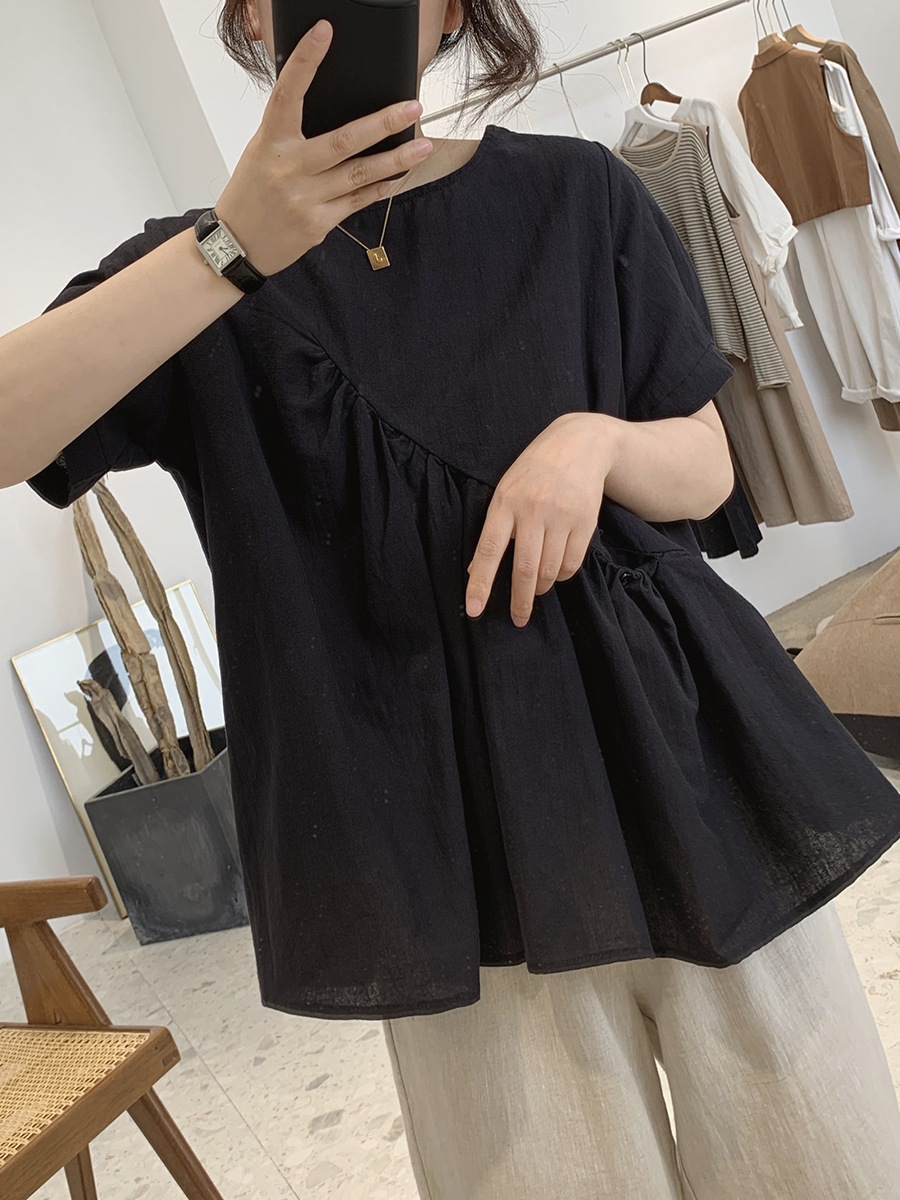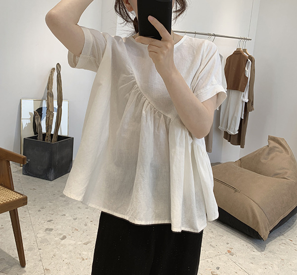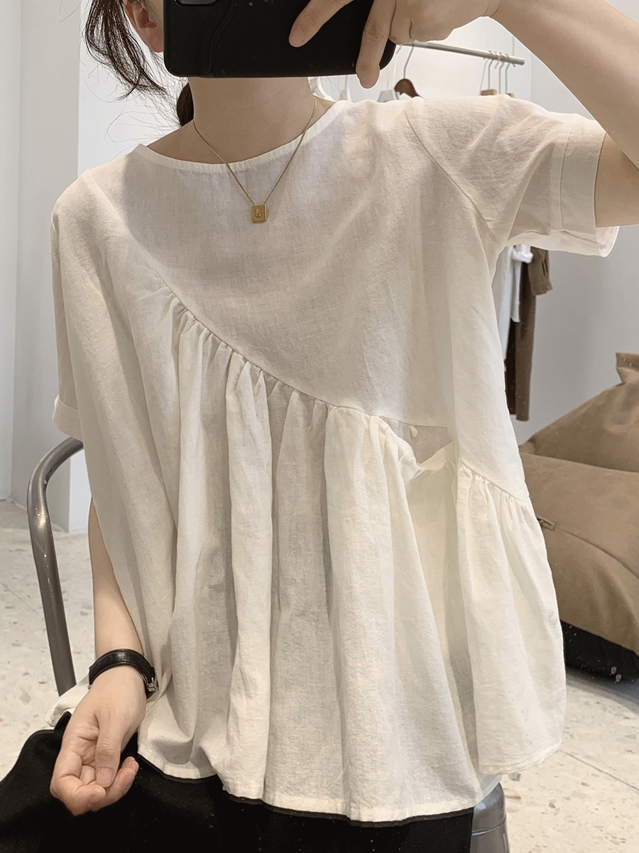 2025 여름 느슨한 대형 뚱뚱한 소녀 라운드 넥 작은 신선한 반팔 인형 셔츠 불규칙한 코튼 린넨 셔츠 여성스토어 가기
