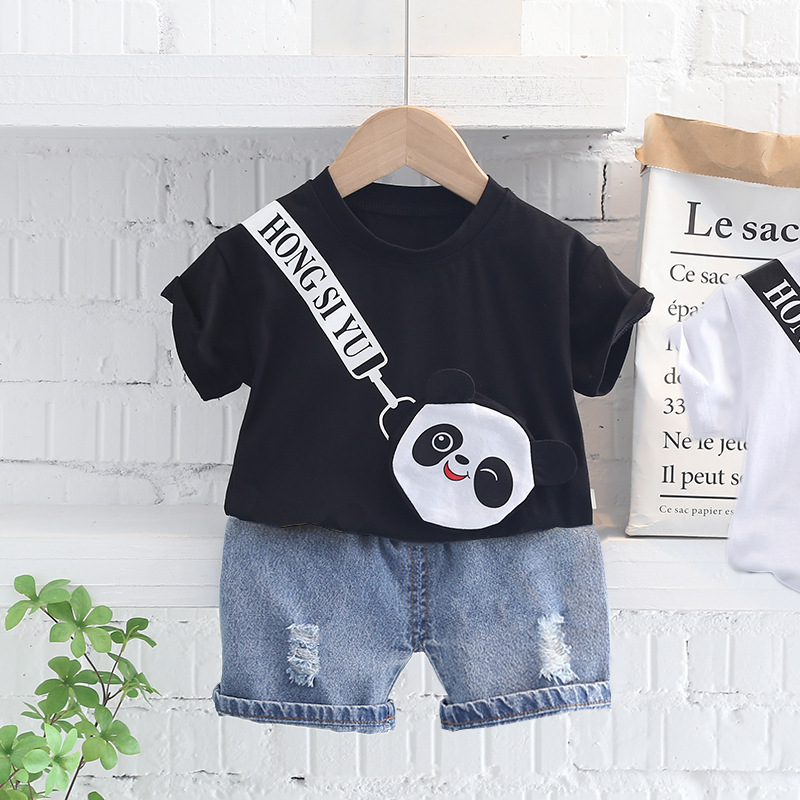 소년 여름 의류 반팔 세트 2022 새로운 아기 팬더 가방 의류 어린이 느슨한 스포츠 투피스 유행 세트