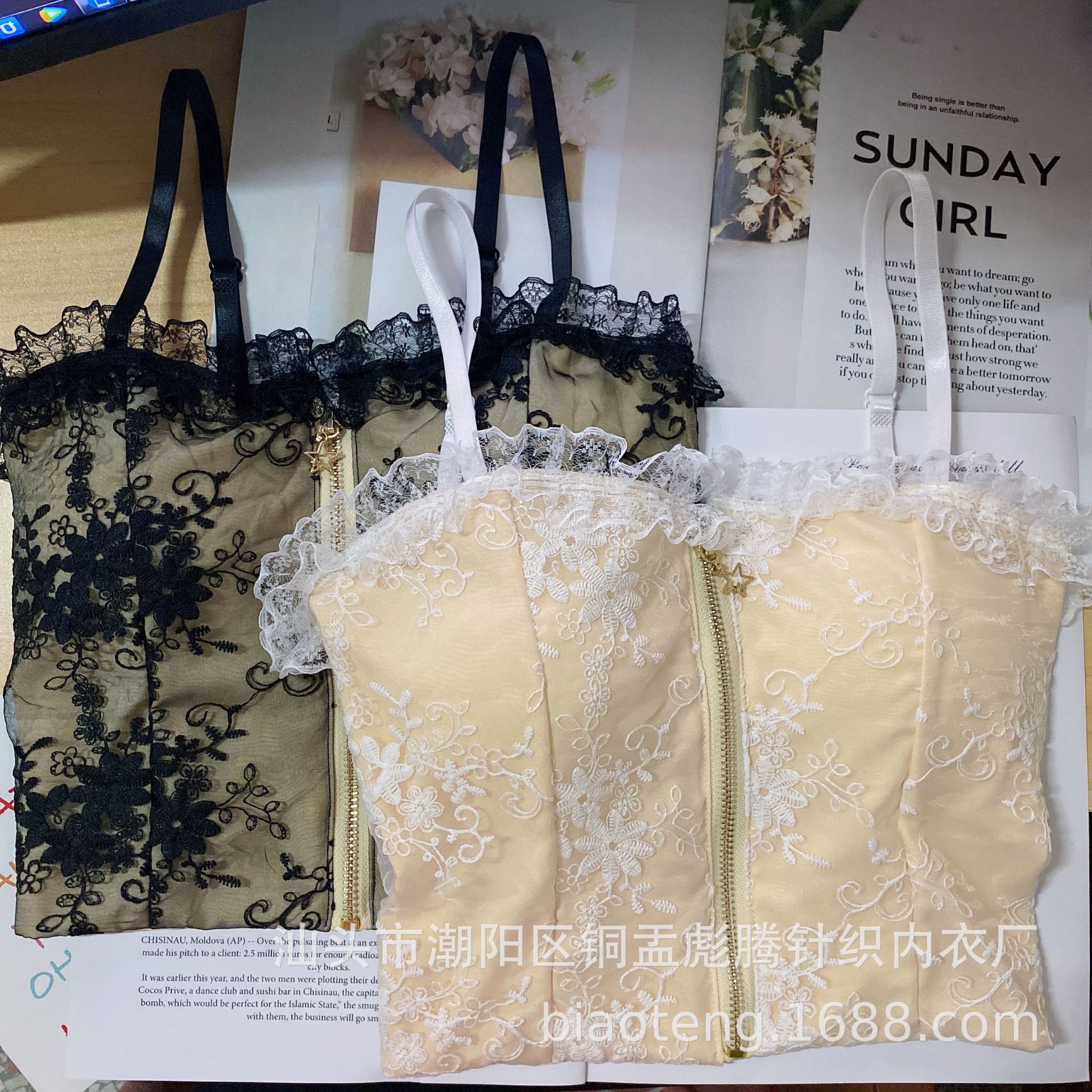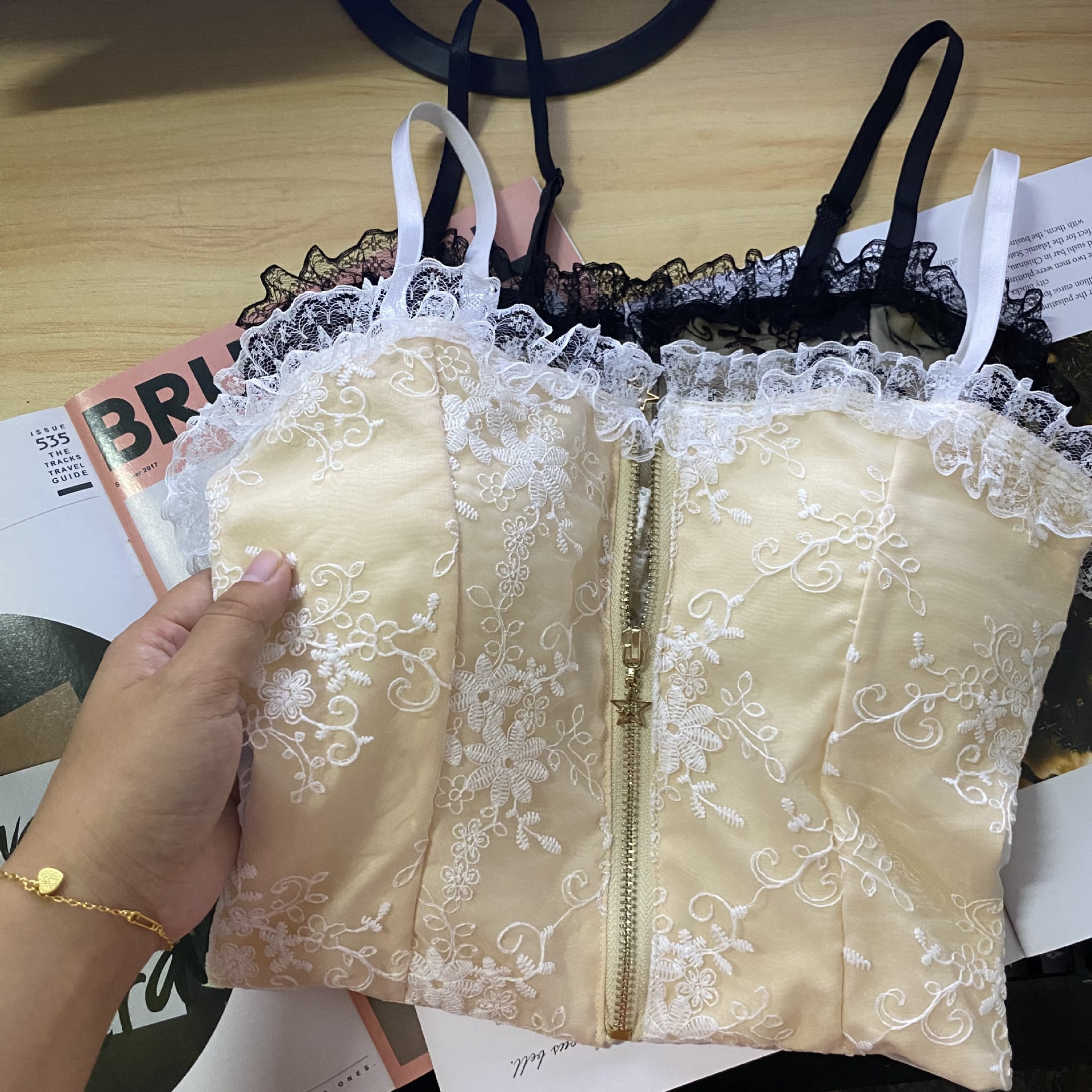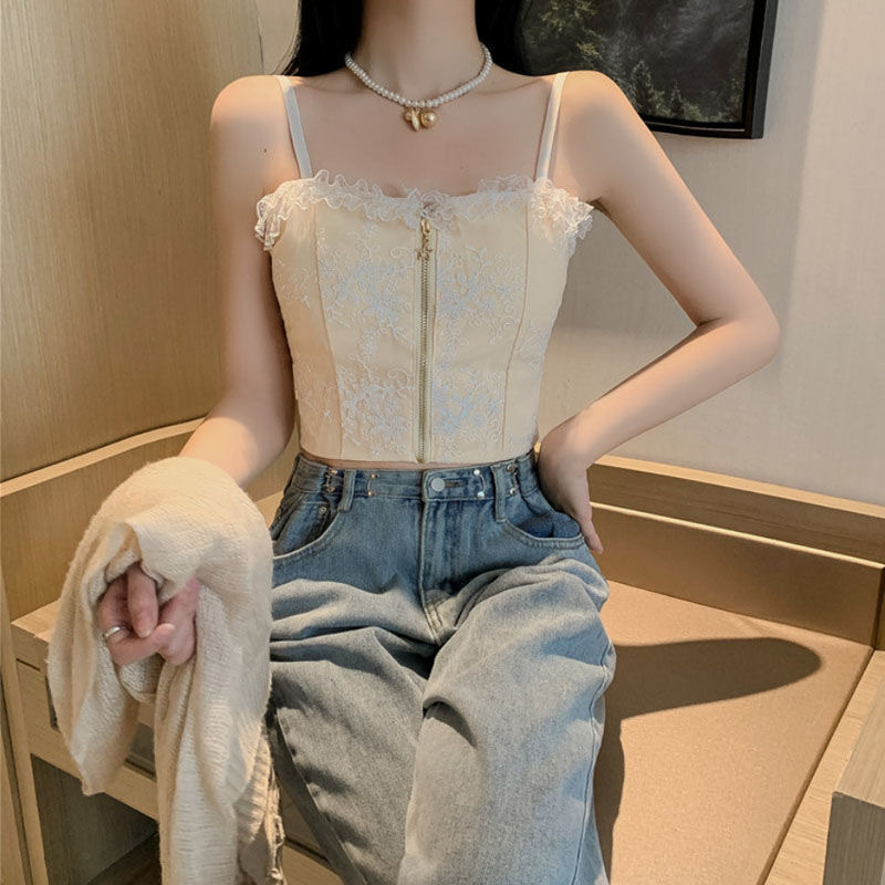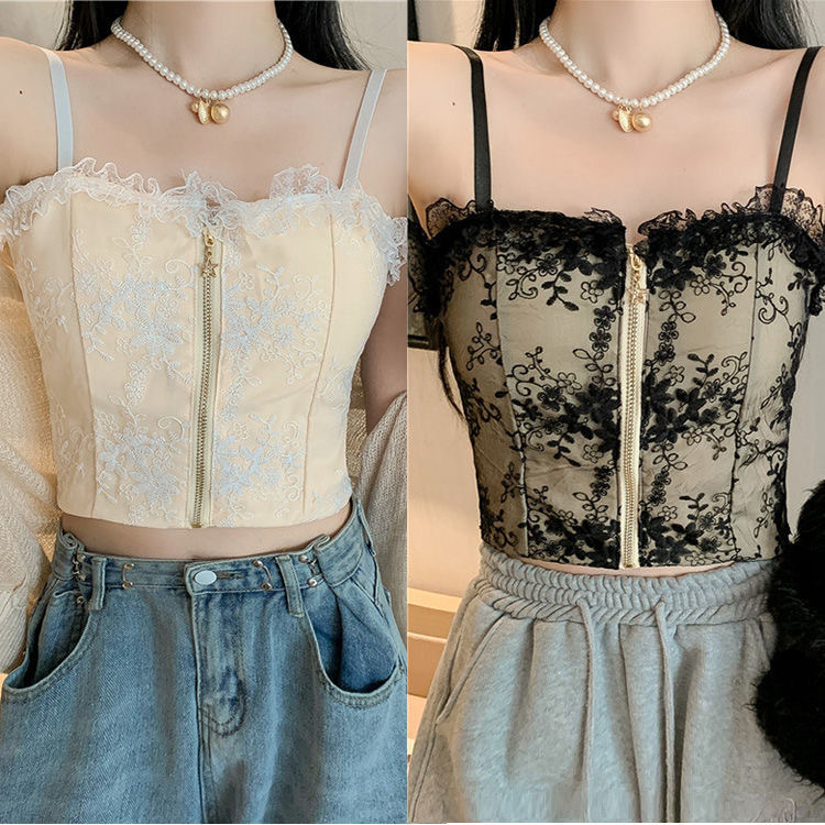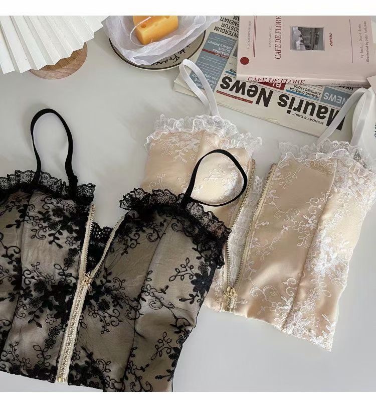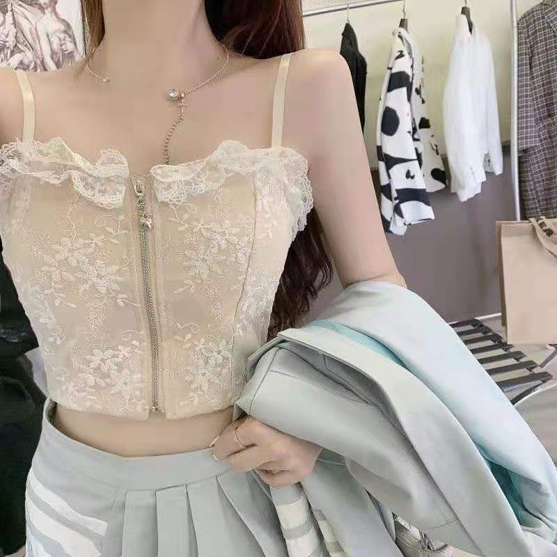 아름다운 등 레이스 레이스 지퍼 작은 캐미솔 조끼 여성용 여름 겉옷 가슴 패드가있는 청소년 민소매 탑