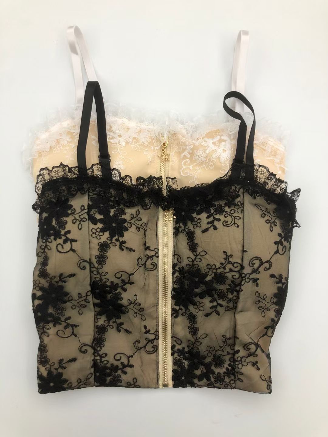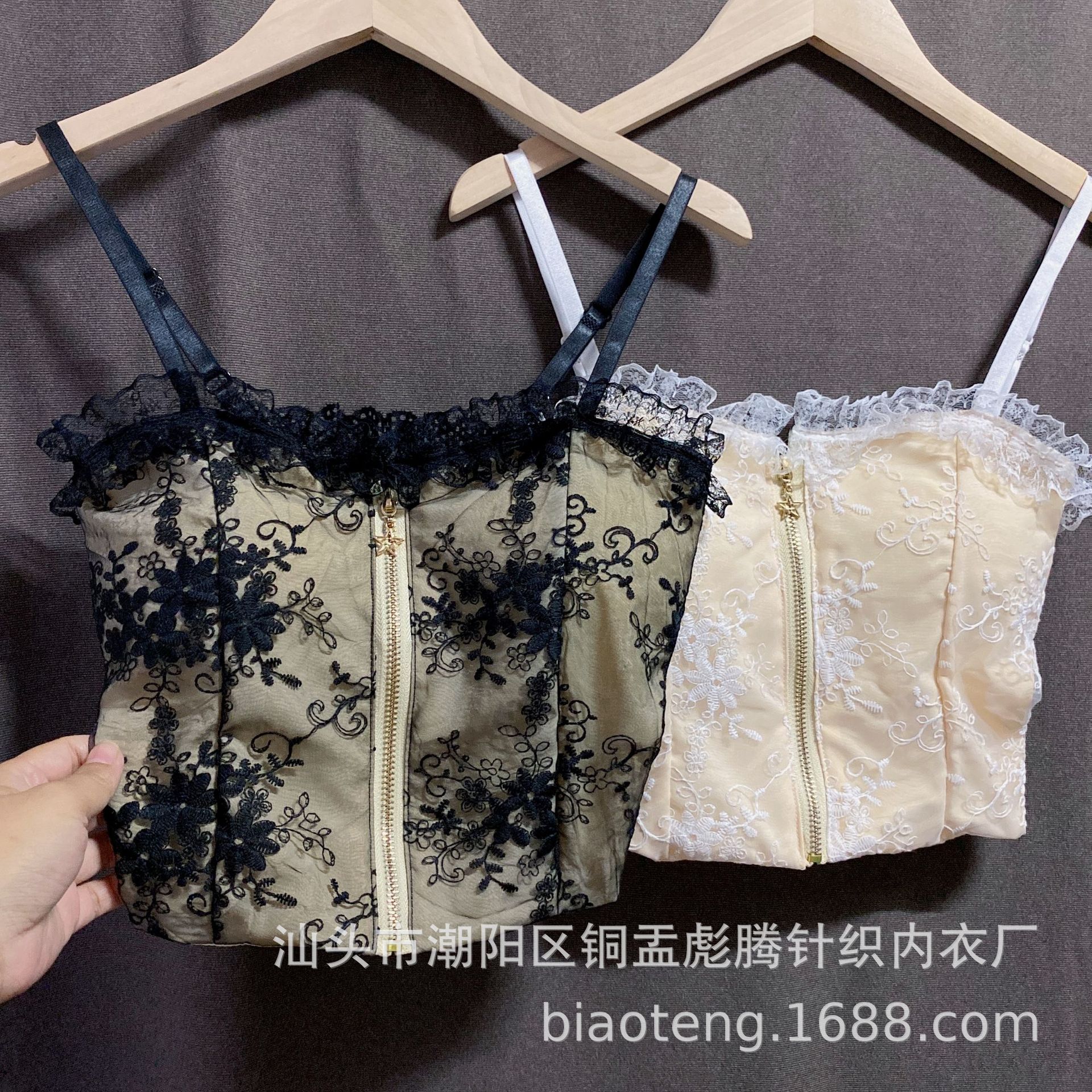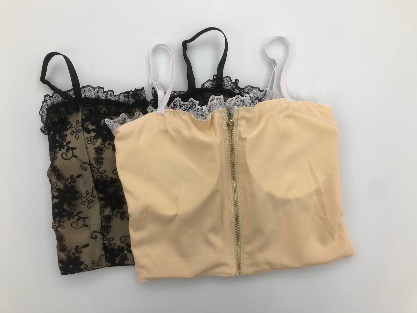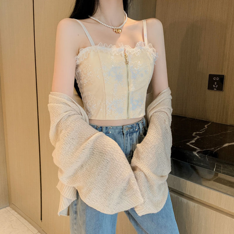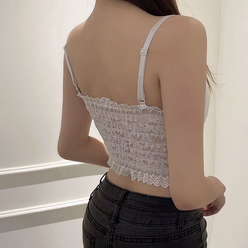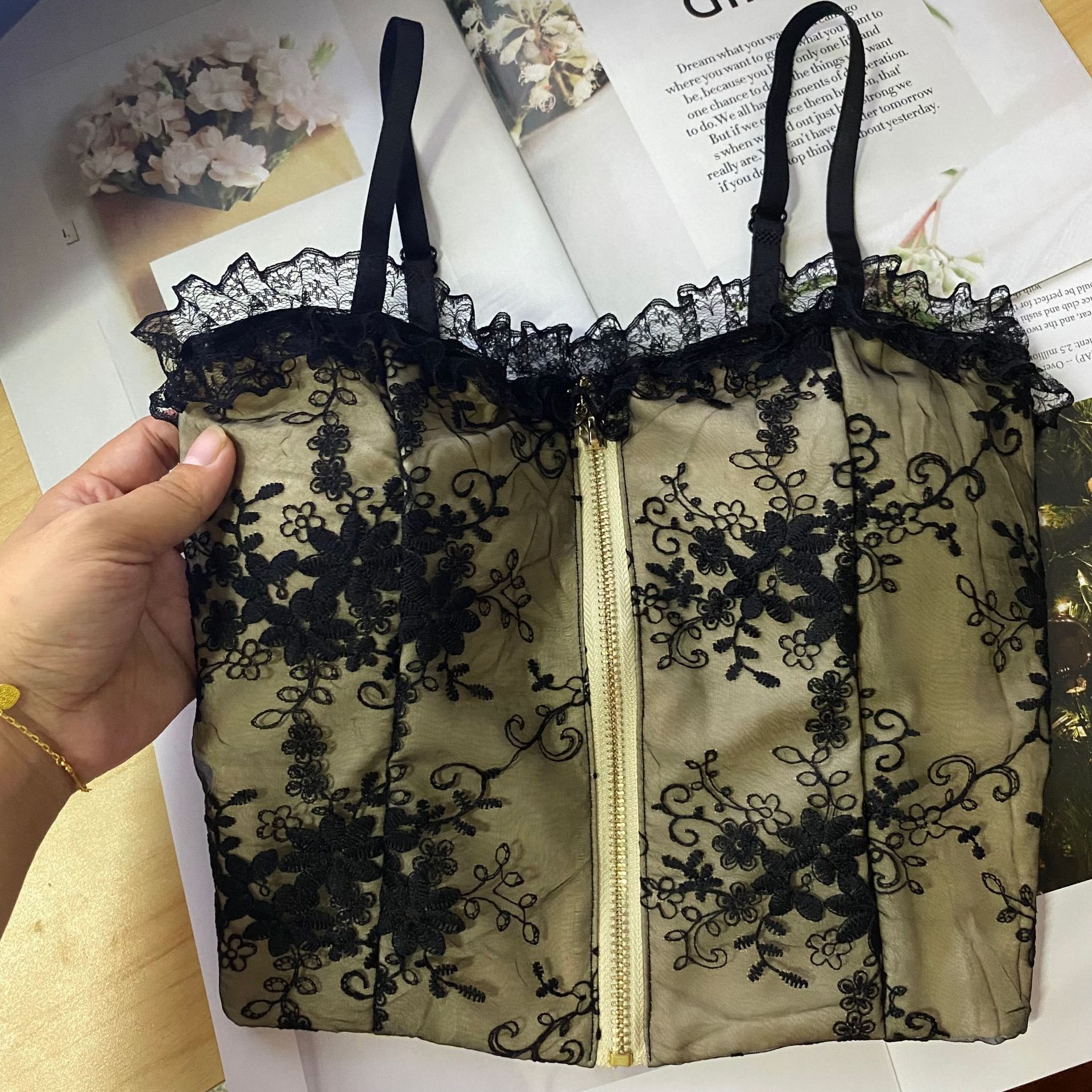 아름다운 등 레이스 레이스 지퍼 작은 캐미솔 조끼 여성용 여름 겉옷 가슴 패드가있는 청소년 민소매 탑