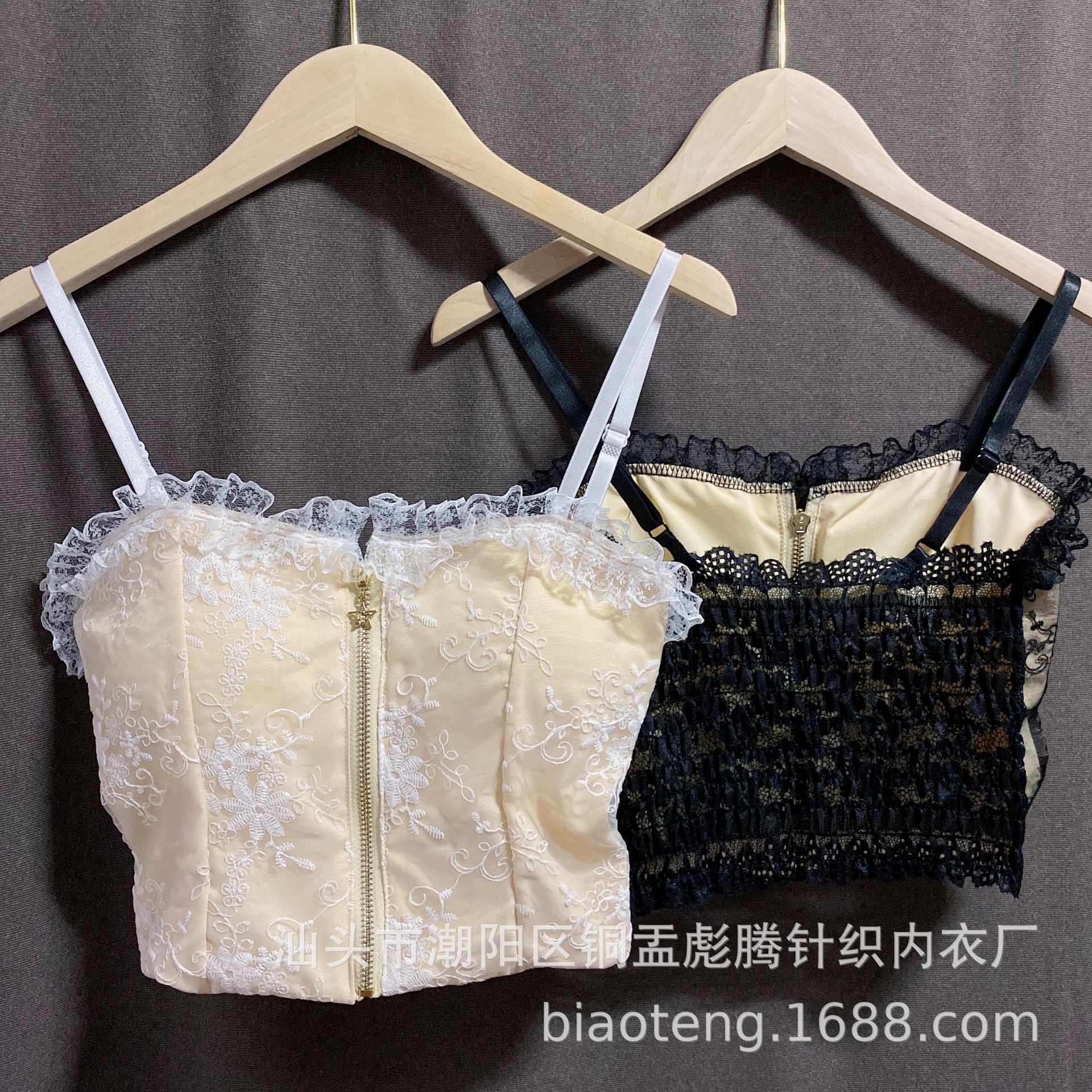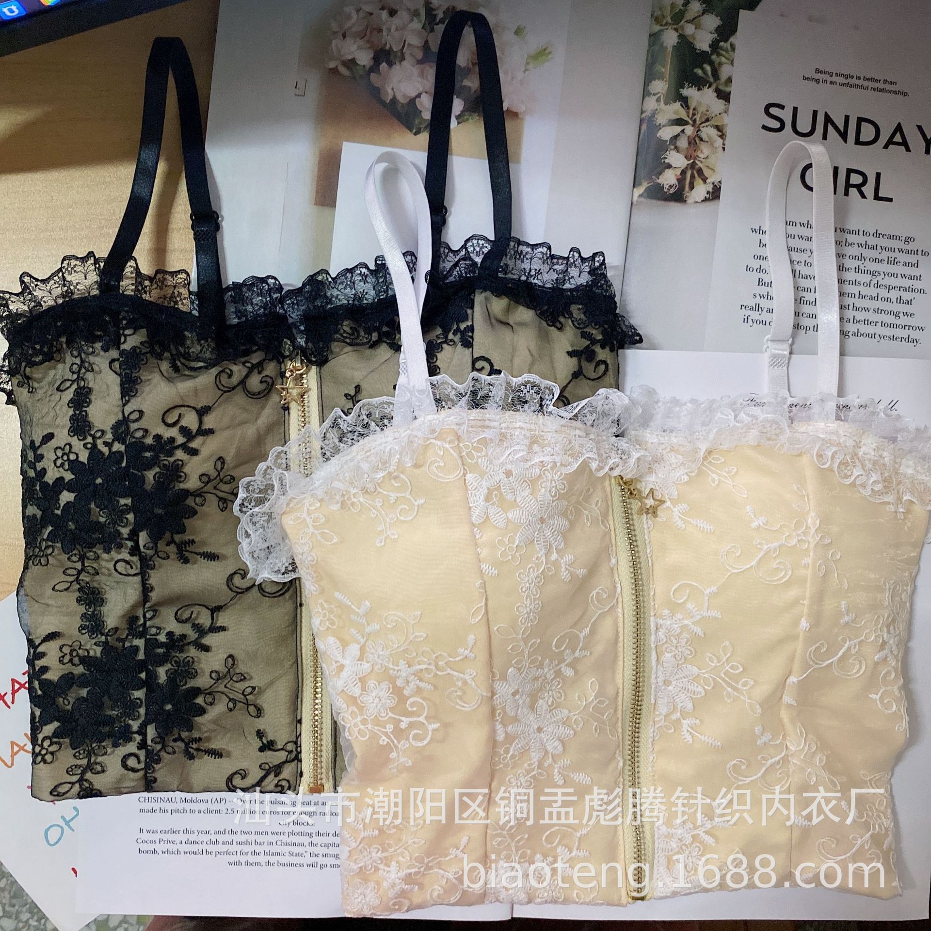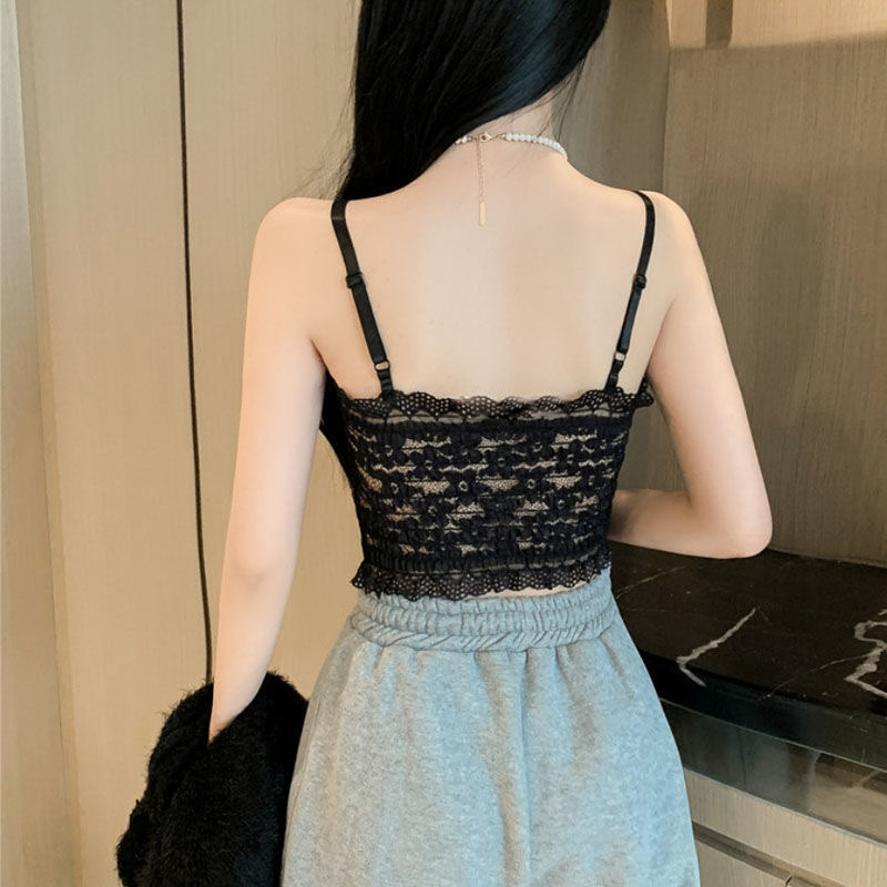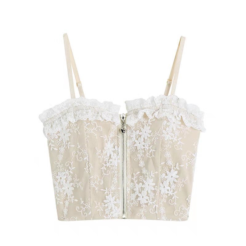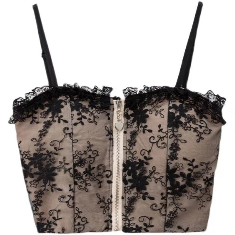 아름다운 등 레이스 레이스 지퍼 작은 캐미솔 조끼 여성용 여름 겉옷 가슴 패드가있는 청소년 민소매 탑
