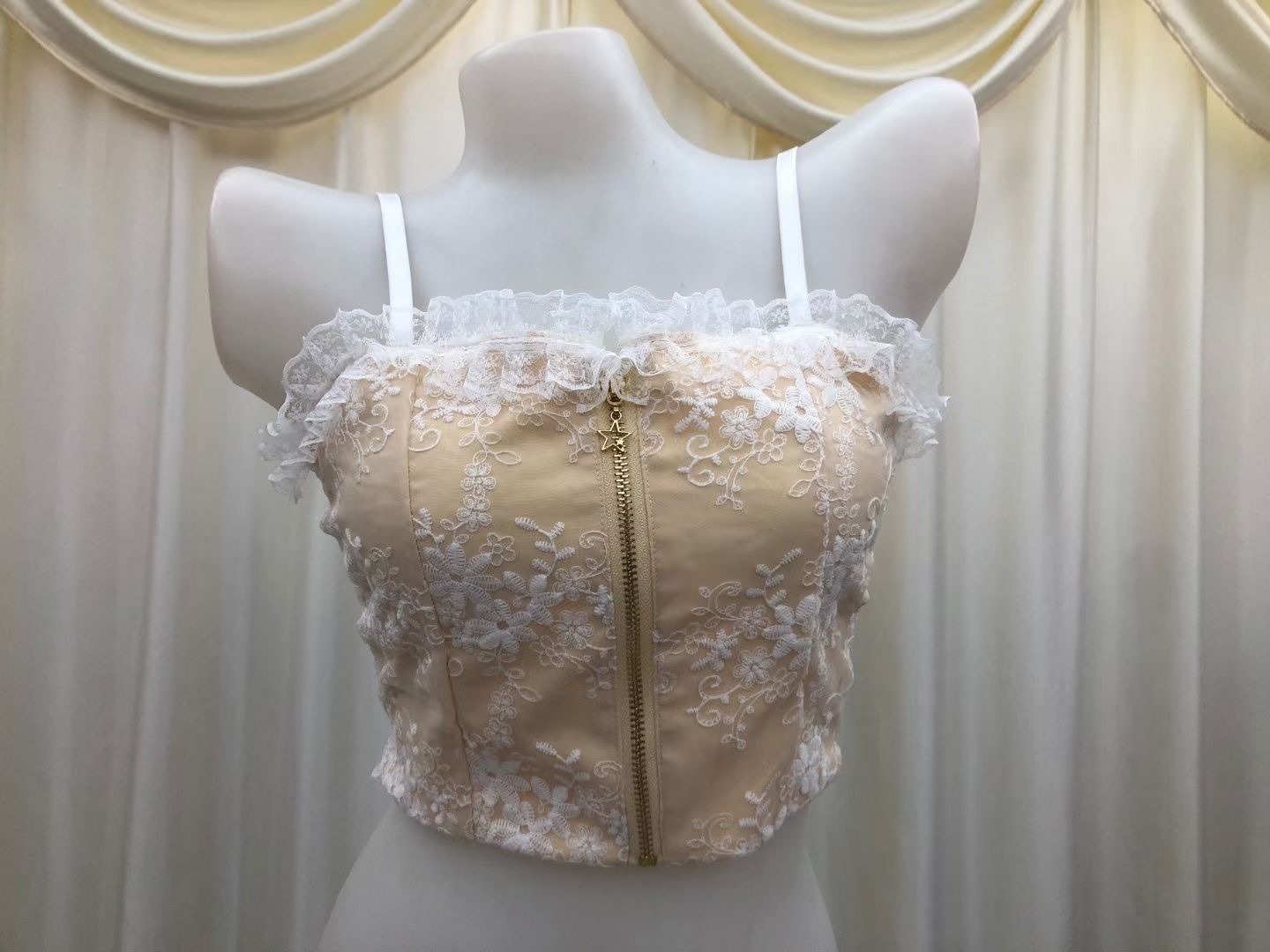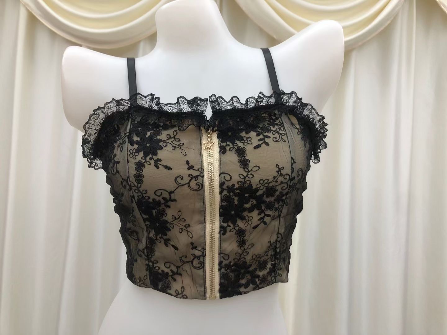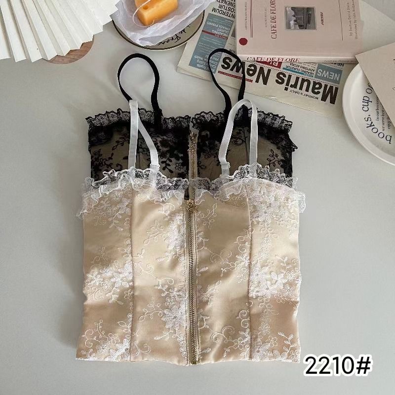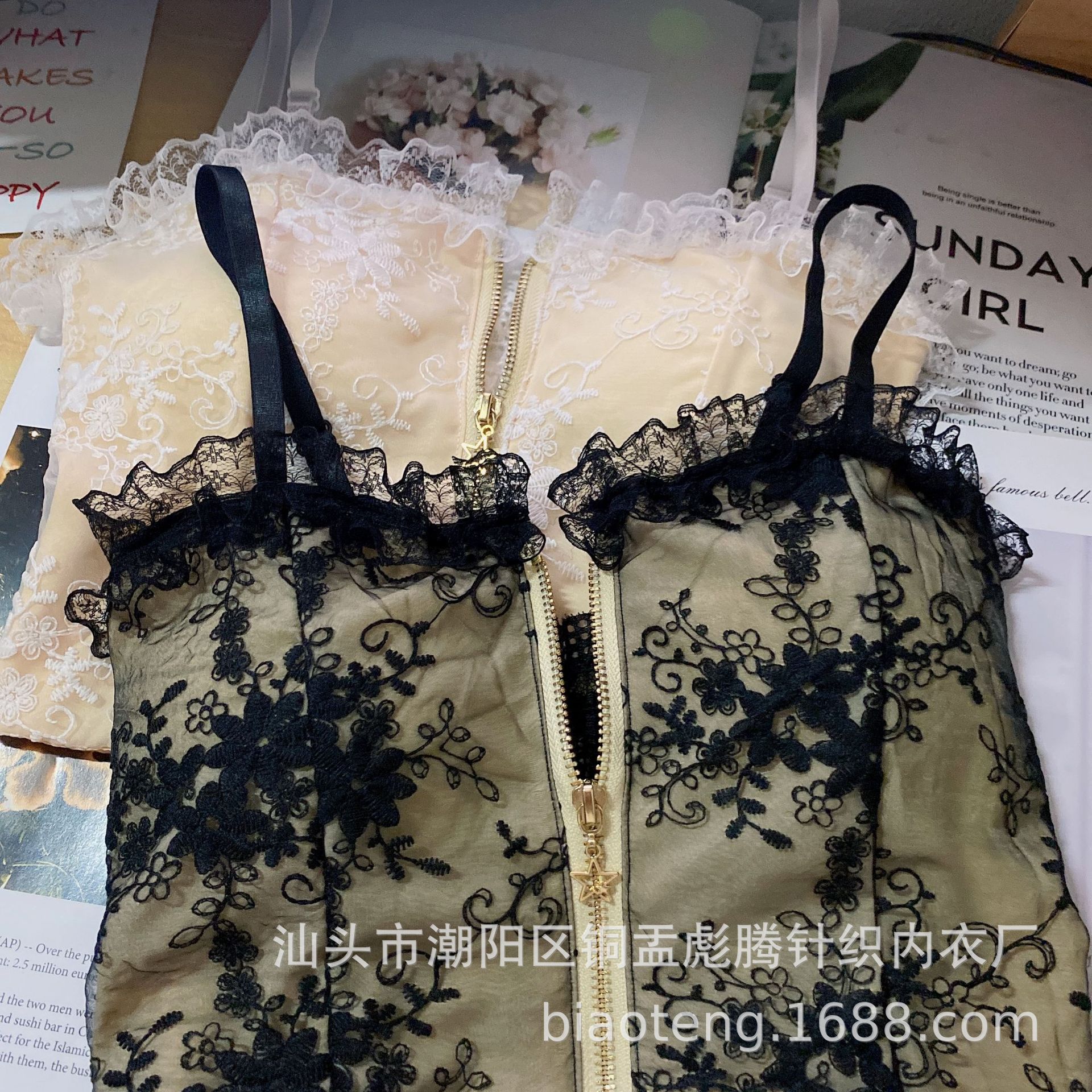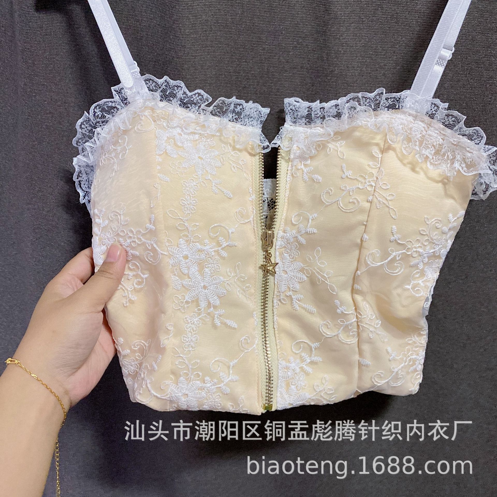 아름다운 등 레이스 레이스 지퍼 작은 캐미솔 조끼 여성용 여름 겉옷 가슴 패드가있는 청소년 민소매 탑