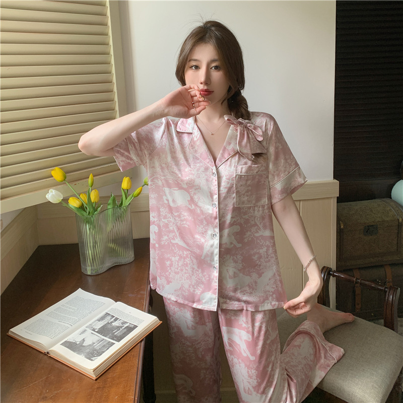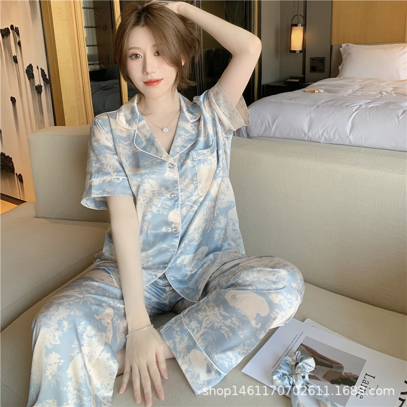 잠옷 여성 봄 여름 새로운 얼음 실크 인쇄 카디건 편안하고 시원한 반팔 바지 정장 홈웨어 헤어 밴드스토어 가기
