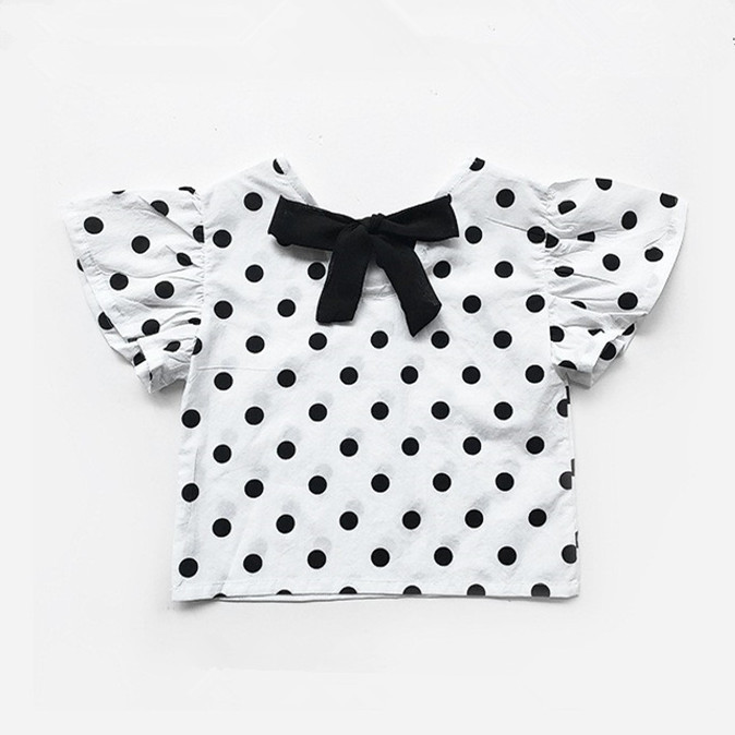 여름 소녀 세트 아기 온라인 인기있는 외국 스타일 어린이 개인 유행 브랜드 한국 스타일 물방울 무늬 쉬폰 셔츠 데님 플레어 바지스토어 가기