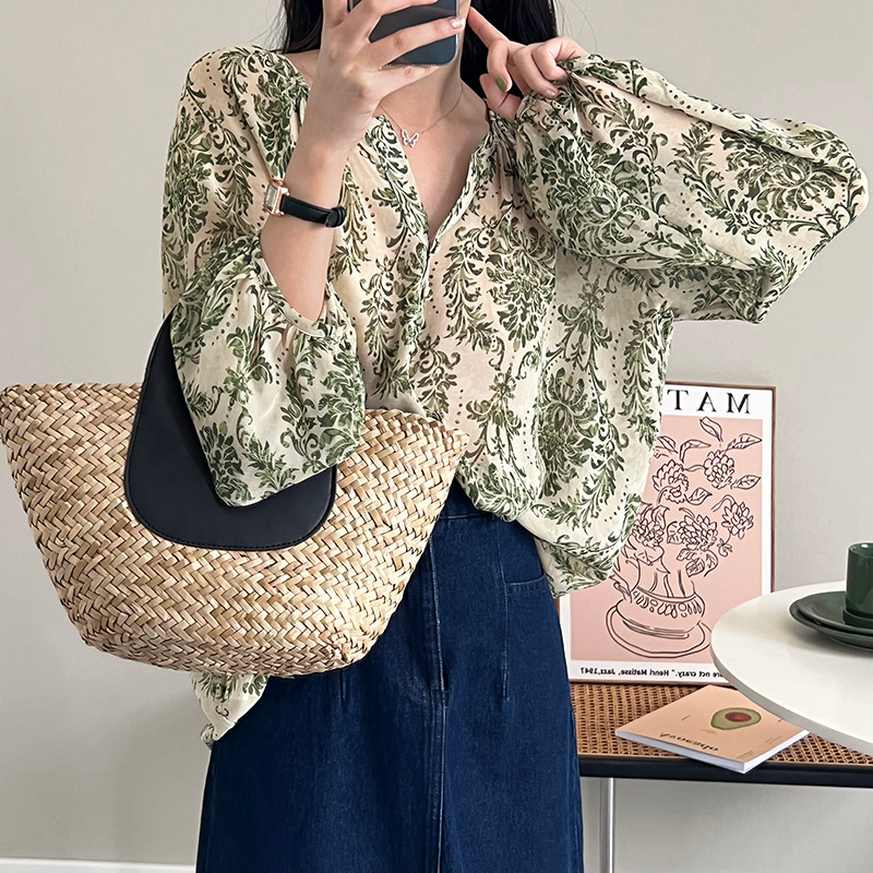 Tao Chuan 틈새 색상 ~ 레트로 슬리밍 그린 플로럴 랜턴 슬리브 마이크로 투명 자외선 차단제 셔츠 여성용 2022 여름 0867
