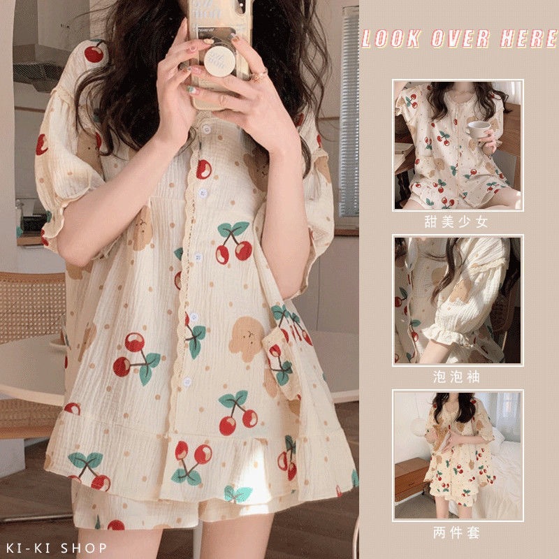 라이브 잠옷 여성용 여름 한국식 in 사이버 연예인 곰 반팔 반바지 가디건 달콤한 가정복 여성 투피스 세트스토어 가기