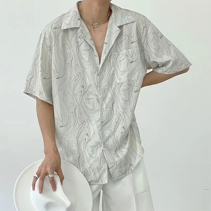 여름 틈새 쿠바 칼라 게으른 느슨한 드레이프 질감 한국 스타일 얇은 복고풍 웨이브 패턴 반팔 셔츠 남성 캐주얼