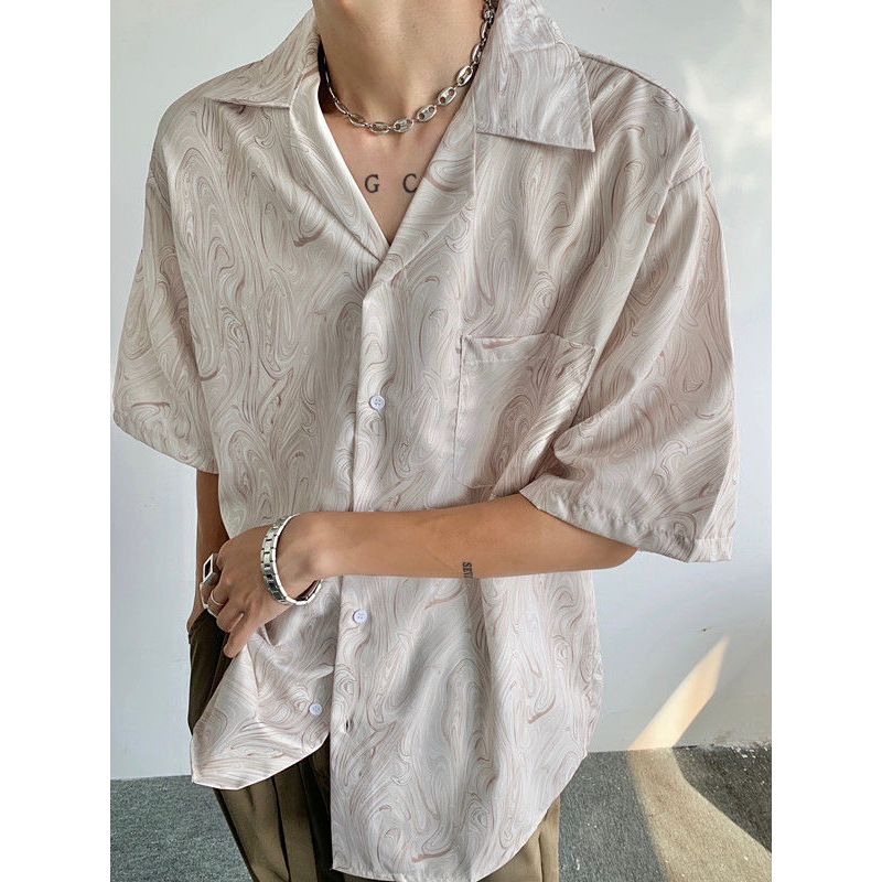 여름 틈새 쿠바 칼라 게으른 느슨한 드레이프 질감 한국 스타일 얇은 복고풍 웨이브 패턴 반팔 셔츠 남성 캐주얼스토어 가기