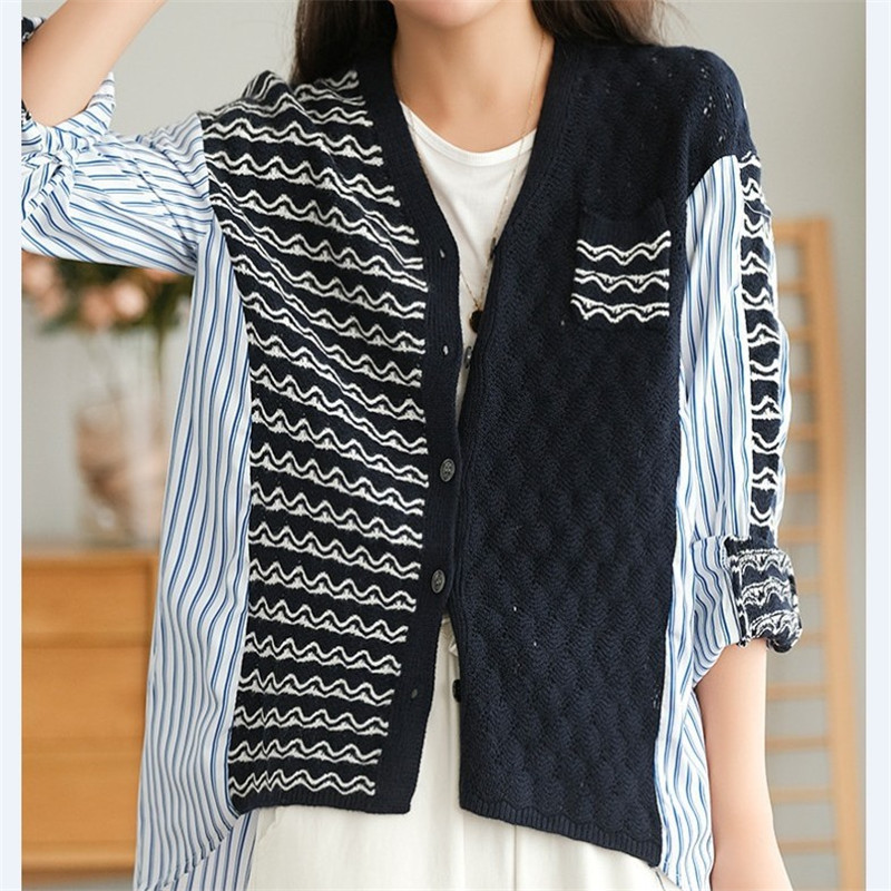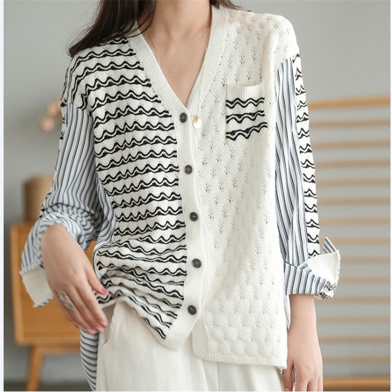 유럽풍 스트라이프 패치워크 긴팔 니트 스웨터 여성용 V넥 루즈핏 가디건 2025년 초가을 유럽 수입 여성복스토어 가기