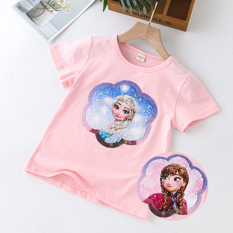 2024 여자 컬러 스팽글 티셔츠 어린 소녀 짧은 소매 재킷 여름 새 한국어 버전의 반소매 면화 머리카락스토어 가기