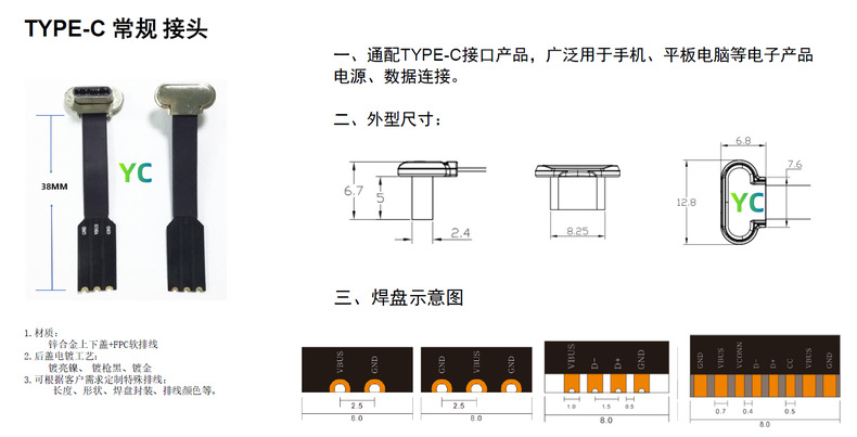 TYPE-C无线充电公头FPC软排线8PIN焊盘传连接器数据音频USB转接头