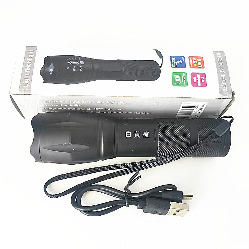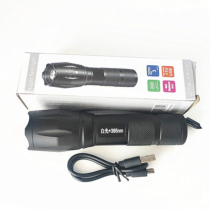亲,以上手电筒是铝合金内置充电锂电池手电筒,电池容量1200mah,手电筒灯光有395紫光或者用xpe灯珠白光+395紫光都有,手电筒有内置充电锂电池和外置锂电池2款,内置电池是每个光源档位都是一档,外置这款手电筒是一共4档,(白光3档(强光 弱光 闪光)395紫光一档强光),手电筒长12.4CM(拉伸后长13.5CM),头部宽3CM,尾部宽2.5CM,单个手电筒重115克左右,套装重193克左右,一件100套,重量21公斤左右,外箱尺寸54*34*48CM,谢谢您的光临!