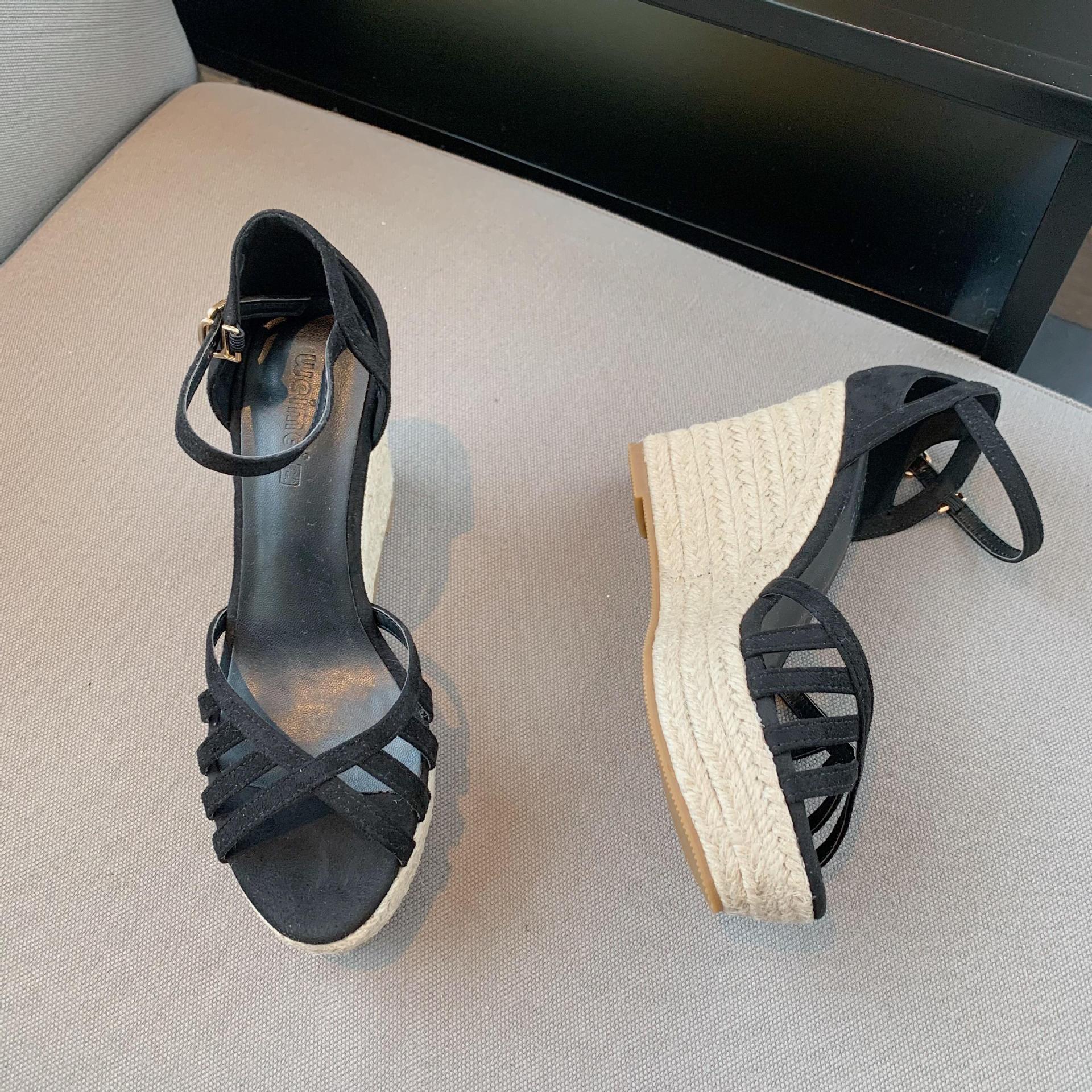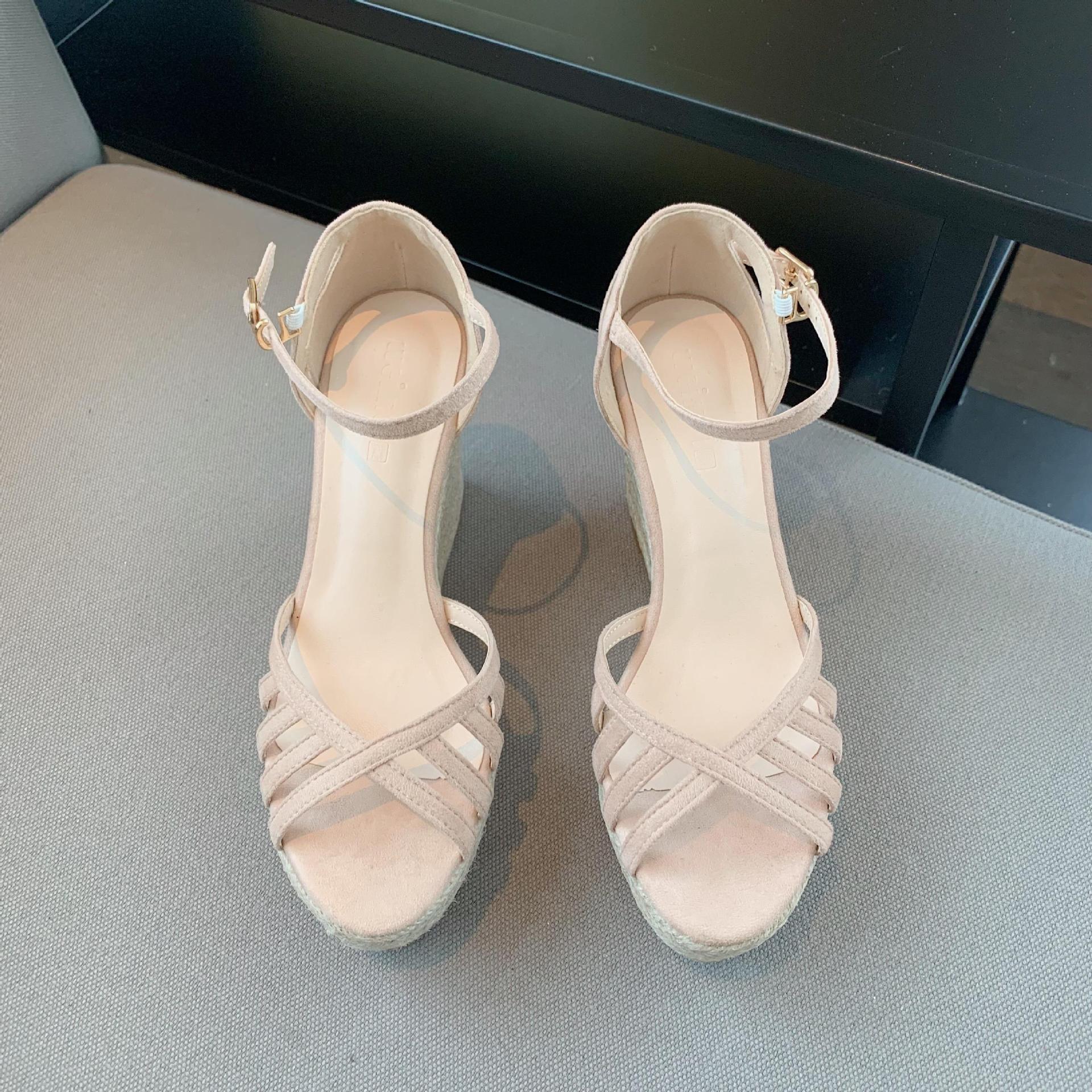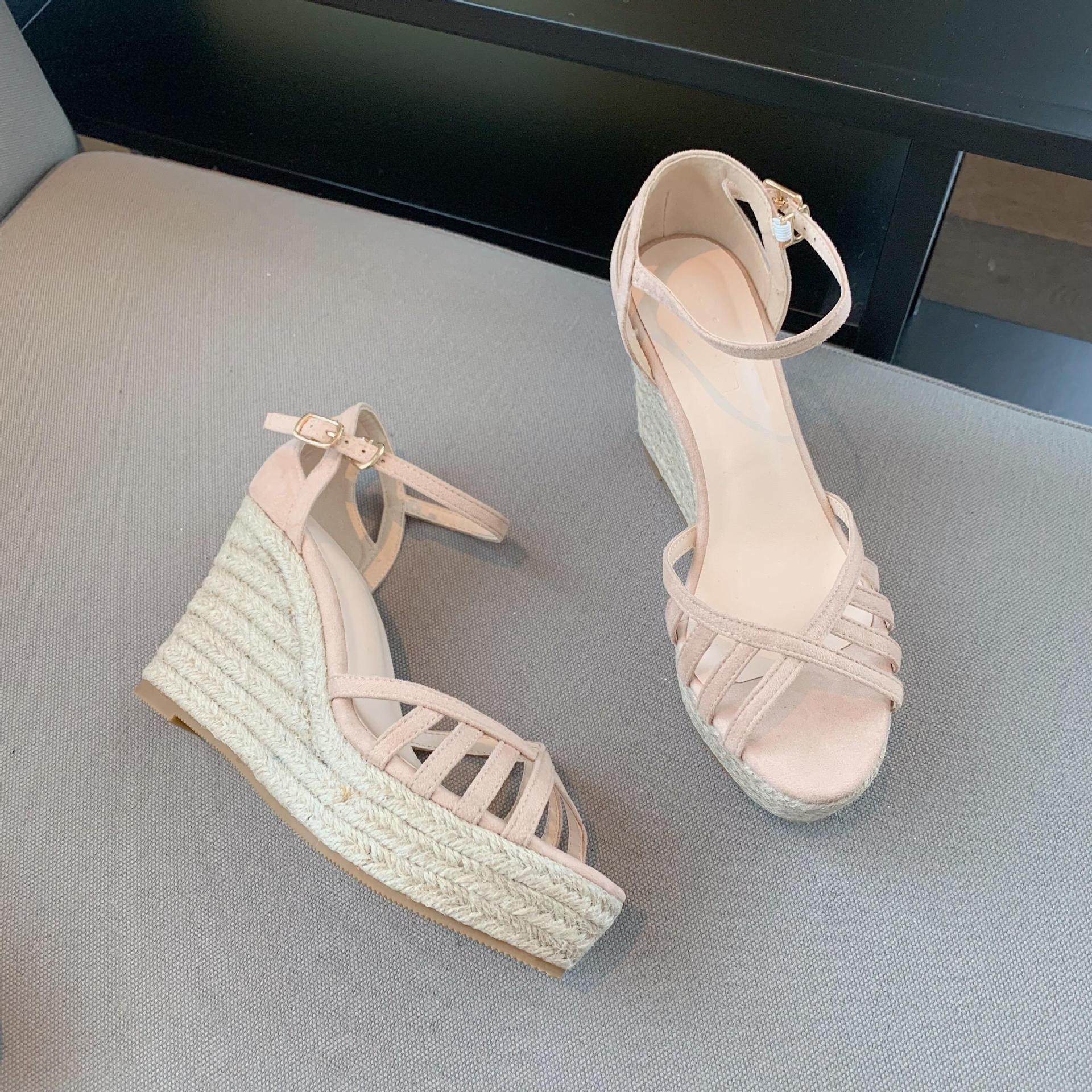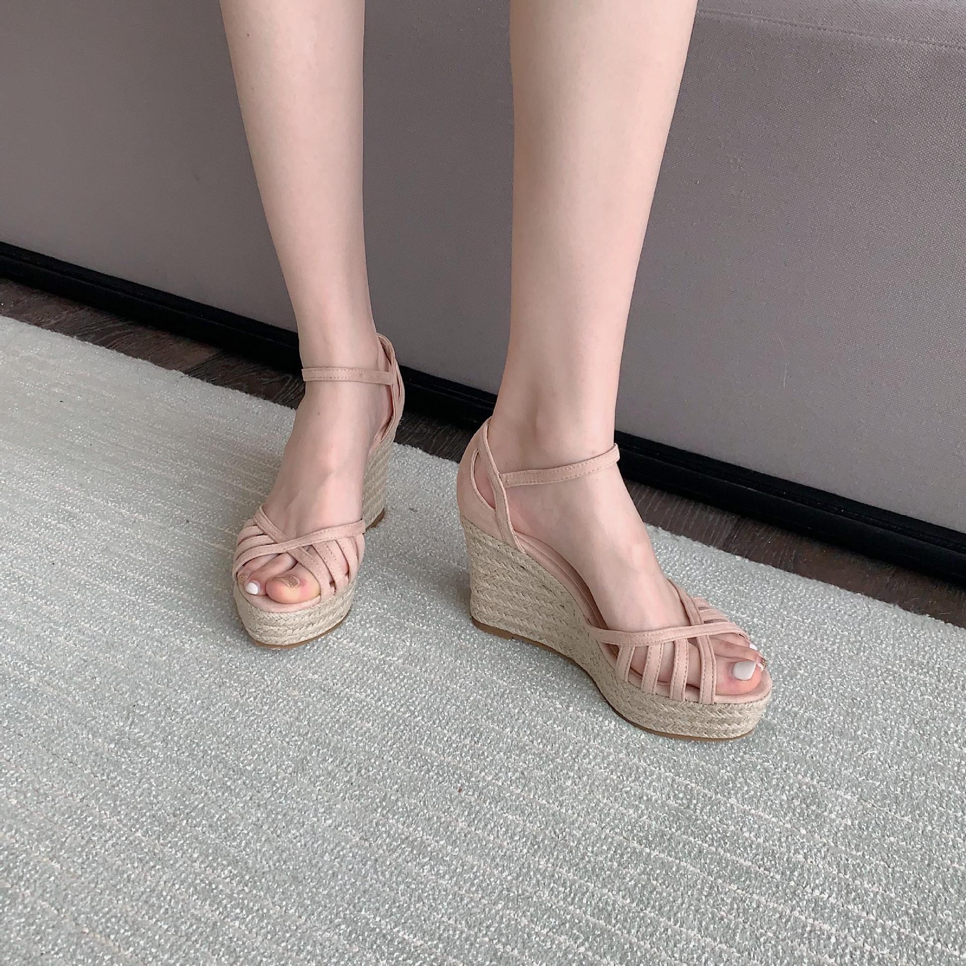 여성을위한 웨지 샌들 여름 새로운 대마 밧줄 밀짚 두꺼운 밑창 방수 플랫폼 한 단어 버클 스트랩 패션 하이힐 중공스토어 가기