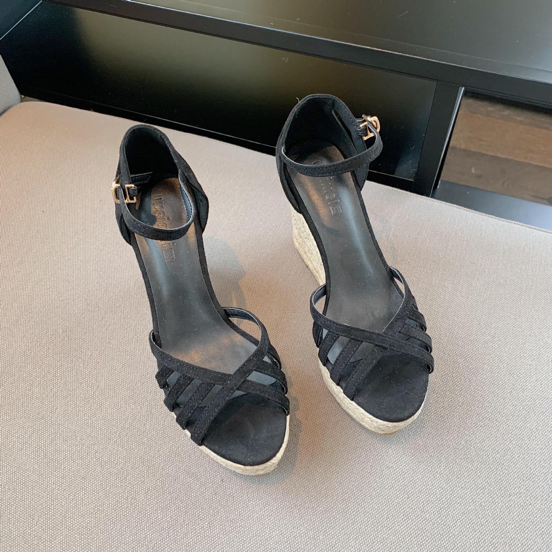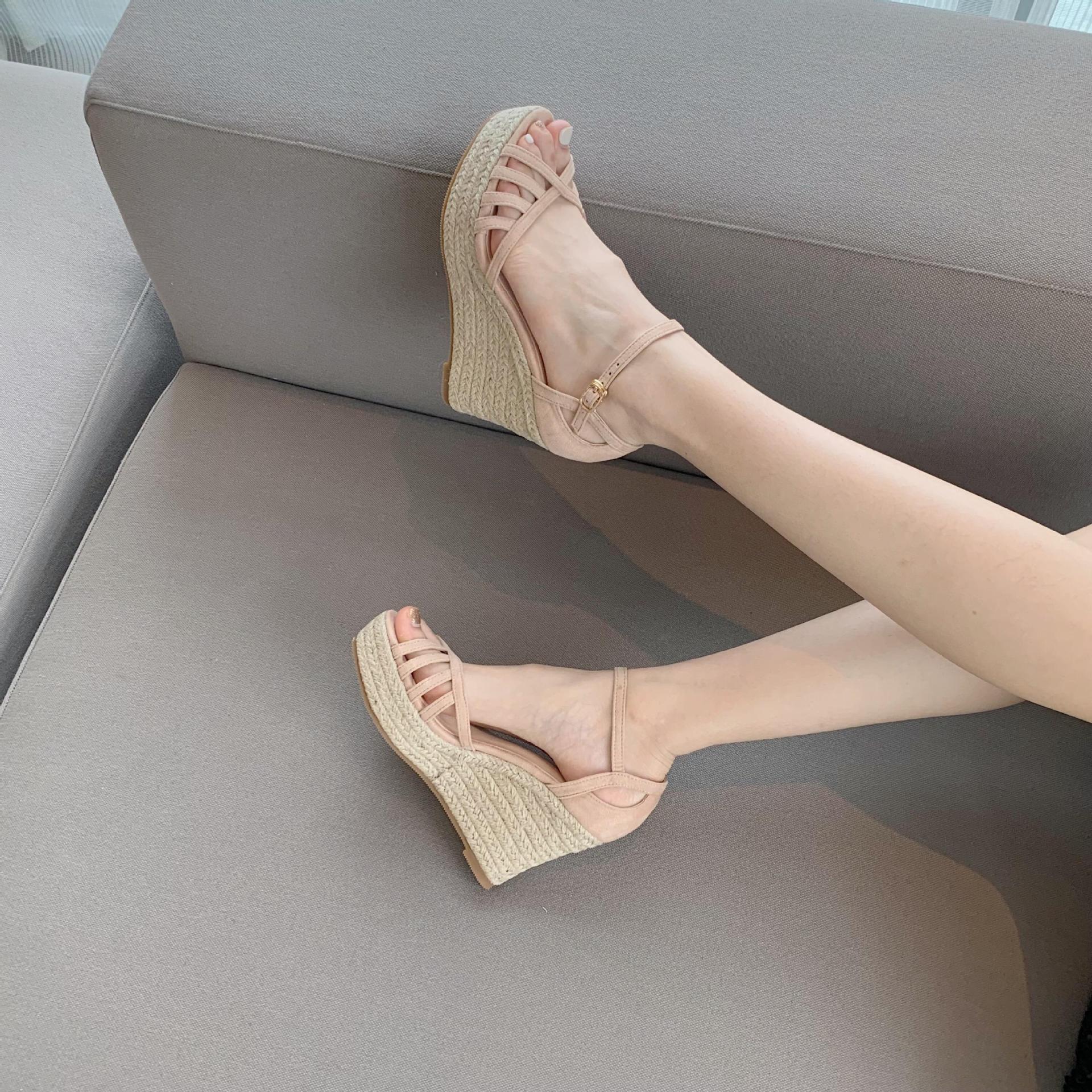 여성을위한 웨지 샌들 여름 새로운 대마 밧줄 밀짚 두꺼운 밑창 방수 플랫폼 한 단어 버클 스트랩 패션 하이힐 중공