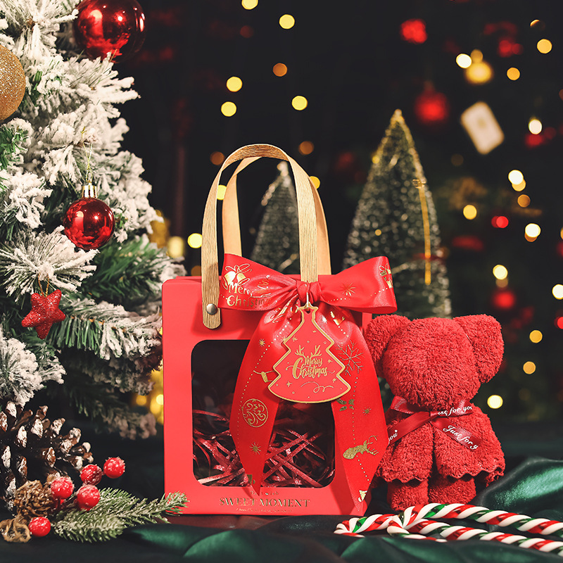 • 레드 + 크리스마스 레드 리본 + 라피아 + 크리스마스 레드 태그 + 수건 곰, 흰색 판지, 중간 크기(18*8.5*21cm)