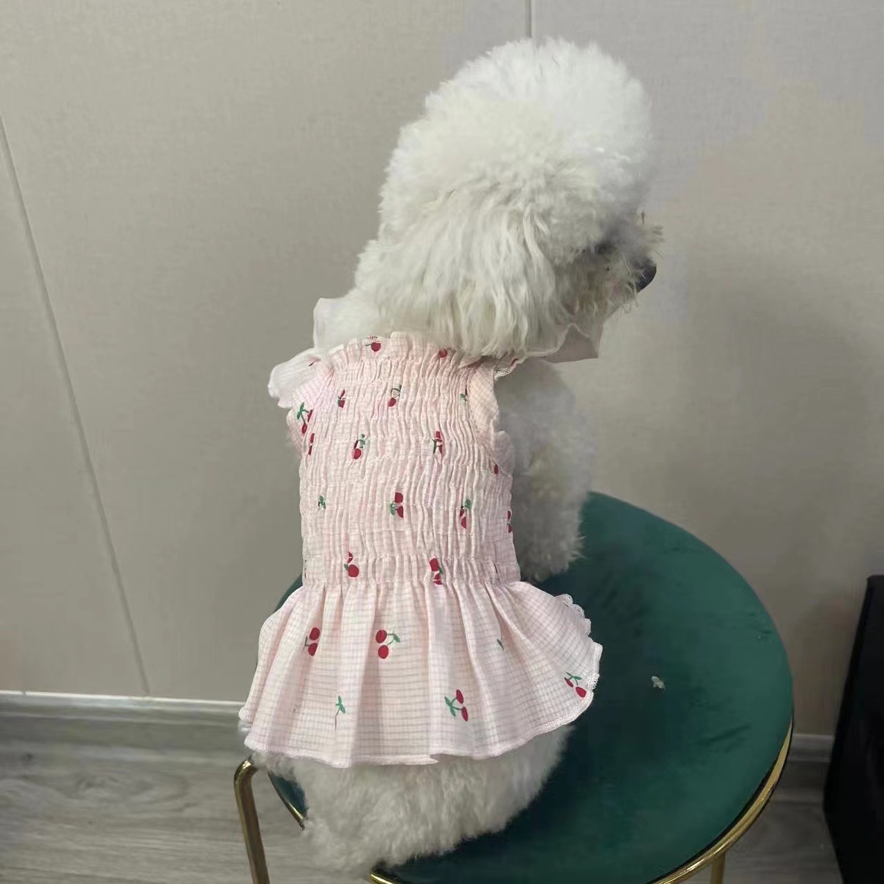체리 작은 격자 무늬 비행 슬리브 슬링 애완 동물 개 고양이 옷 반 길이 옷 쉬폰 달콤한 조끼