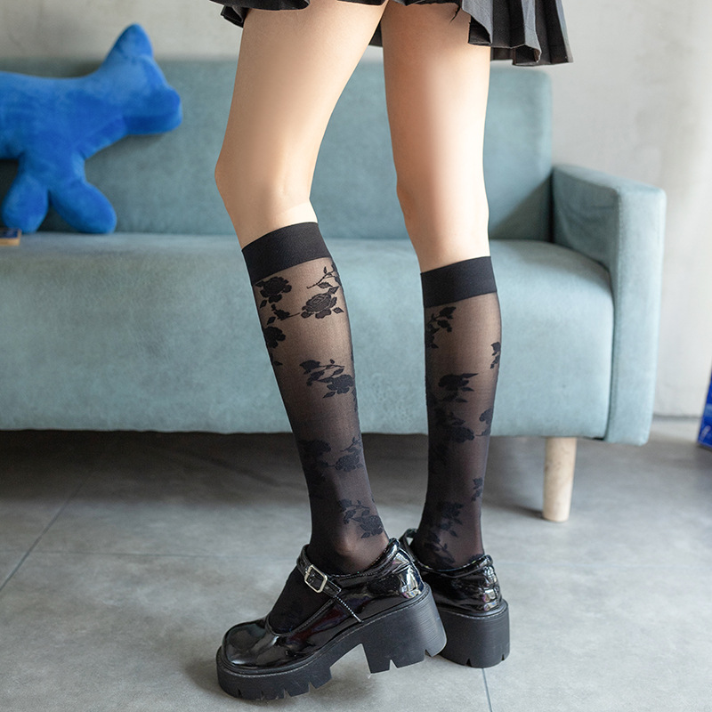 세나 양각 장미 꽃 중반 송아지 양말 초박형 스타킹 섹시한 패션 여성 무릎 길이 양말 3 차원