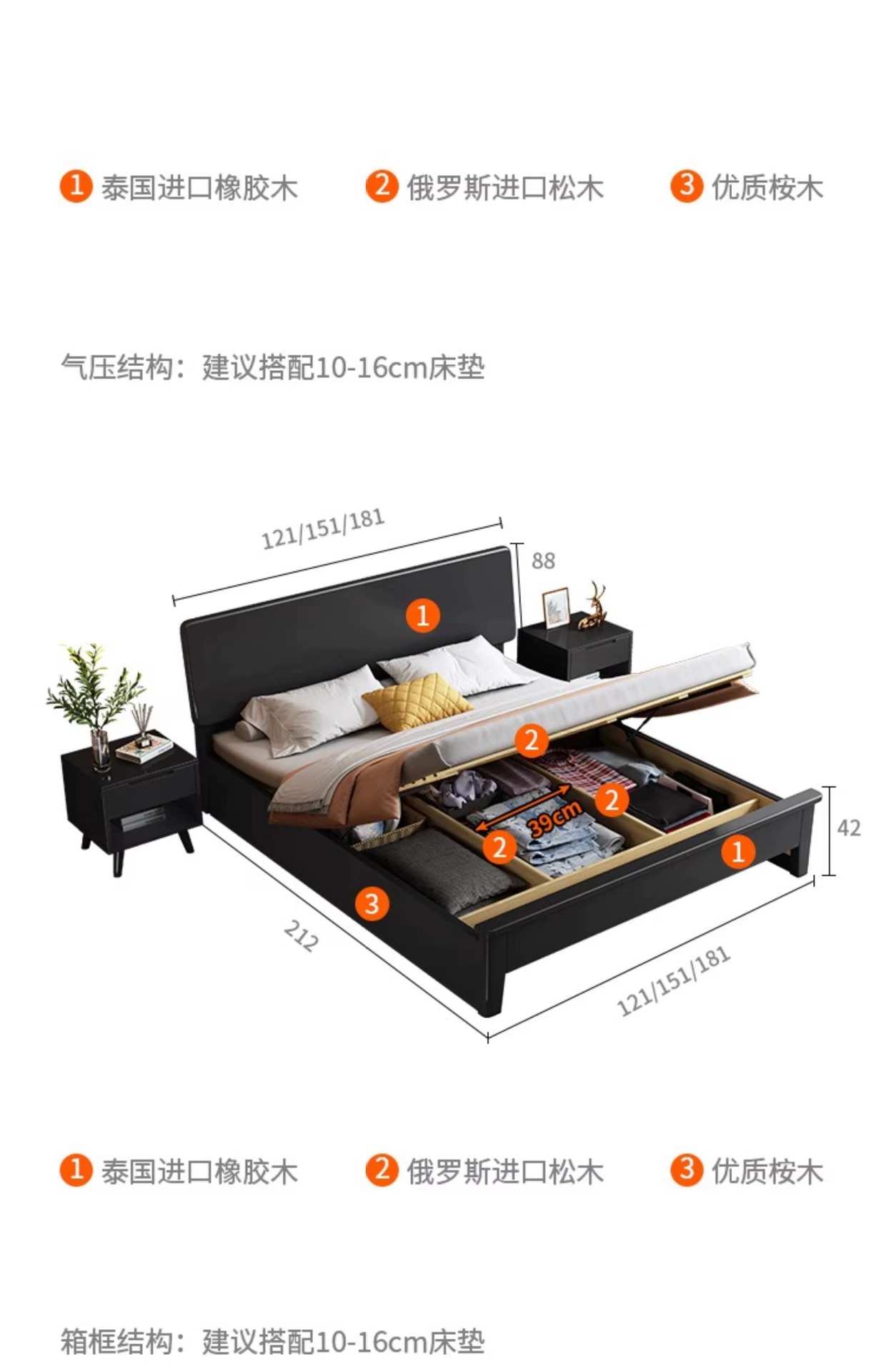 • 블랙 싱글 침대 + 20cm 라텍스 매트리스 + 침대 옆 탁자 * 1