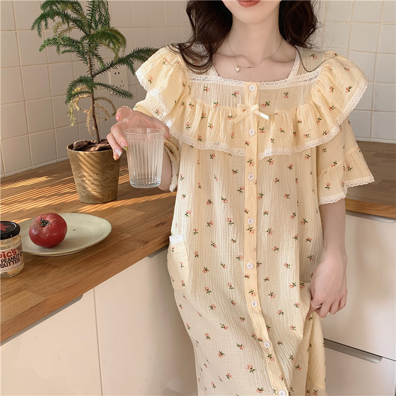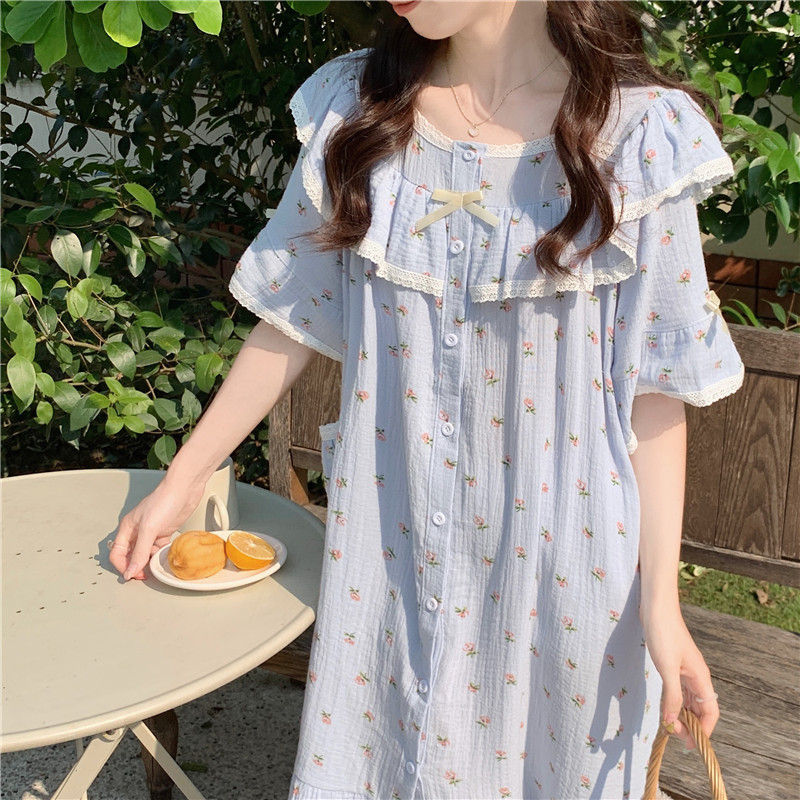 리얼 샷 2022 여름 달콤한 꽃 한국 스타일 레이스 프릴 느슨한 편안한 가정 옷 짧은 소매 잠옷 세트 여성을위한스토어 가기