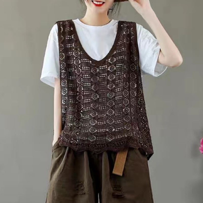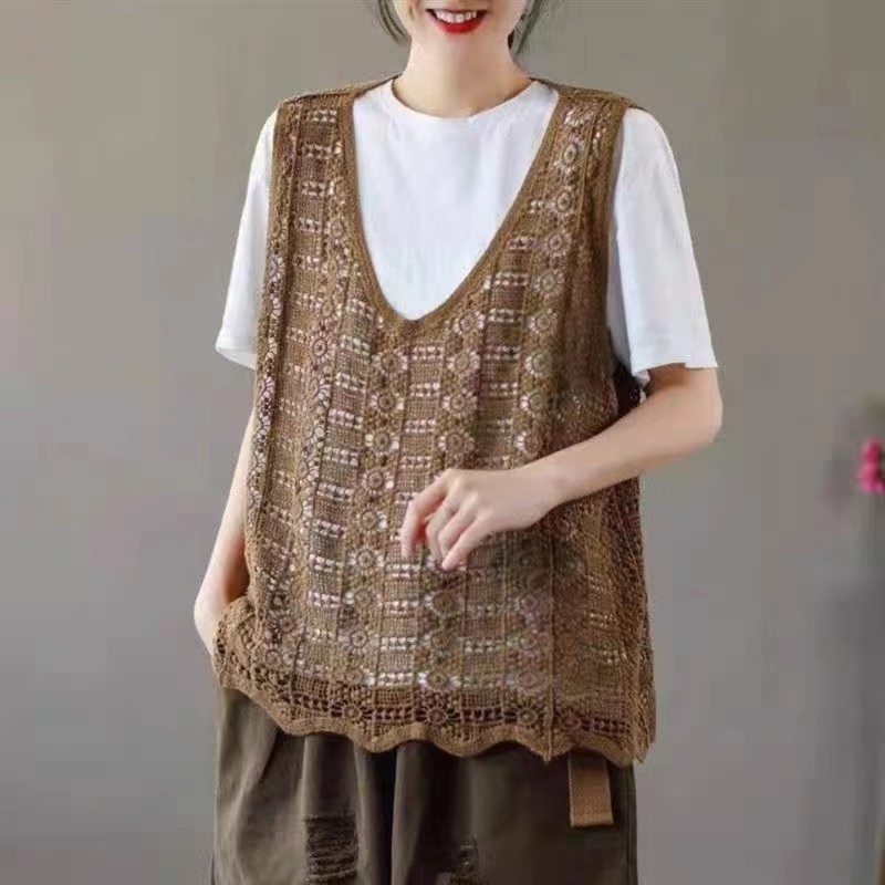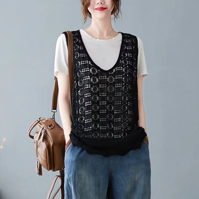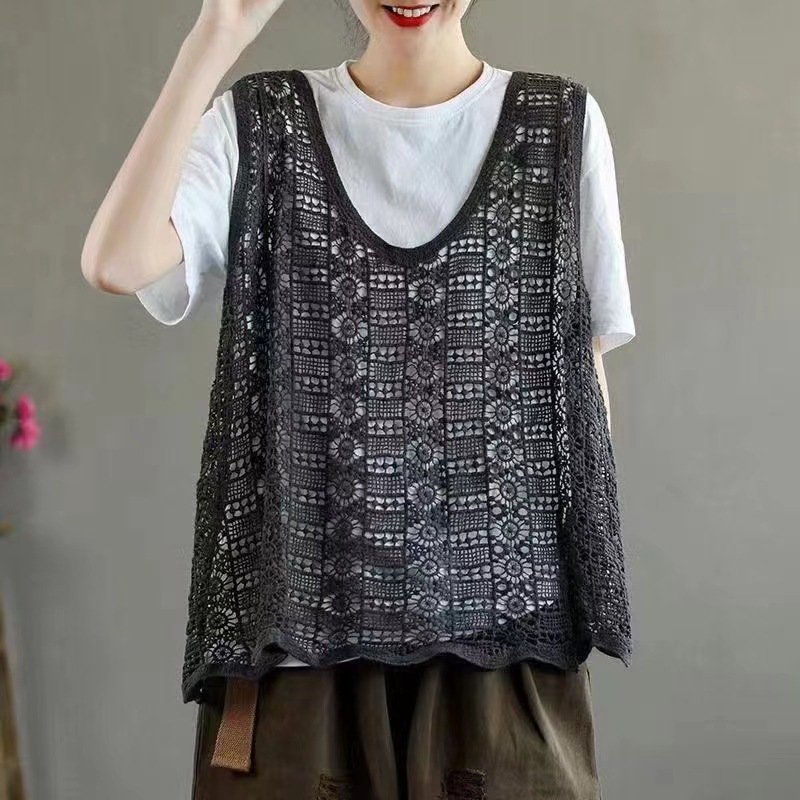 중공 니트 조끼 여성의 디자인 감각 복고풍 예술적 패션 캐주얼 외부 짠 면과 린넨 도트 메쉬 풀오버 탑스토어 가기