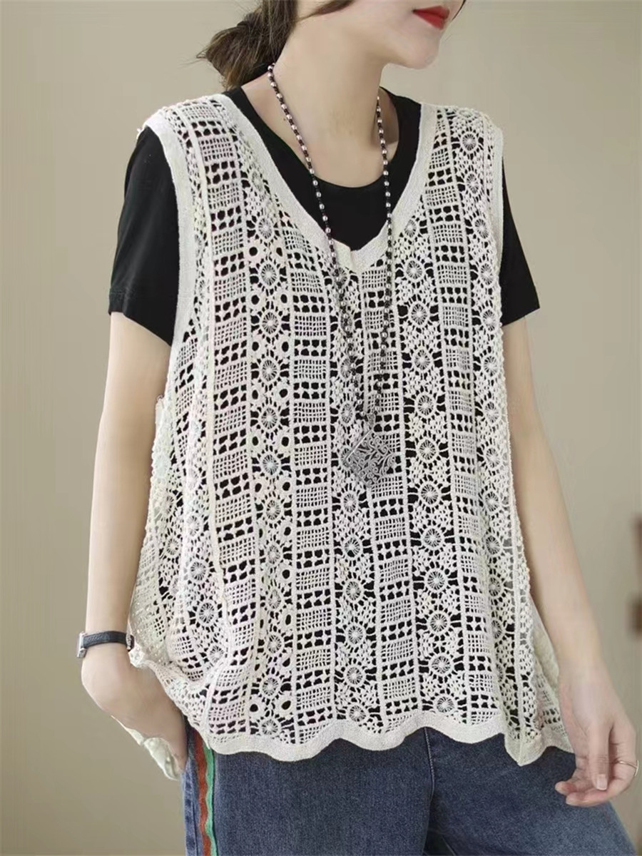 중공 니트 조끼 여성의 디자인 감각 복고풍 예술적 패션 캐주얼 외부 짠 면과 린넨 도트 메쉬 풀오버 탑