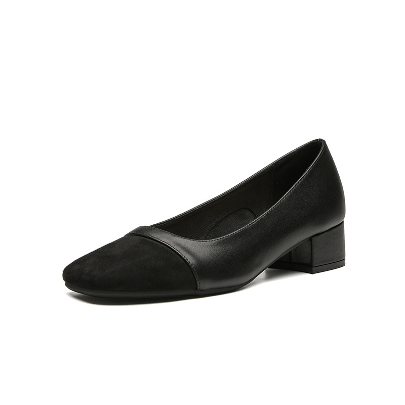 U5588 여성용 두꺼운 굽 싱글 슈즈, 광택 표면, 2025년 신상, 배색 사각 앞코, 3.CM 굽 높이, 캐주얼 인기 여성화스토어 가기