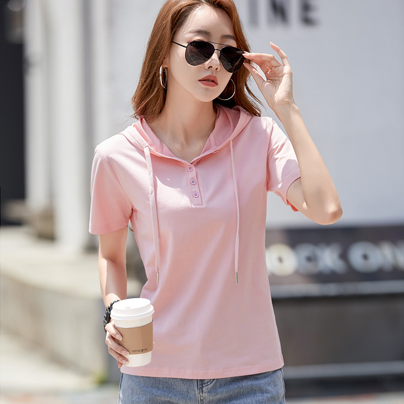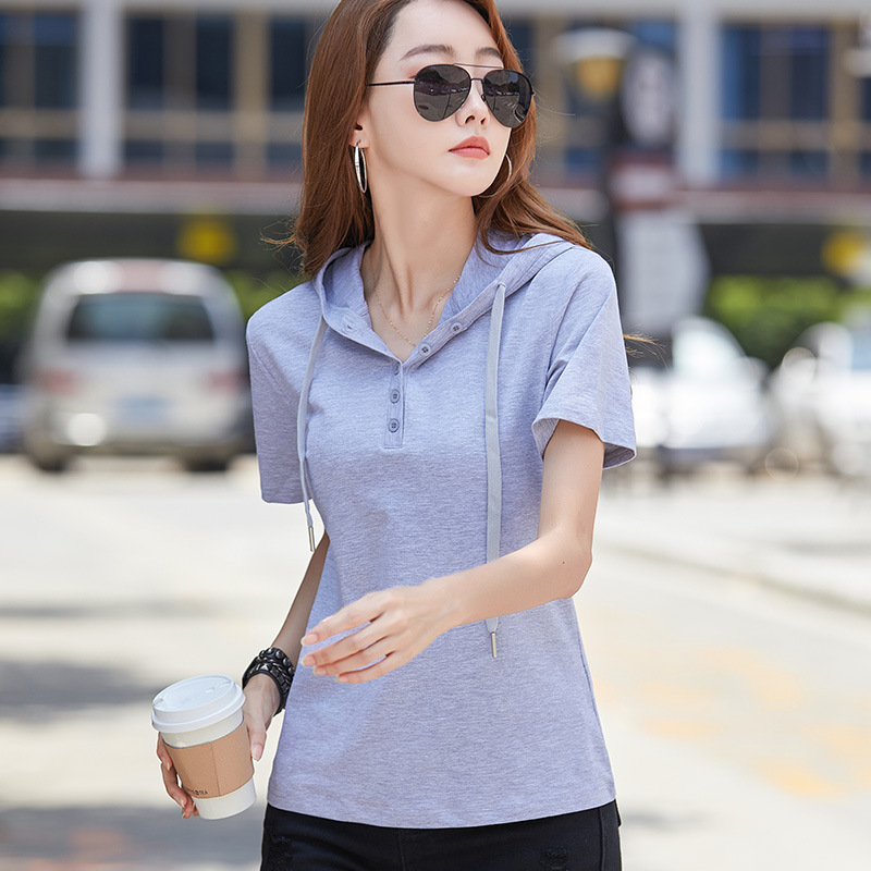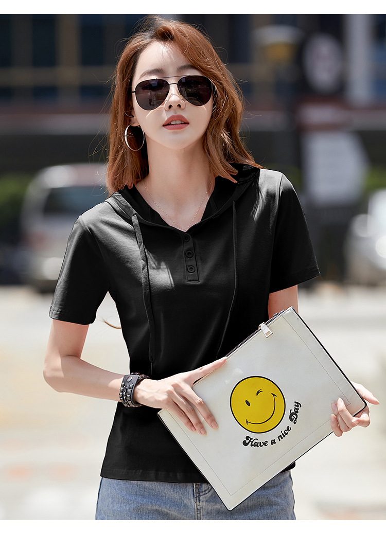 6699 면 후드 티셔츠 여성용 반팔 2022 여름 새로운 루즈한 캐주얼 슬림핏 솔리드 컬러 올매치 탑